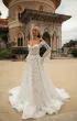 A princess-style wedding gown with a corset bodice and a layered skirt with a sweeping train. The semi-sheer corset with push-up cups is adorned with eco-silk, shimmering tulle, and lace, while velvet ribbons emphasize the structured lines. The skirt is crafted from lightweight eco-silk with voluminous layers of glittering tulle, finished with a lace overlay that mirrors the bodice. The look can be transformed with detachable lace sleeves or airy wings made of blush-toned tulle and lace for a more romantic effect. Customization options: ivory lining; open lace-up back.