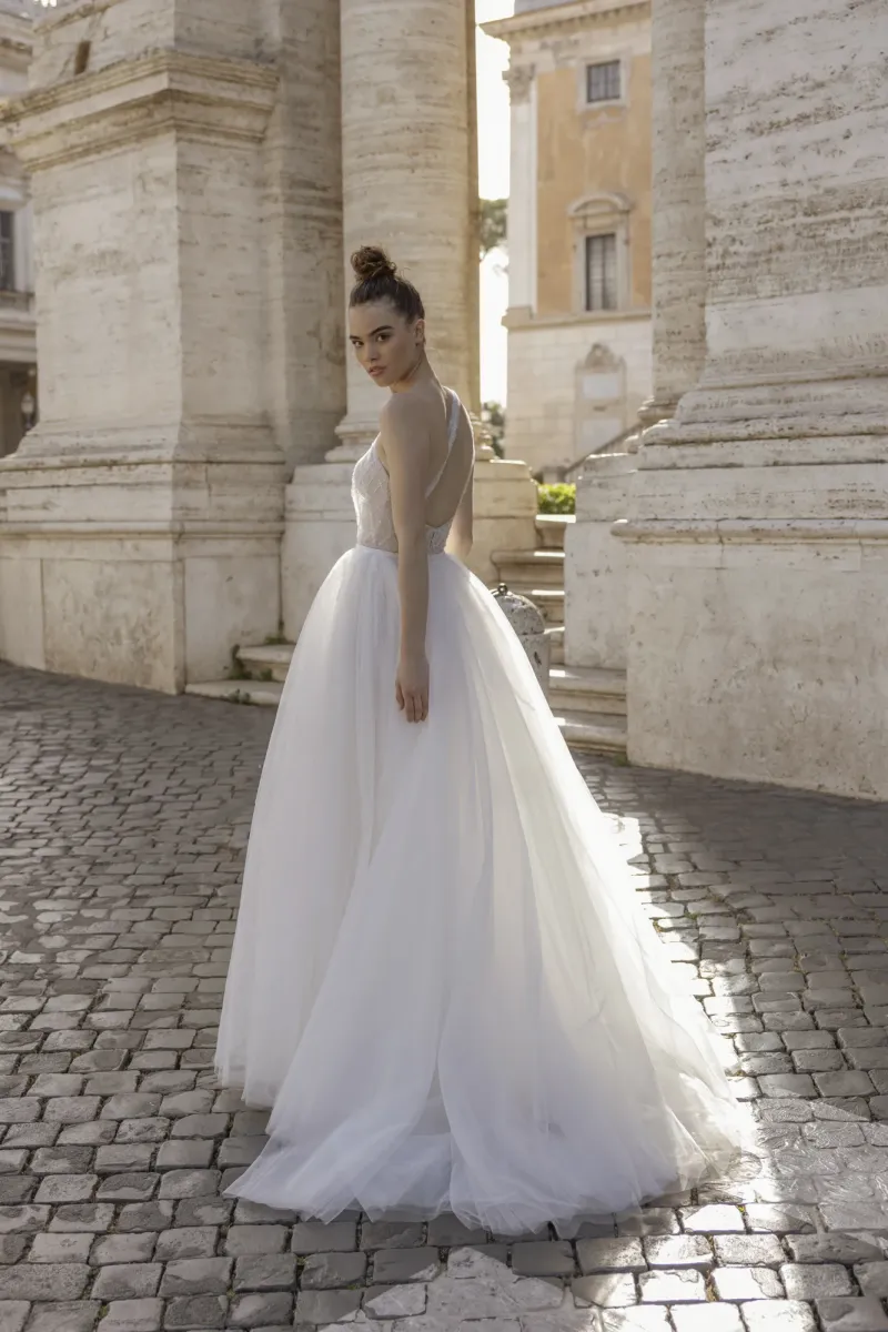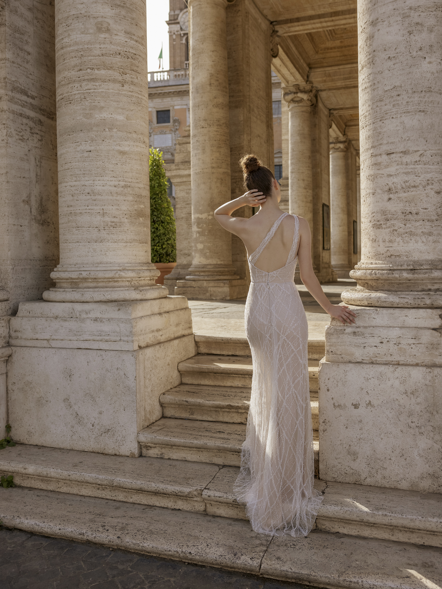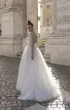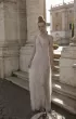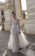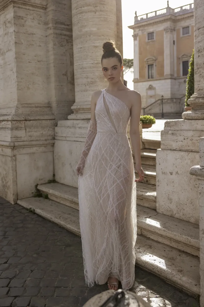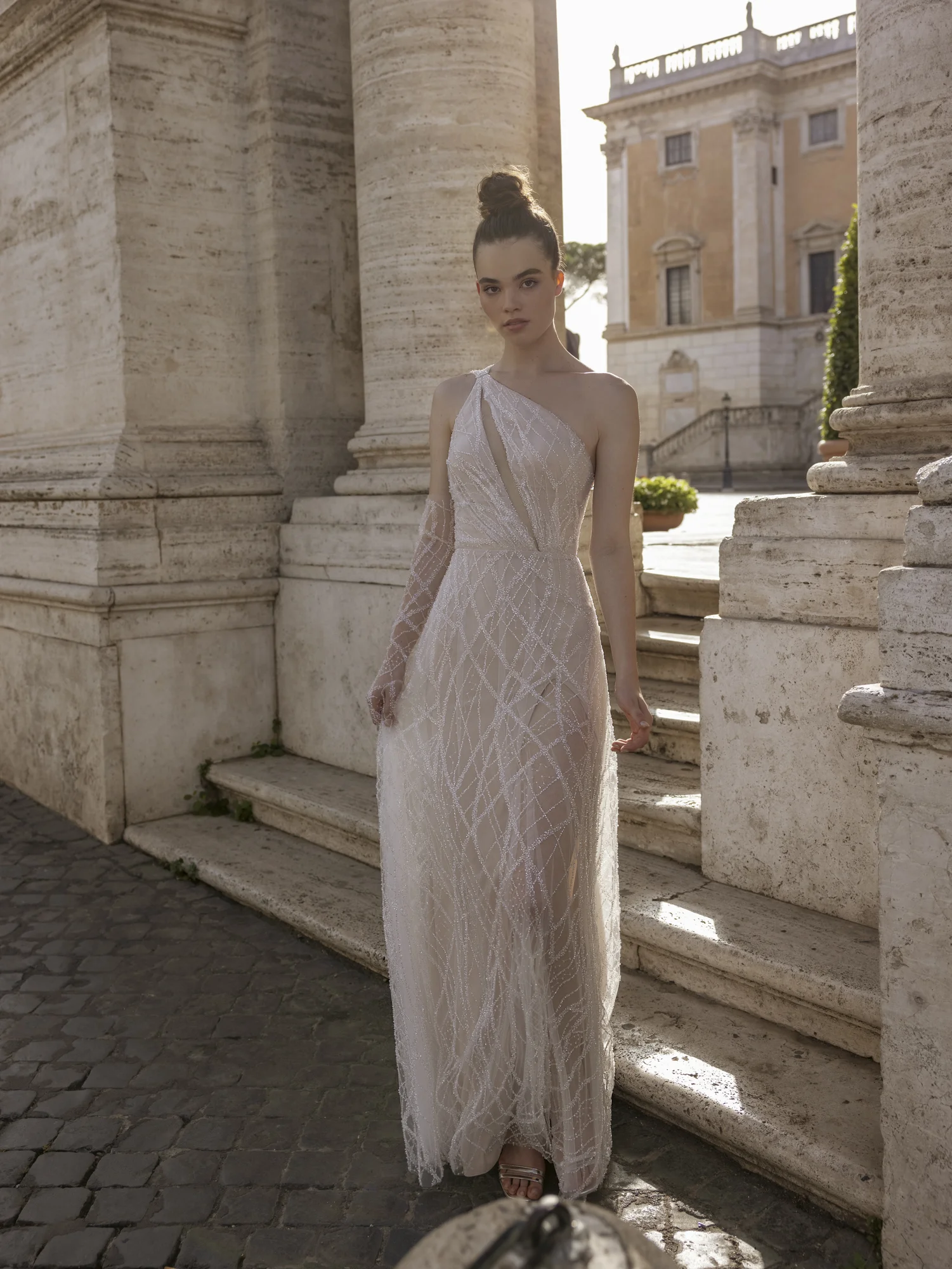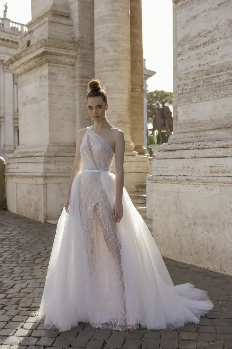 Fitted silhouette wedding dress. The bodice is asymmetrical with shape-forming reliefs. Fastening on the back with hooks. The underskirt layer have a slit on the left side. The upper layer of the skirt is beaded. The image is complemented by a detachable skirt with a small train.