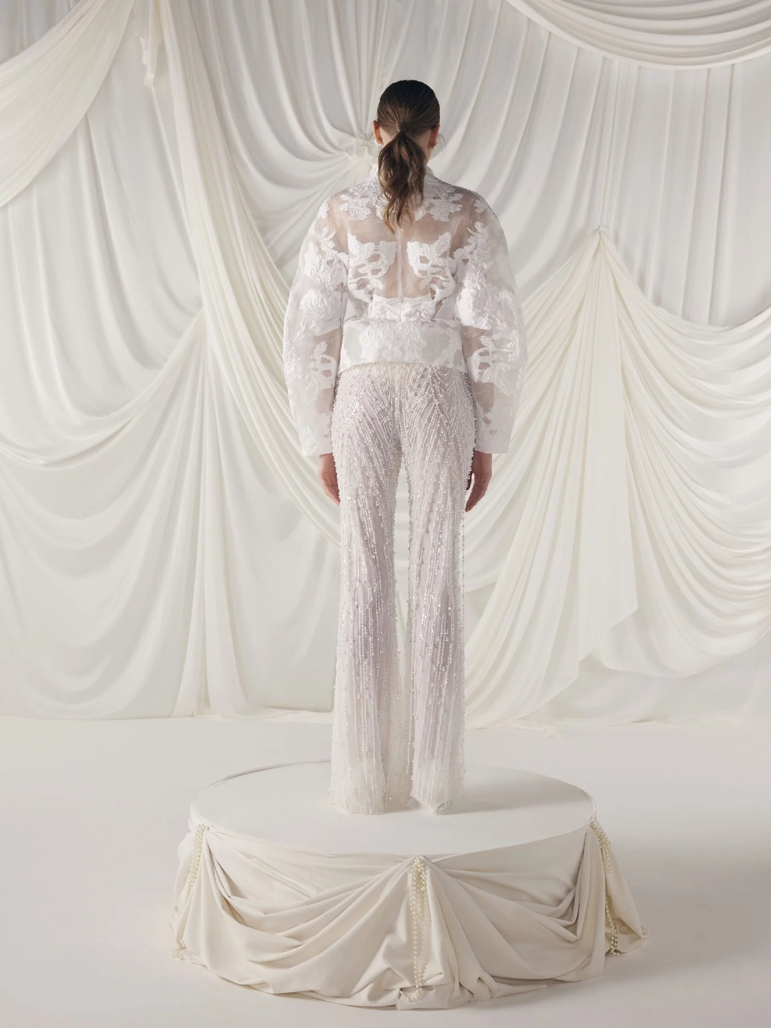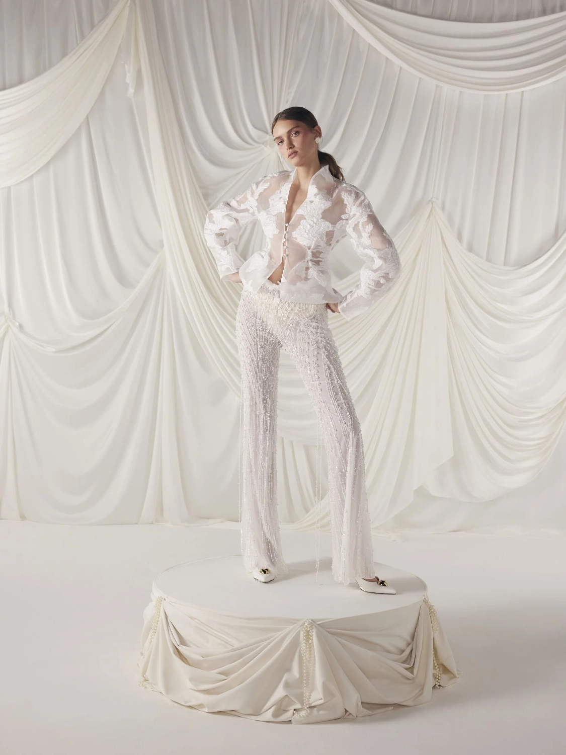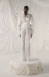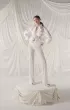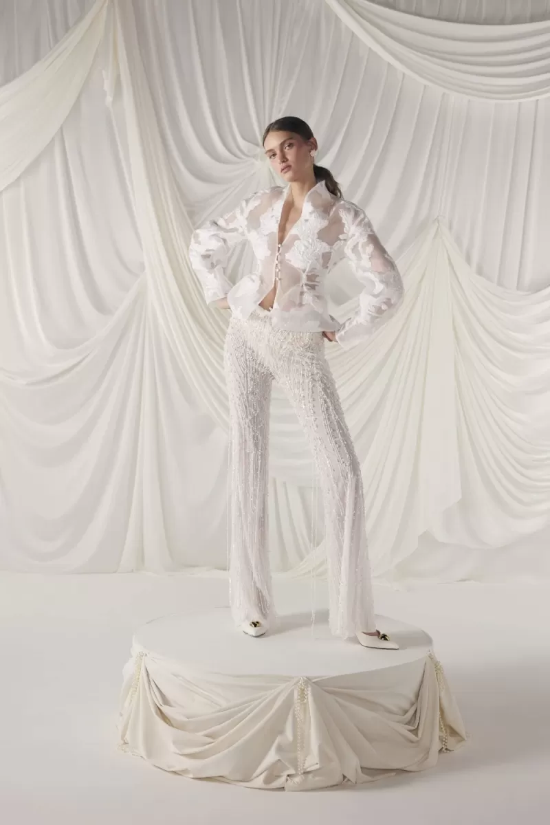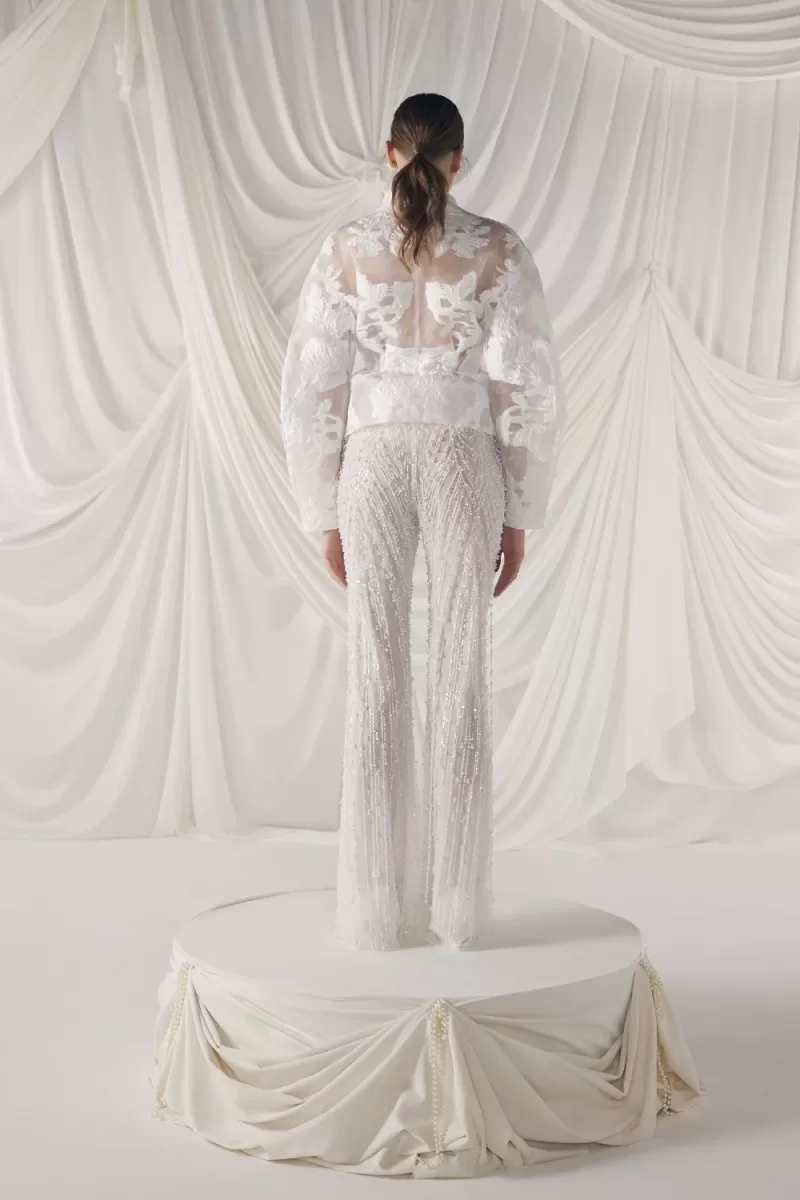 An elegant wedding suit made of a translucent jacket and flared trousers made of organza with a jacquard pattern. The fitted jacket is buttoned, and the trousers are decorated with a taffeta frill and pearl threads. The trousers have a shaped waistline, creating an elegant silhouette.