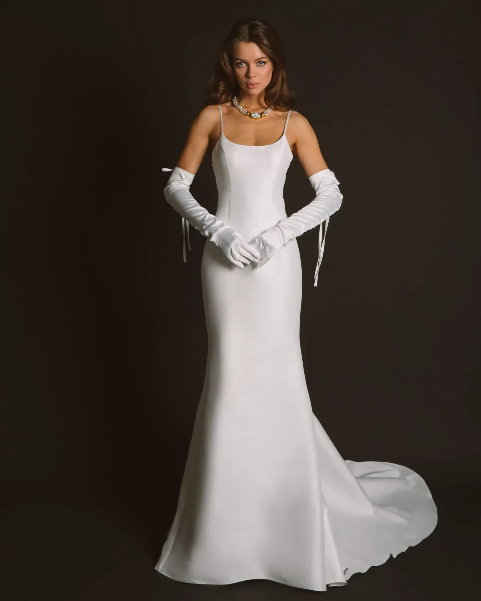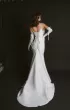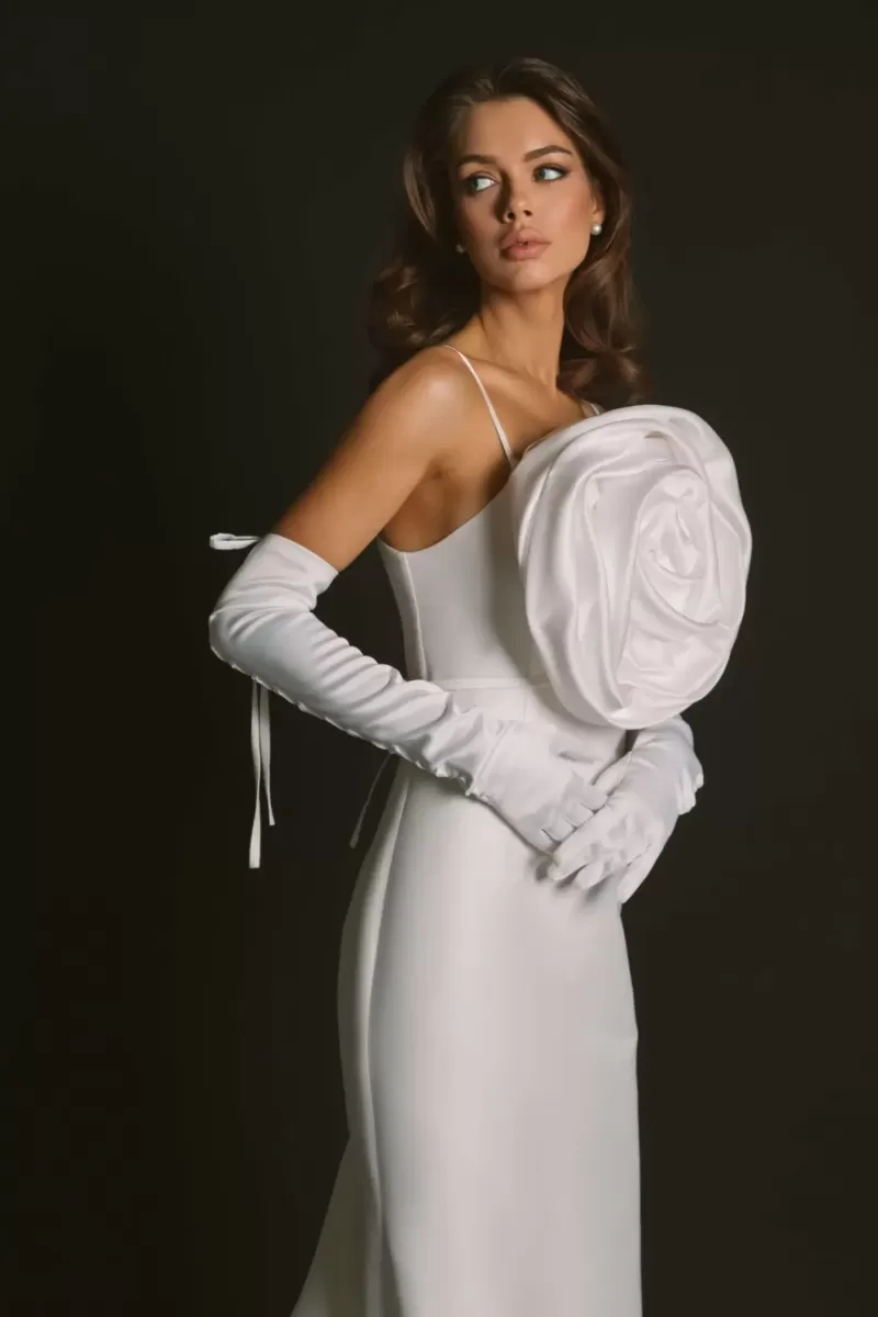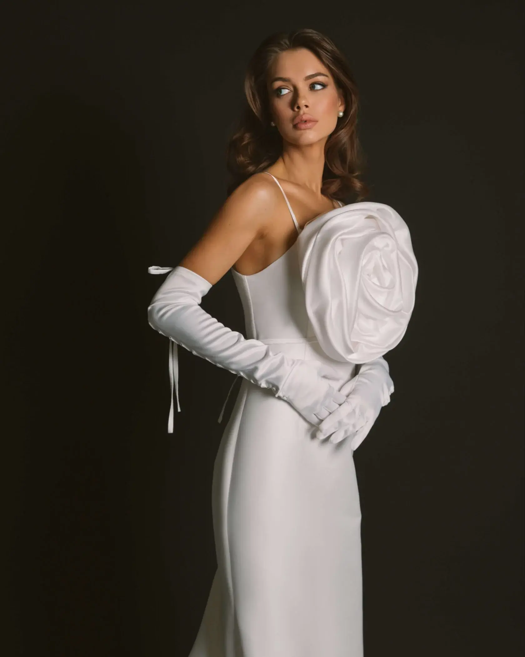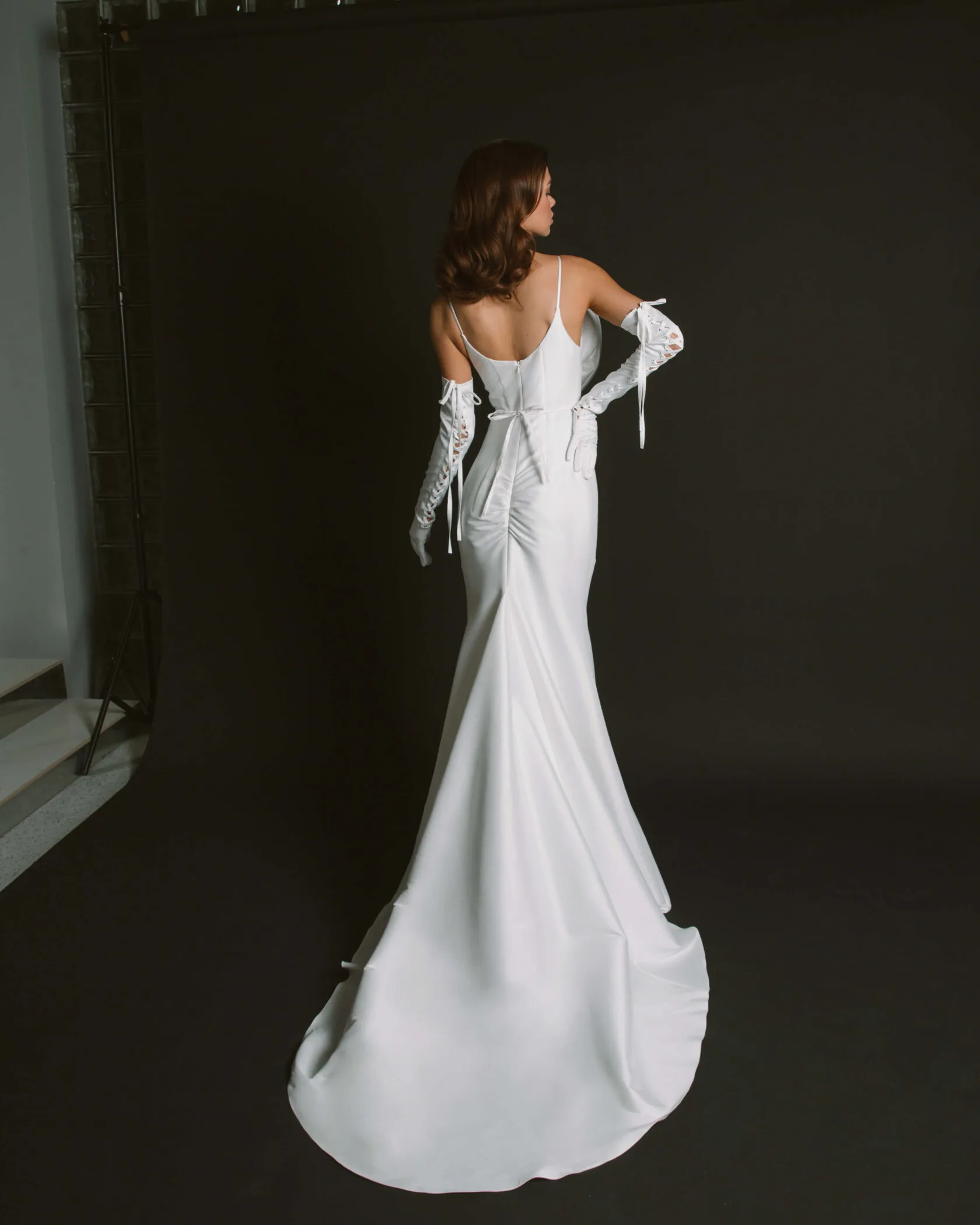 Wedding dress with thin straps. The dress has a long train. The removable flower is made of satin fabric and is attached to the straps of the dress. Can be made without flower.