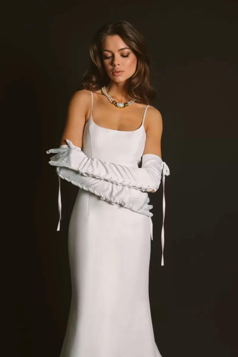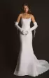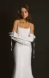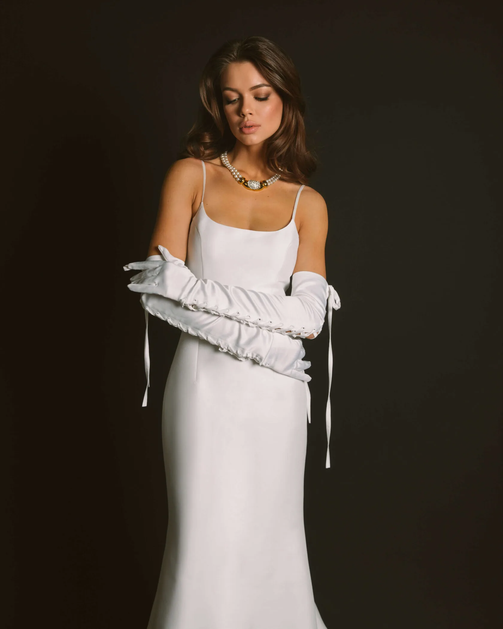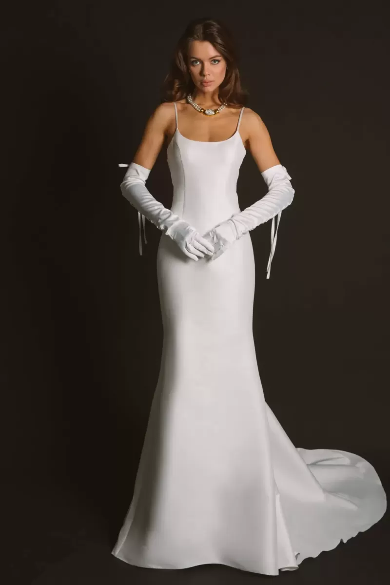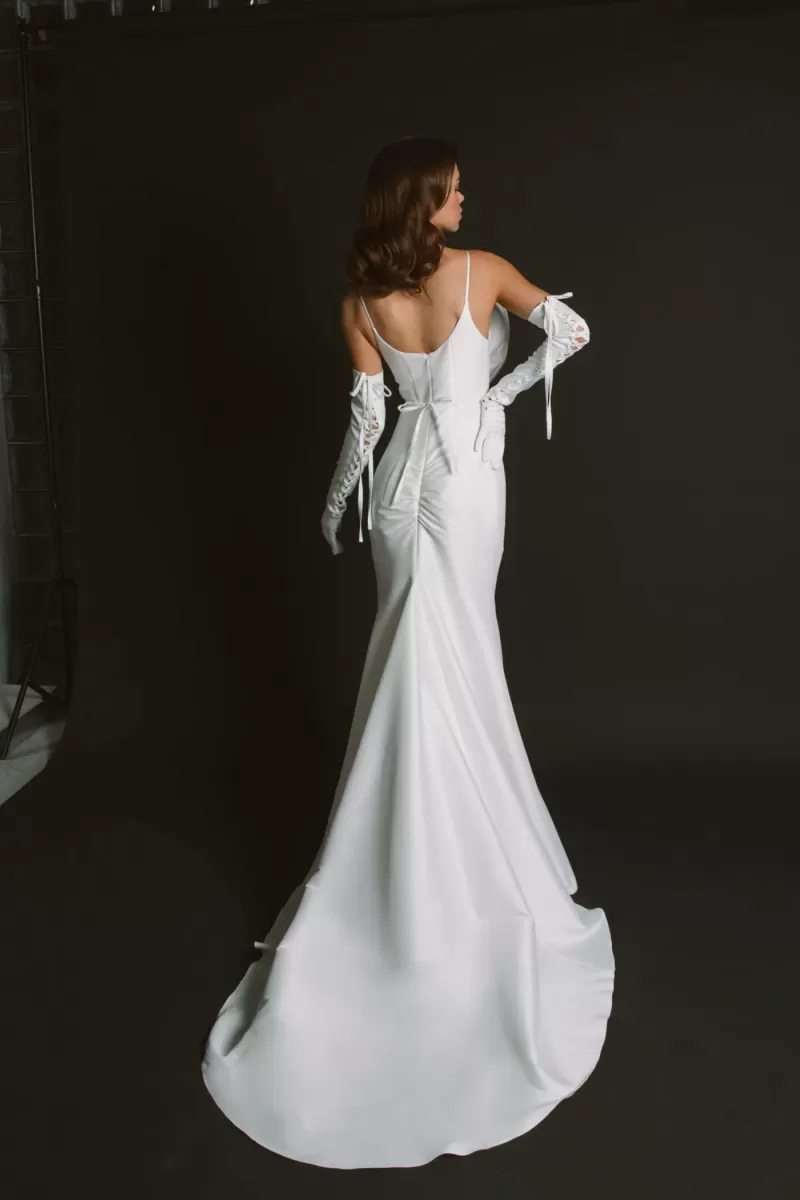 Wedding dress with thin straps. The dress has a long train. The removable flower is made of satin fabric and is attached to the straps of the dress. Can be made without flower.
