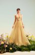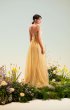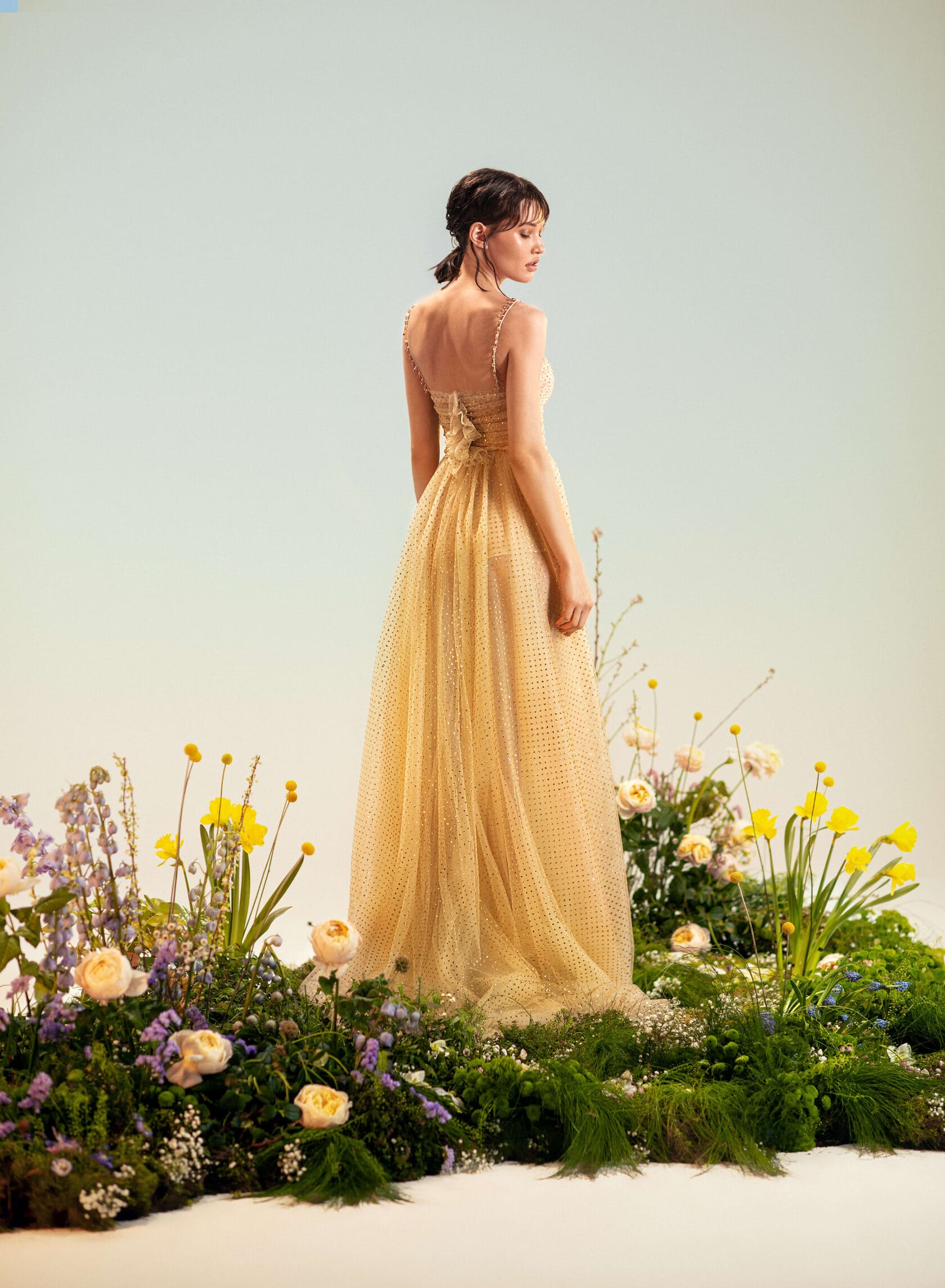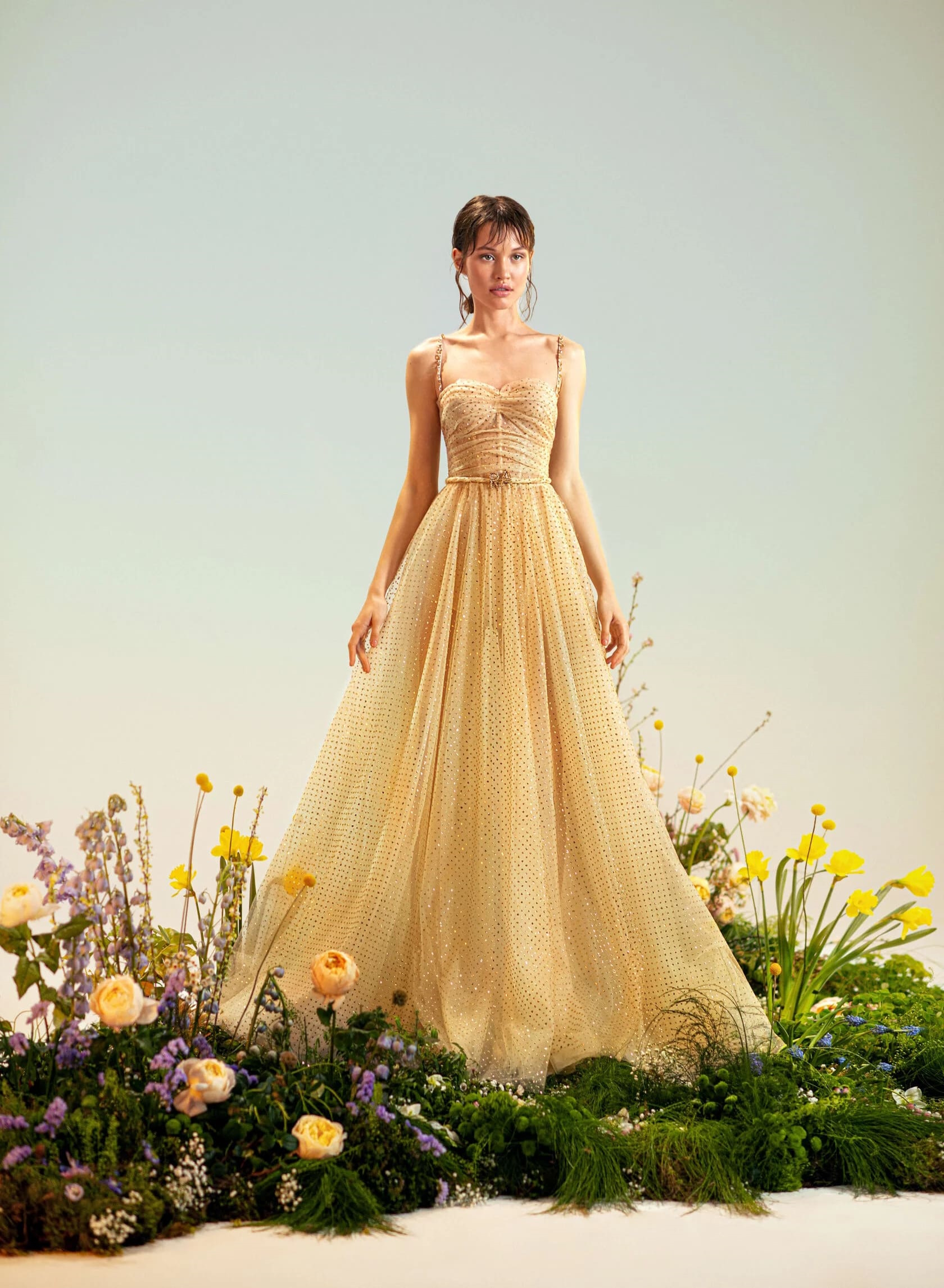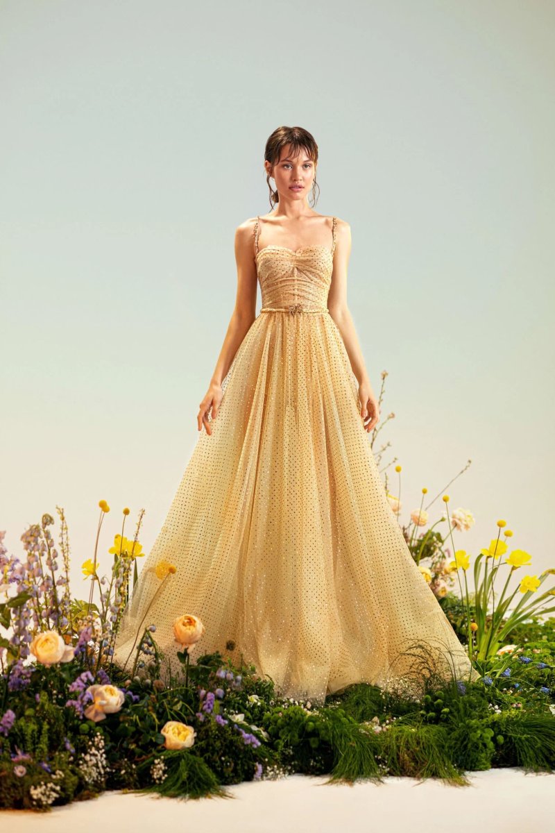 A-line dress with inner corset. The corset is soft and semi-transparent in the shape of a "heart" with thin straps. On the front, the drapery gracefully emphasizes the chest, the drapery smoothly passes to the back and ends with a ruffle. The straps are embroidered by hand with hanging crystals that sparkle like dew drops. The waist is accentuated by a thin hand-woven "RA" signature belt. The skirt is multi-layered moderately fluffy with sparkling shine.