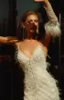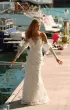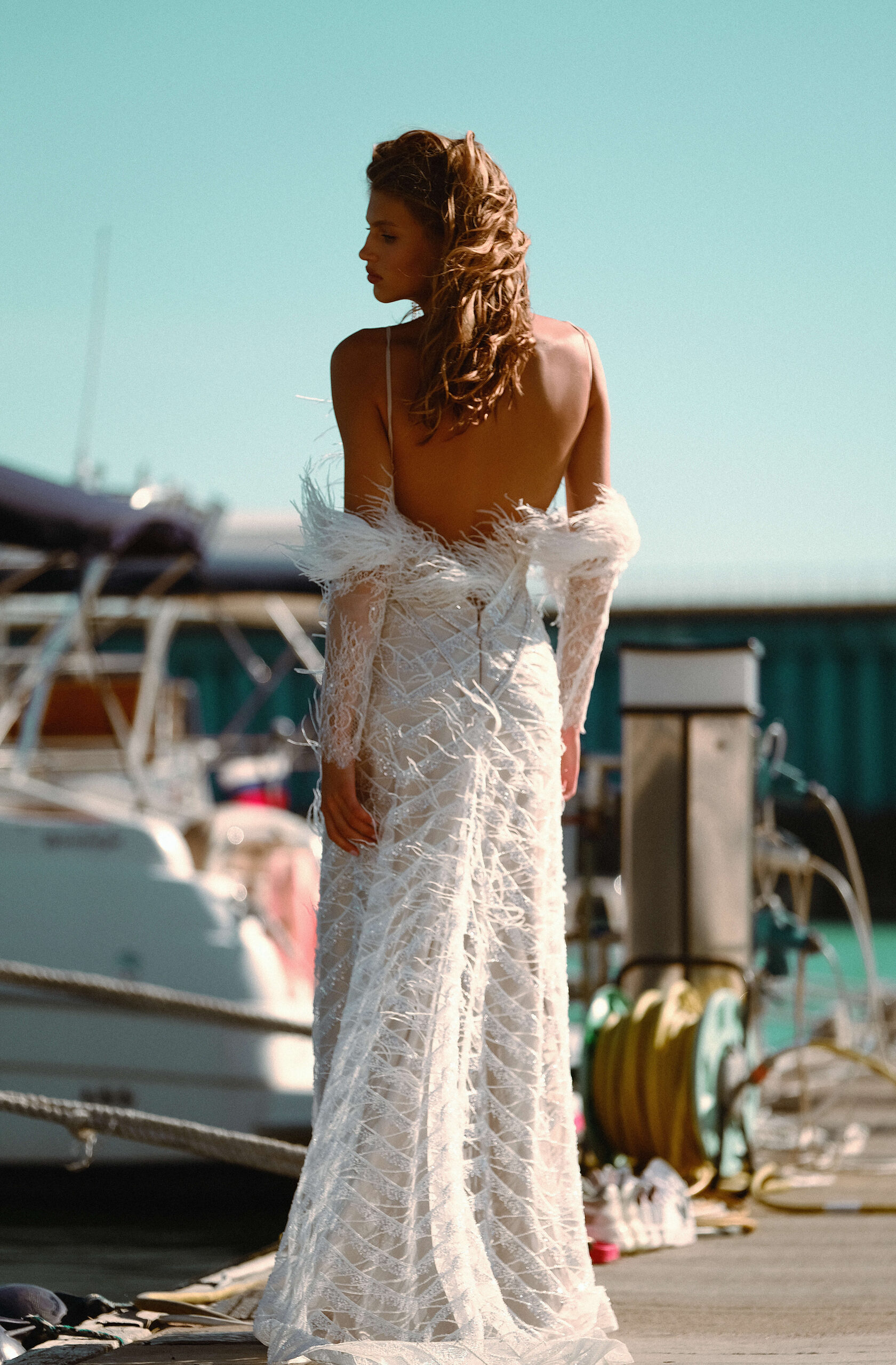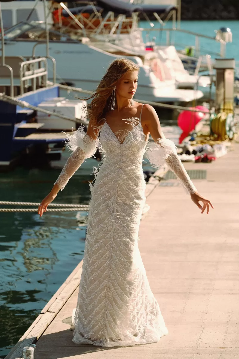Fabulous wedding dress with V-neckline. The dress is decorated with lace and feathers. The back of the dress is open and decorated with feathers.