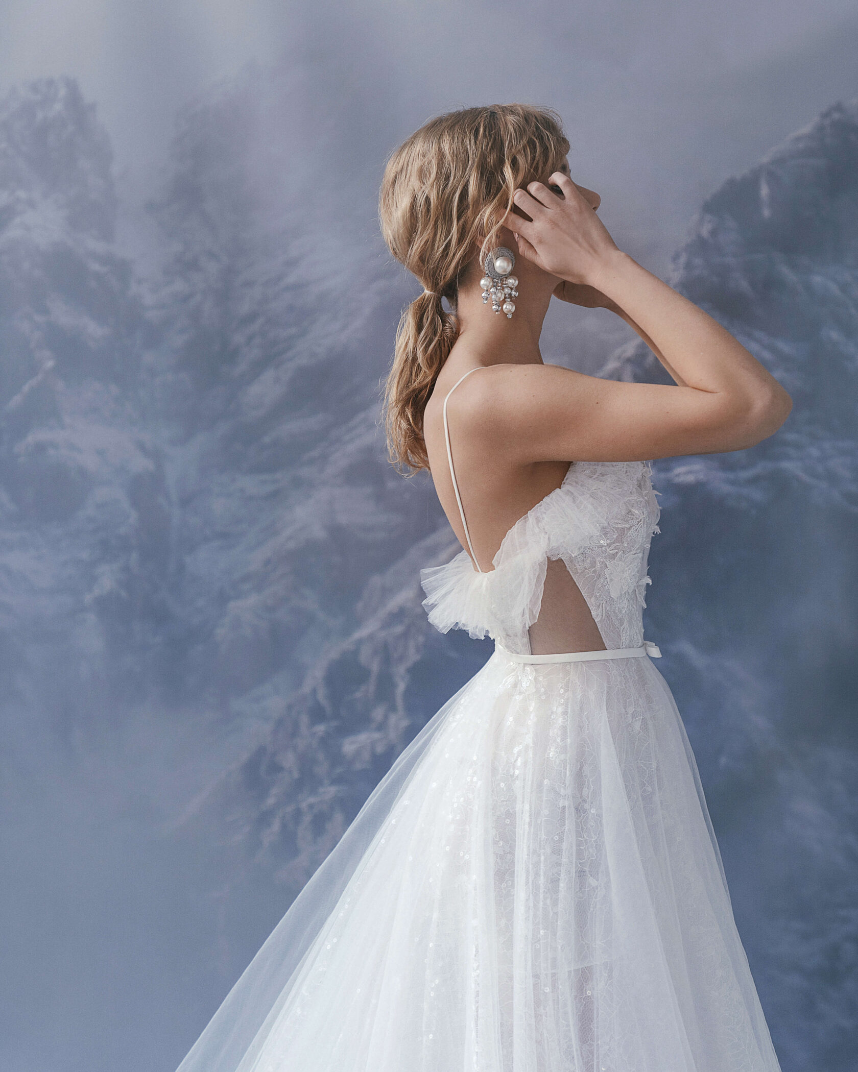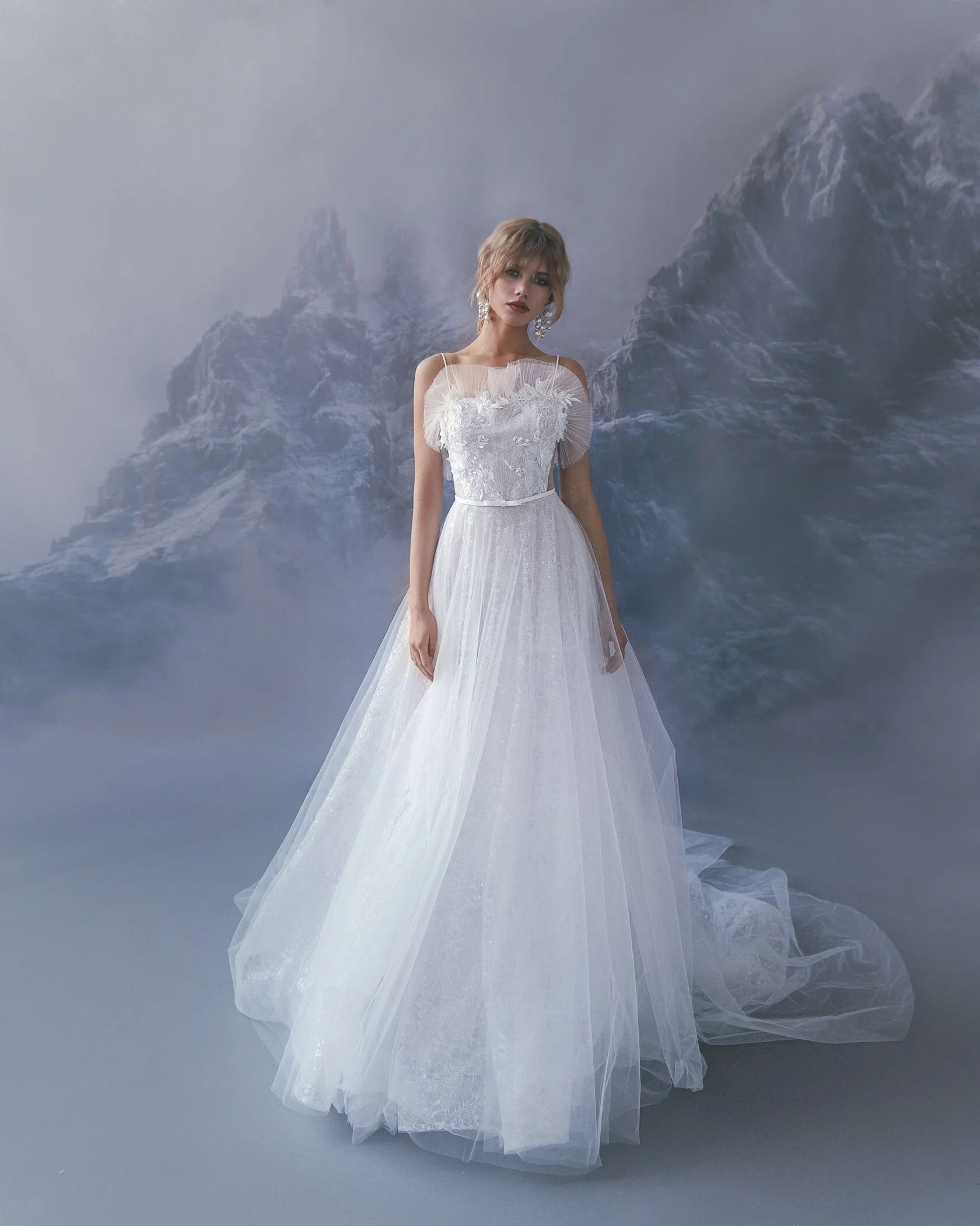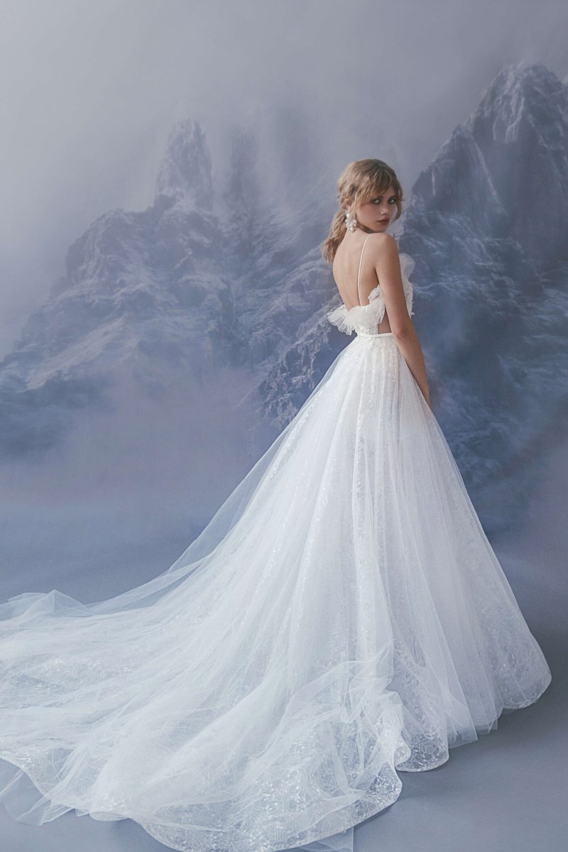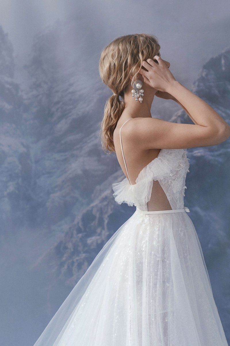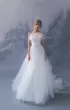 A-silhouette wedding dress. The waist is accentuated by a belt with a bow. The corset is decorated with drapery and elements in the form of voluminous branches with flowers. The skirt has a train.