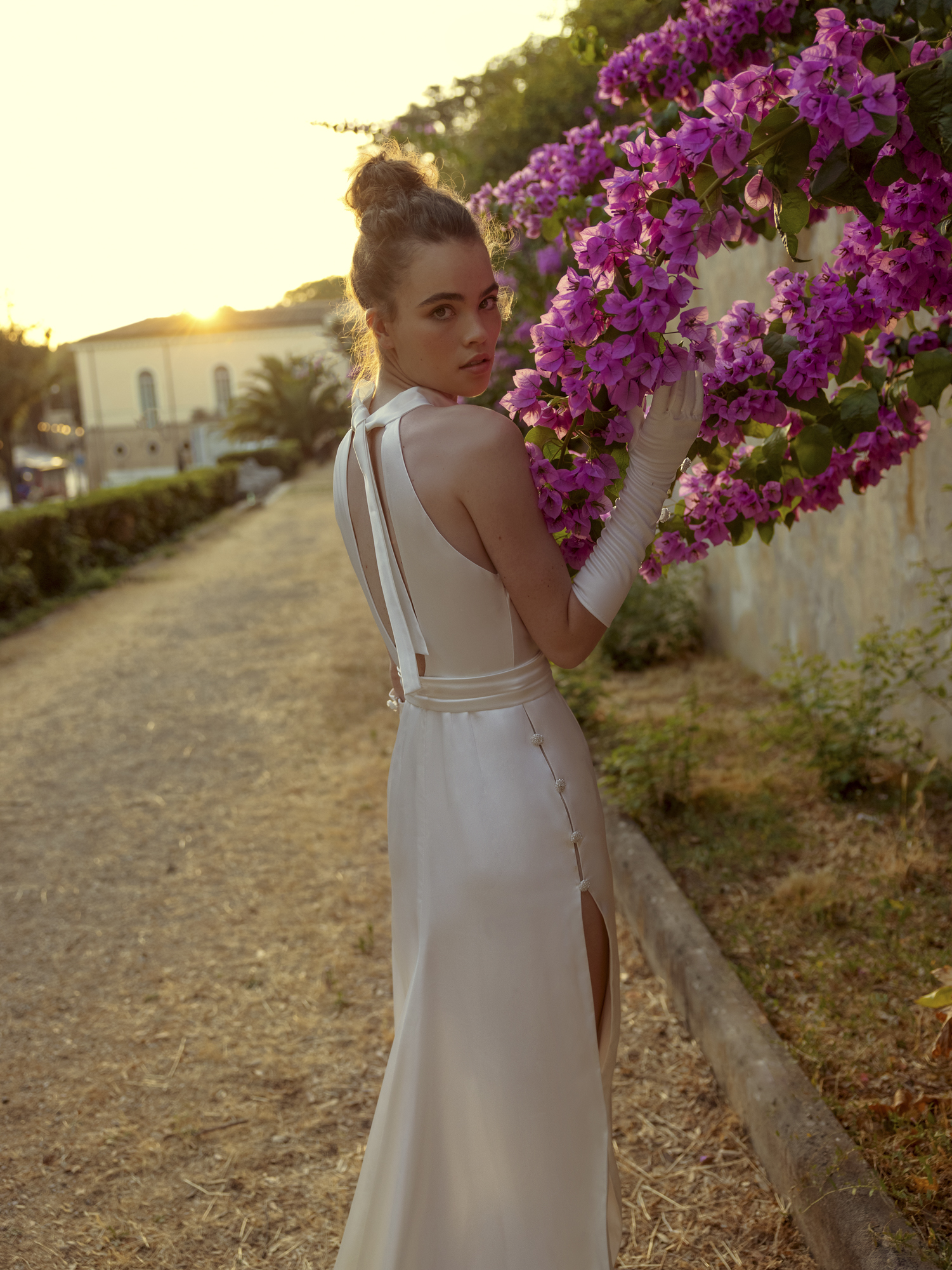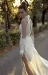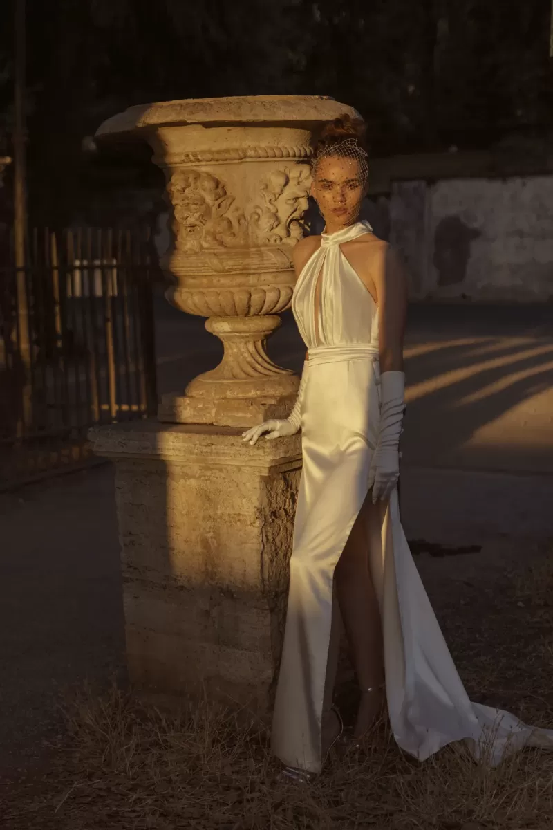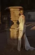 Fitted silhouette dress. Dress with a stand-up collar that ties into a bow. The front and back are decorated with a drop-shaped neckline. The skirt is with high slits. On the sides of the skirt is a transparent insert, which is decorated with buttons. The image is complemented by a wide detachable belt.