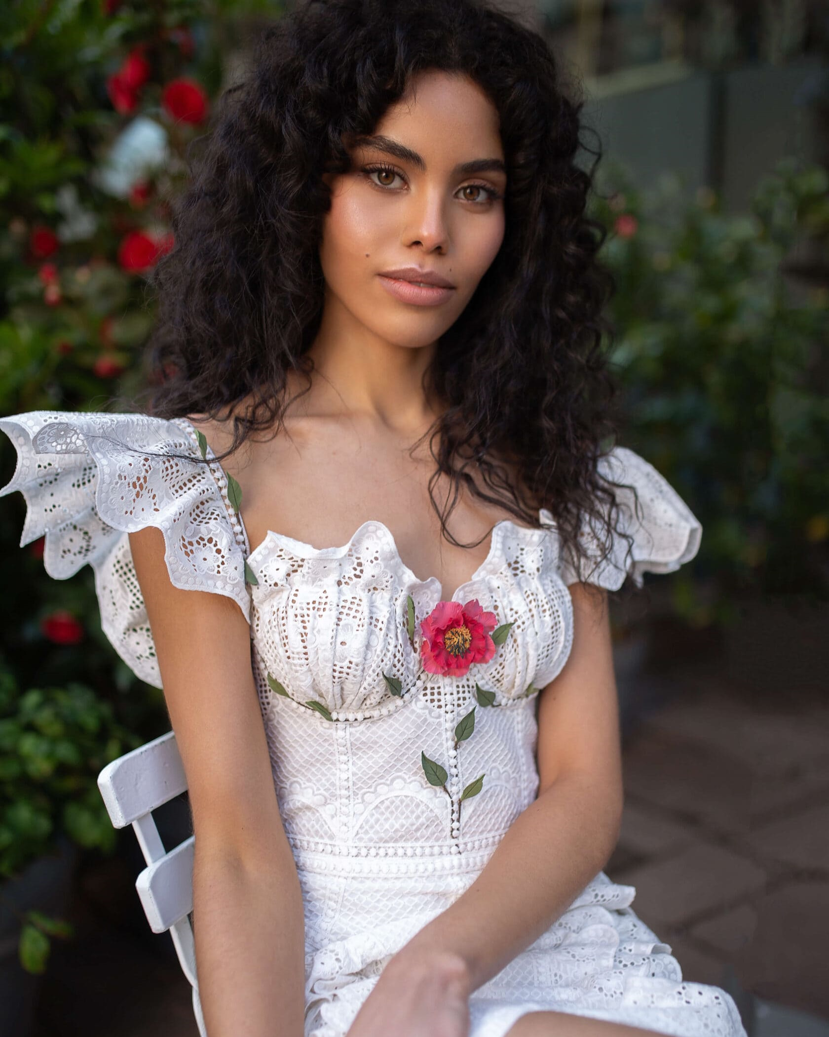 Mermaid silhouette dress, long with a small train. Relief corset with cups. On the front of the corset is a handmade composition made of Japanese clay. Shoulder straps with openwork lace flounces. Skirt with a slit in the center of the front.