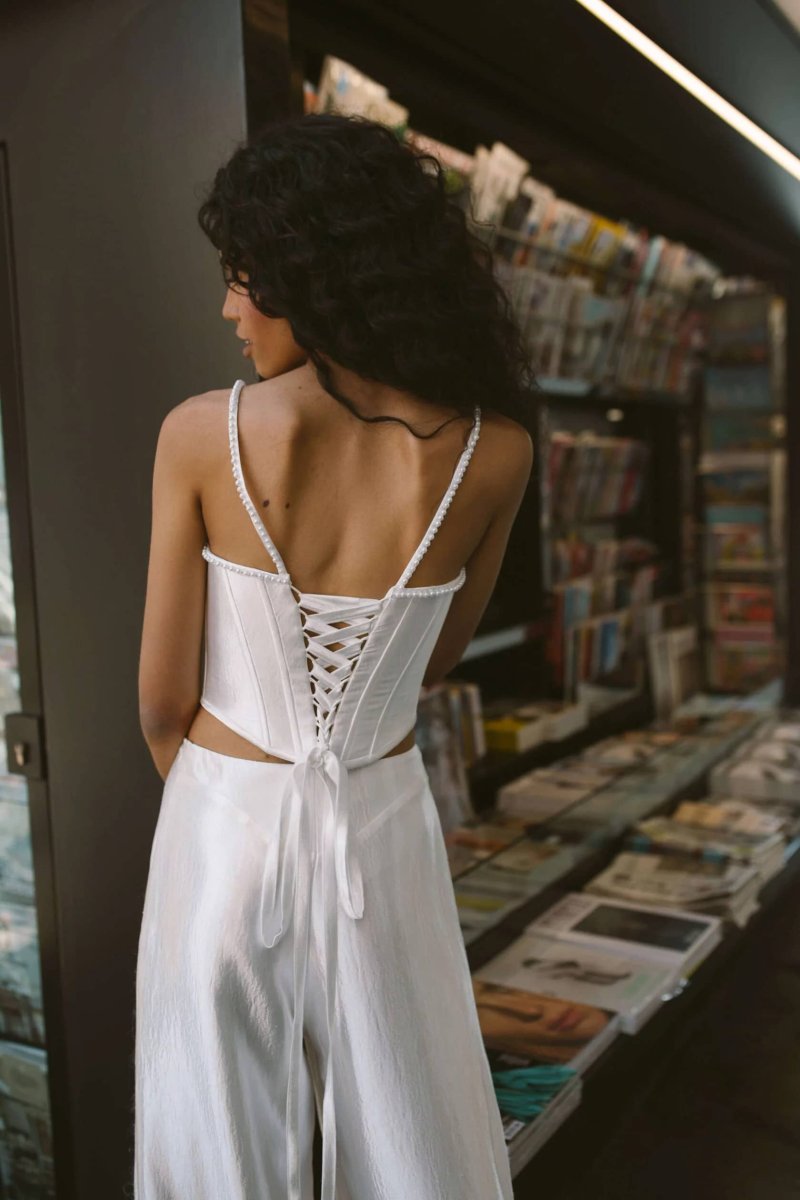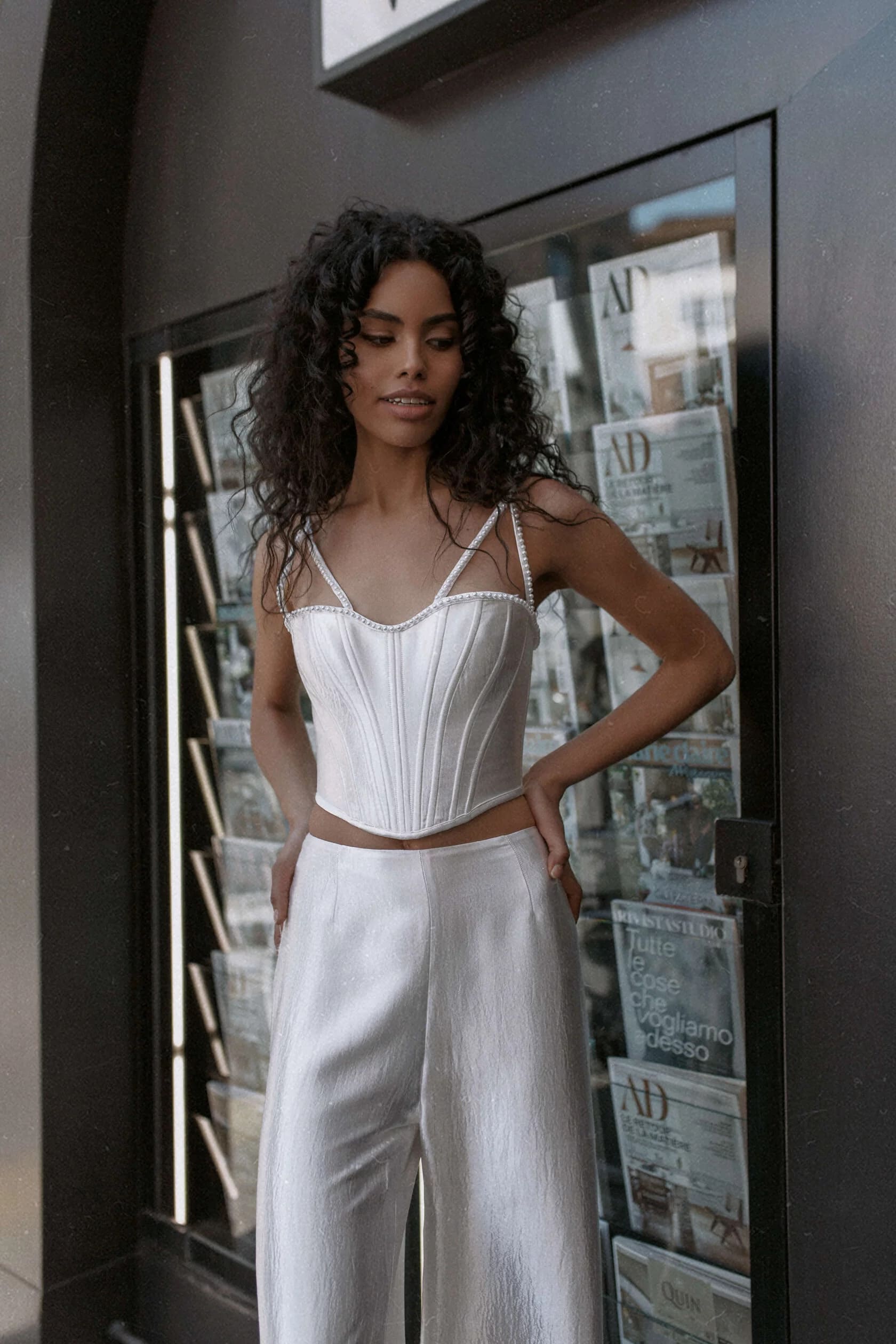 The set consists of trousers and a corset.The corset is soft, embossed, without inner cups on the straps. There are 2 straps on the front of the corset, which converge to the shoulder into one strap. Delicate decor in the form of pearl beads.Loose-fitting, floor-length lined trousers. Pants are high-rise.