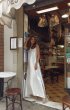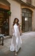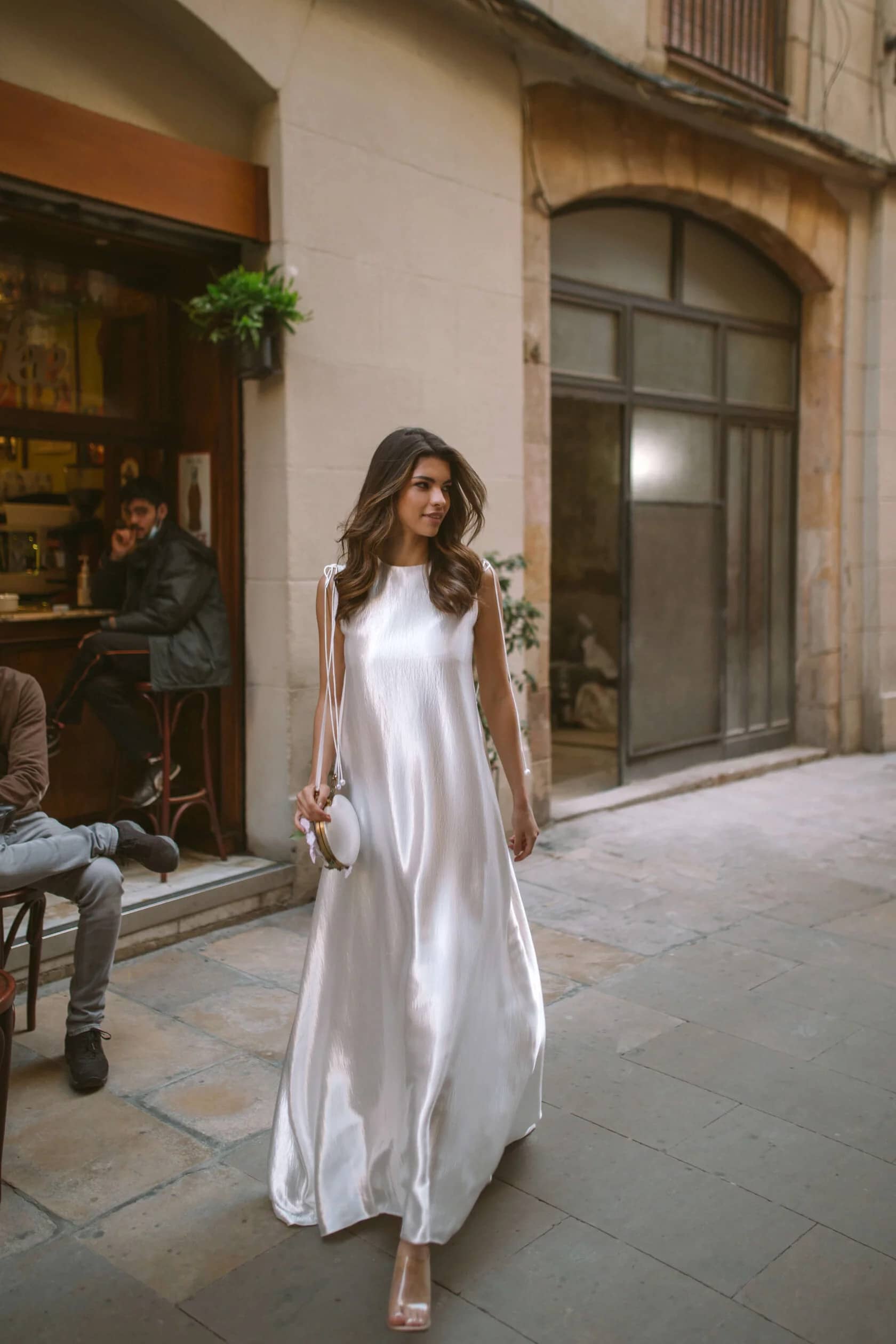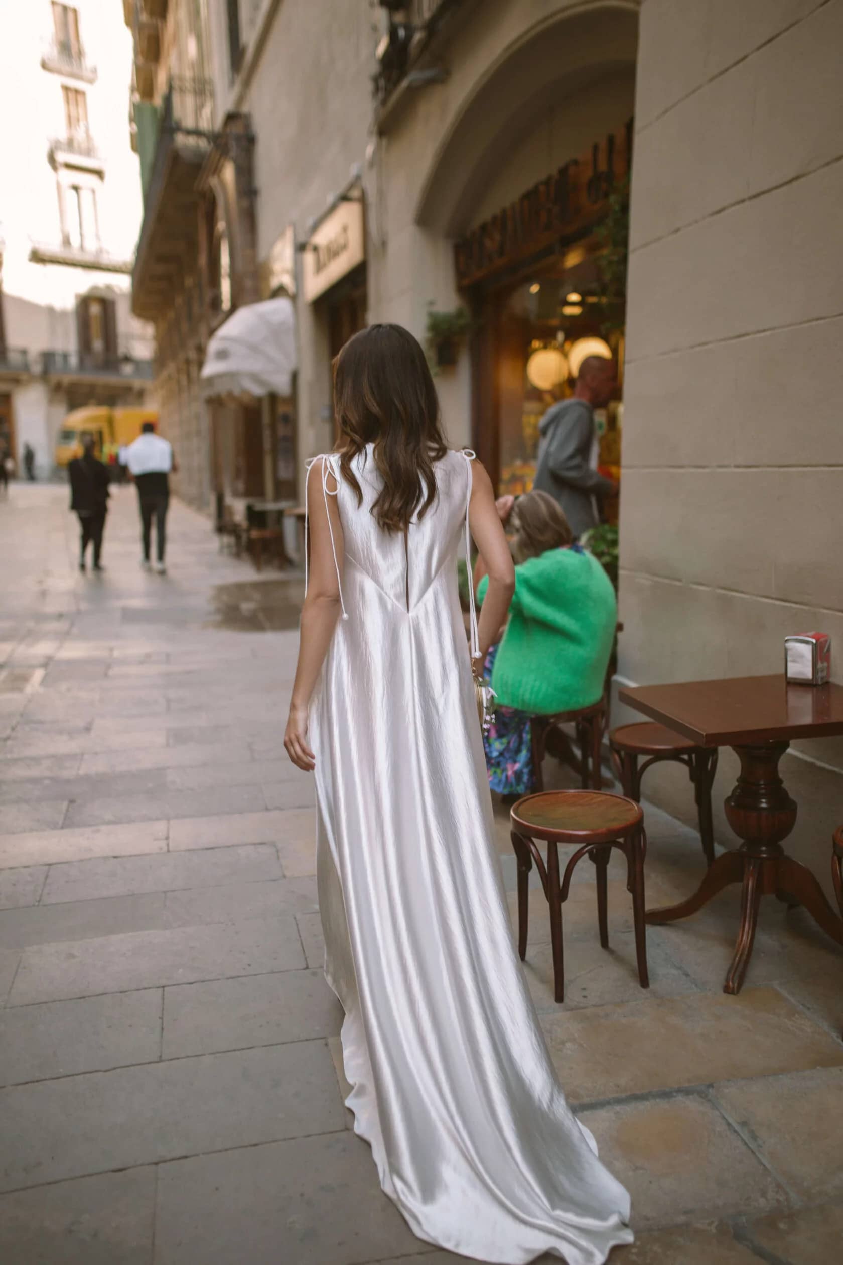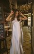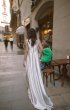 Wedding dress, free silhouette, long, with a small train.Front one-piece. Boat-shaped neckline.Lacing runs along the shoulder lines. Dress lined with fine milky crepe. With a small train.
