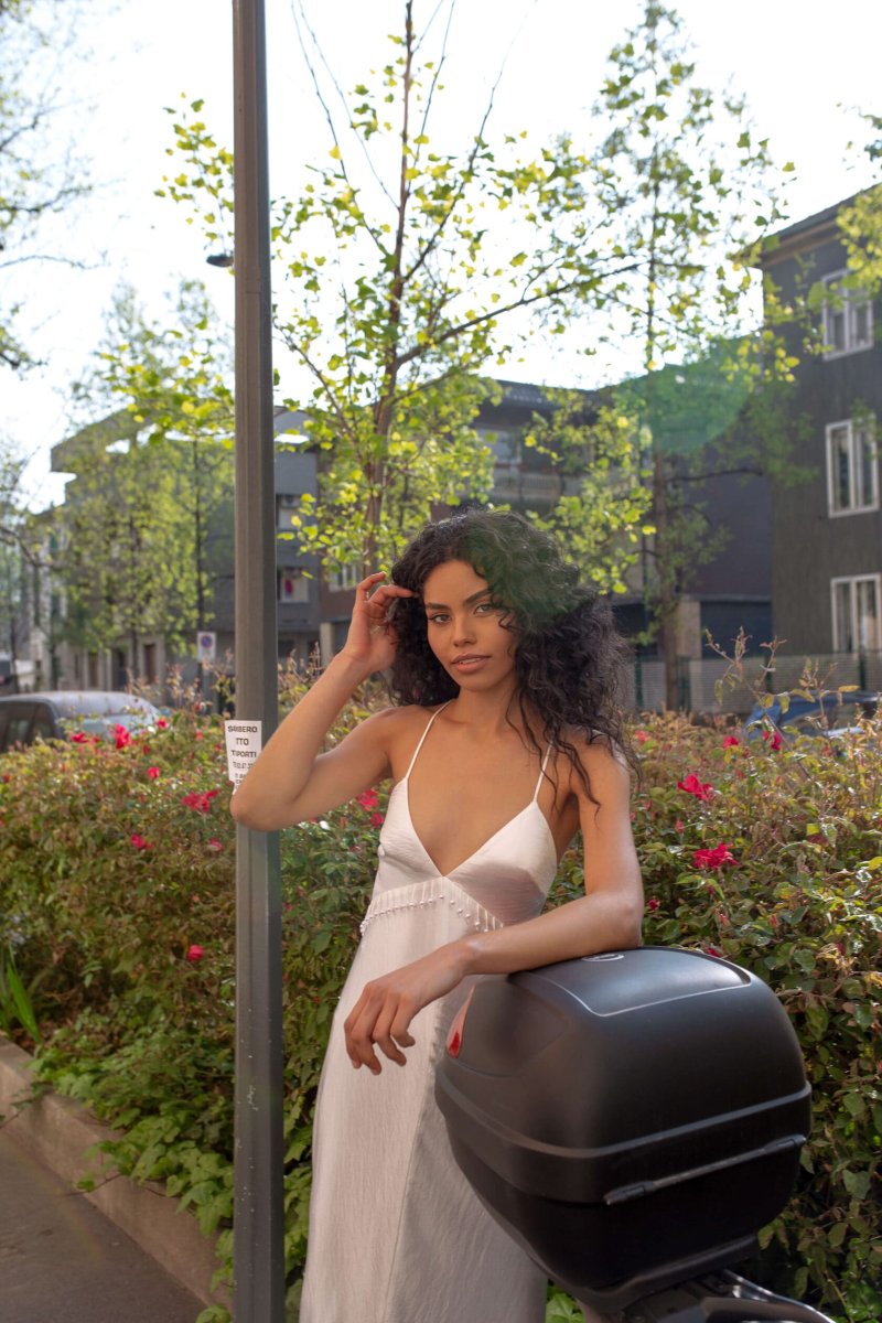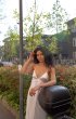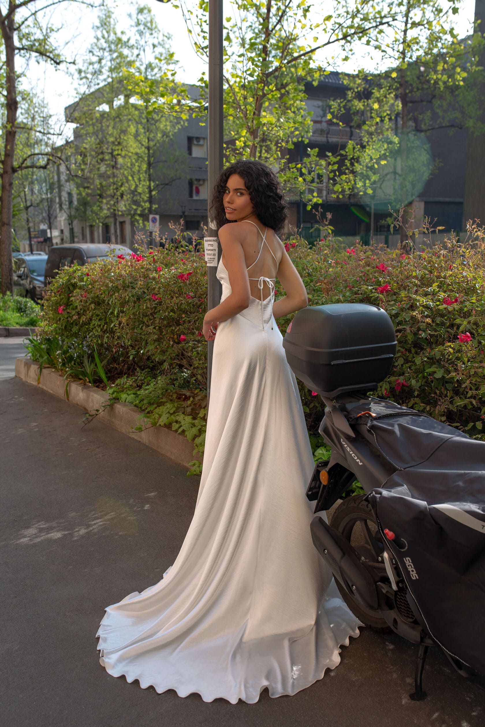 Semi-adjacent silhouette dressThe bodice has straps, no inner cups and a V-shaped neckline. The back of the bodice is semi-open. Back straps tie into a bow. Before the skirt with a central seam.