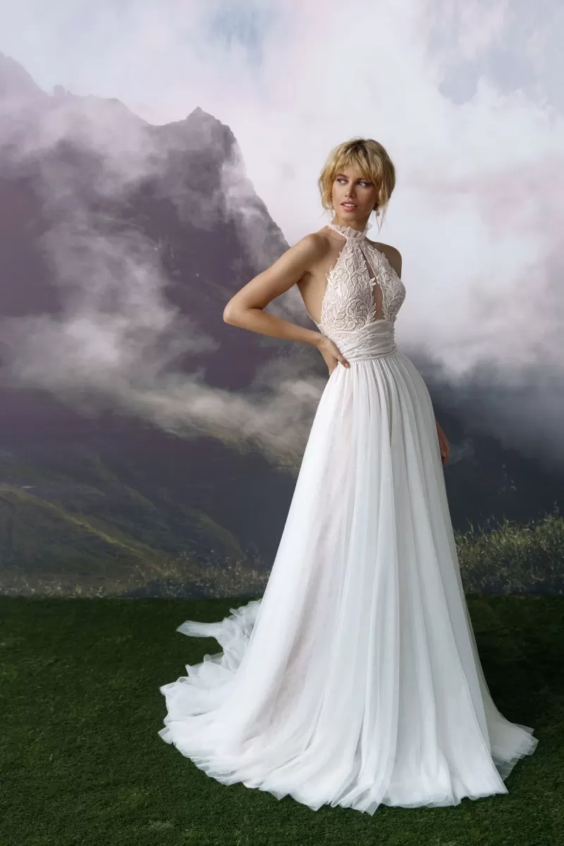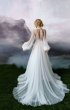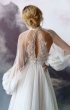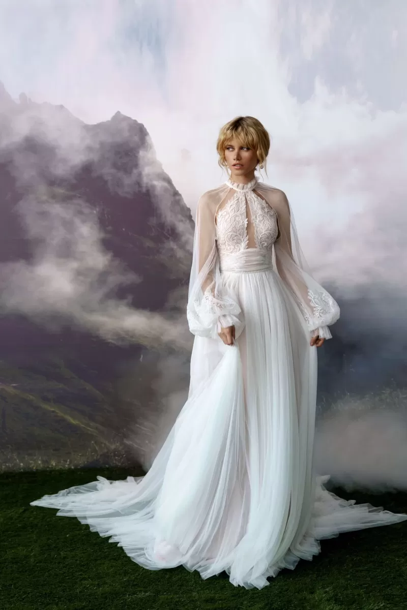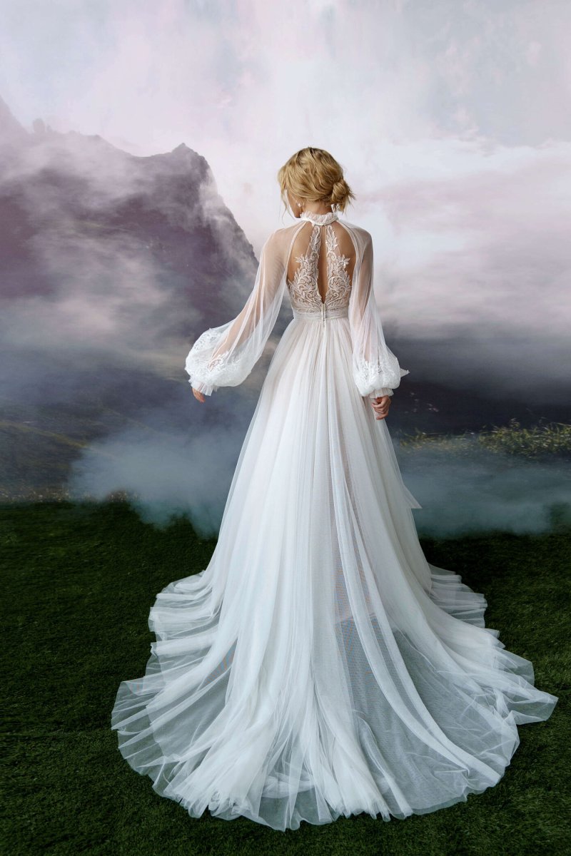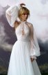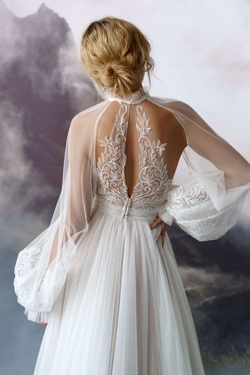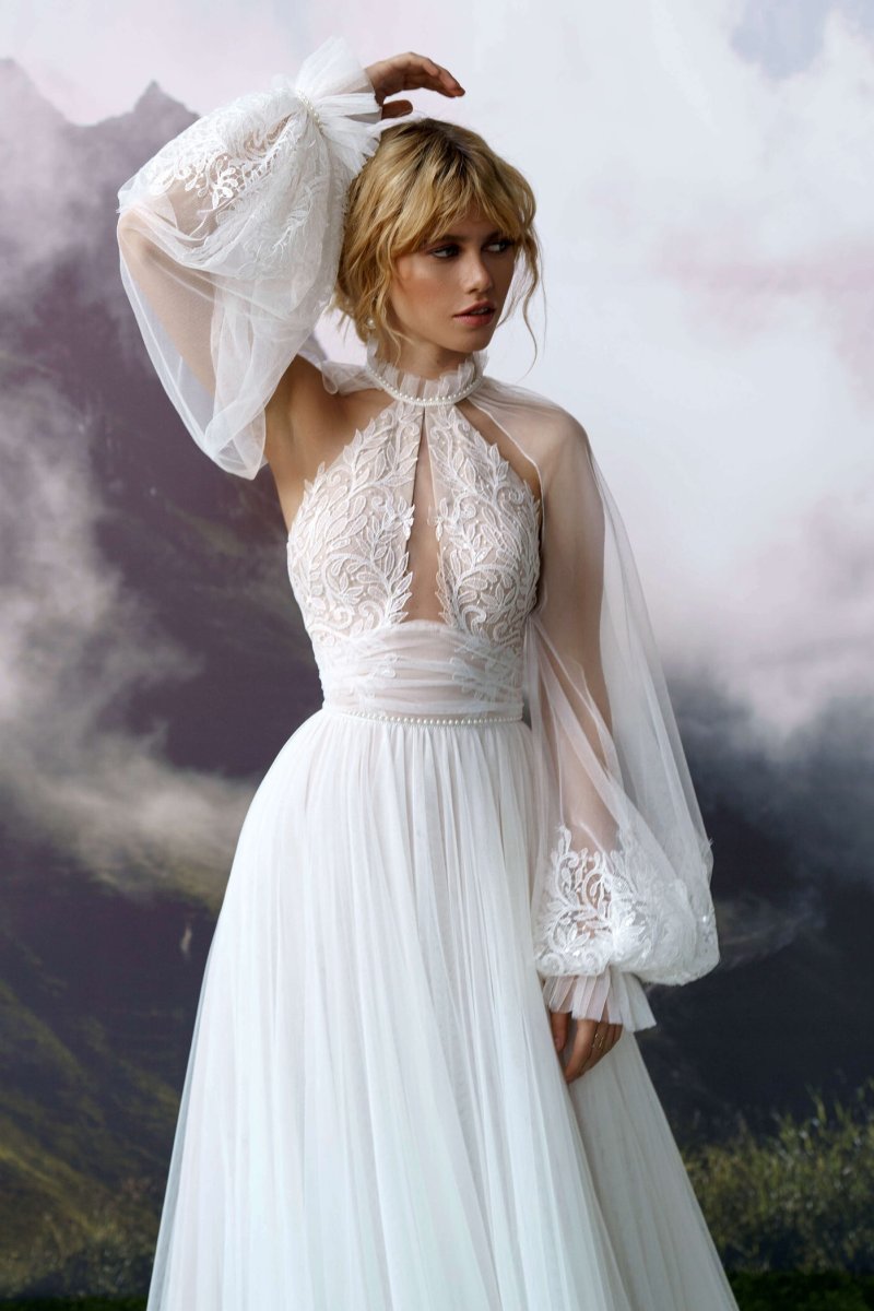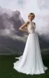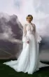 A-silhouette wedding dress with removable long sleeves. The dress and the sleeves are decorated with lace. Maxi skirt has a train. The waistline is framed with a decorative belt with pearls.