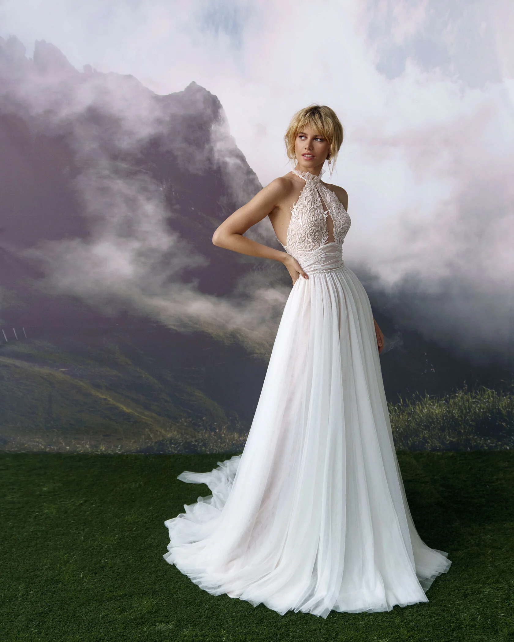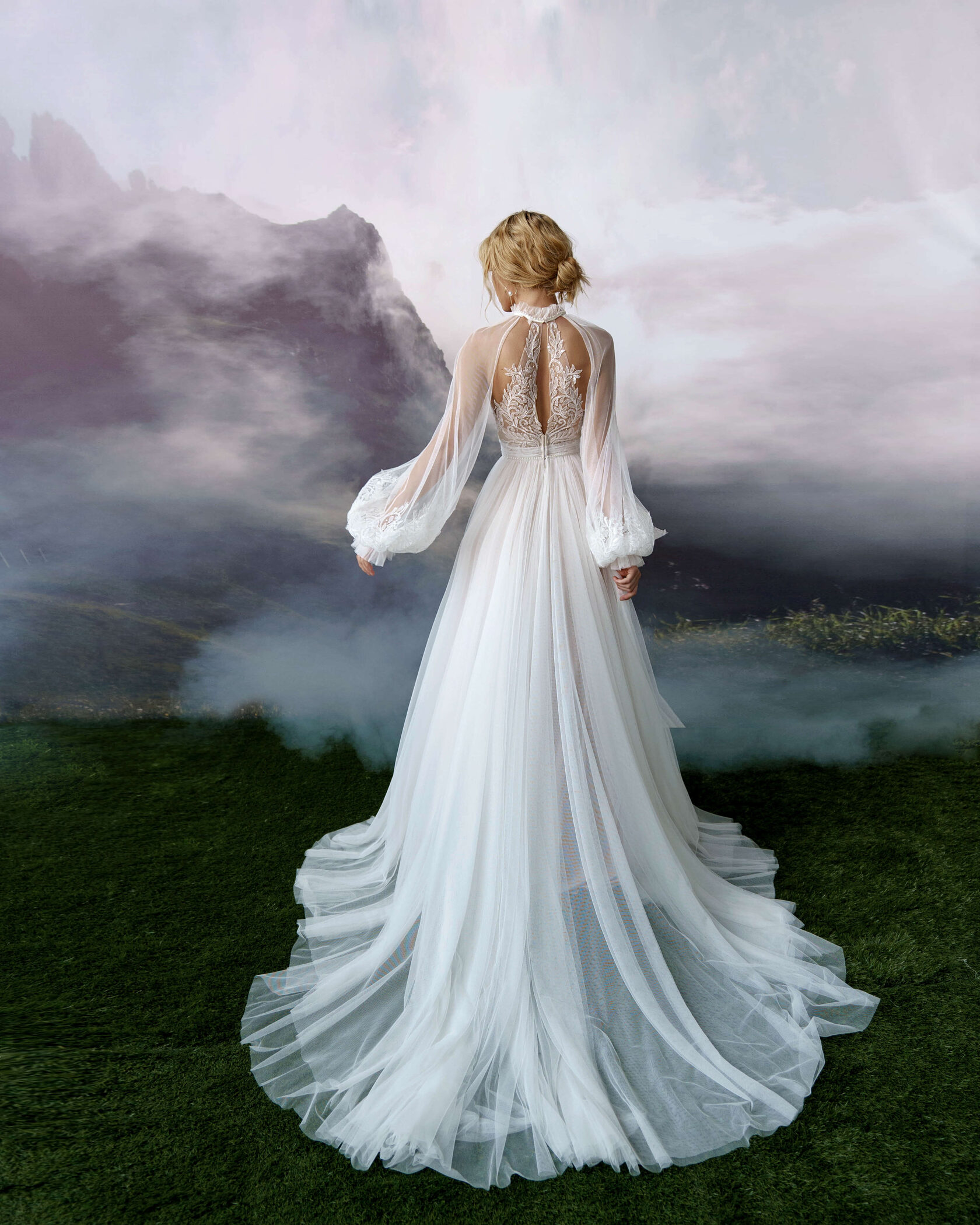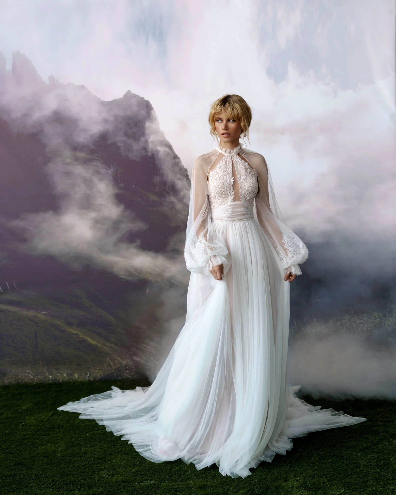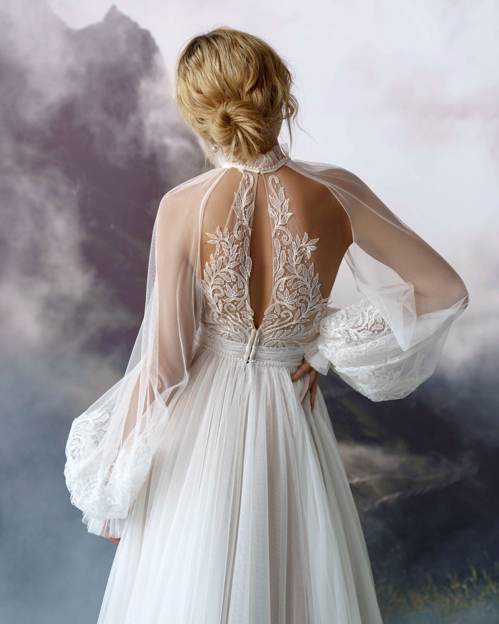 A-silhouette wedding dress with removable long sleeves. The dress and the sleeves are decorated with lace. Maxi skirt has a train. The waistline is framed with a decorative belt with pearls.