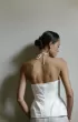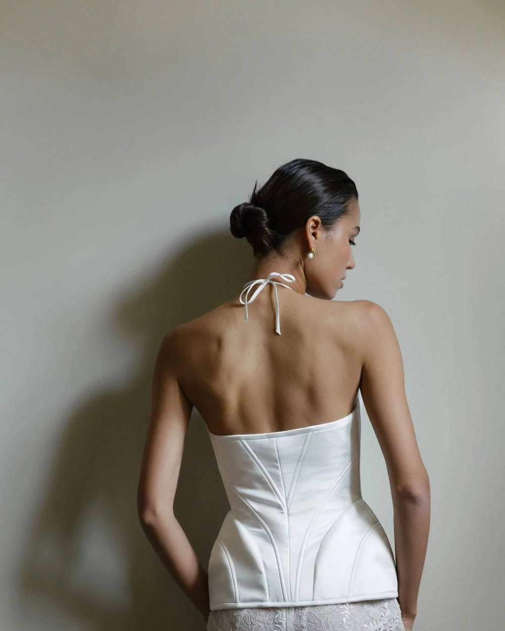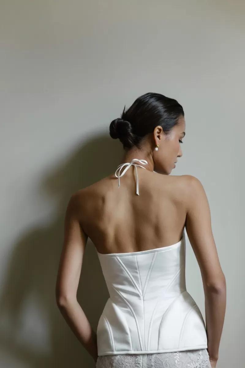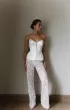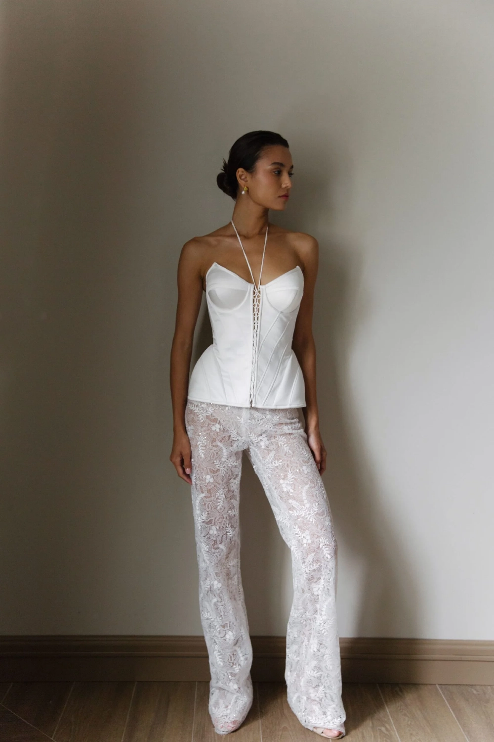 A set of corset and trousers. The satin corset is fastened in front with lacing. The cup consists of three parts. The corset has small extensions on the sides. The wide trousers are made of thin lace. Flesh-colored shorts are provided under the trousers.