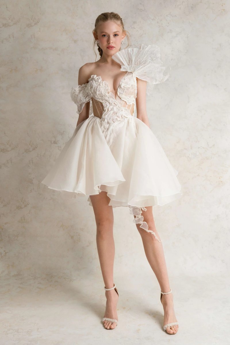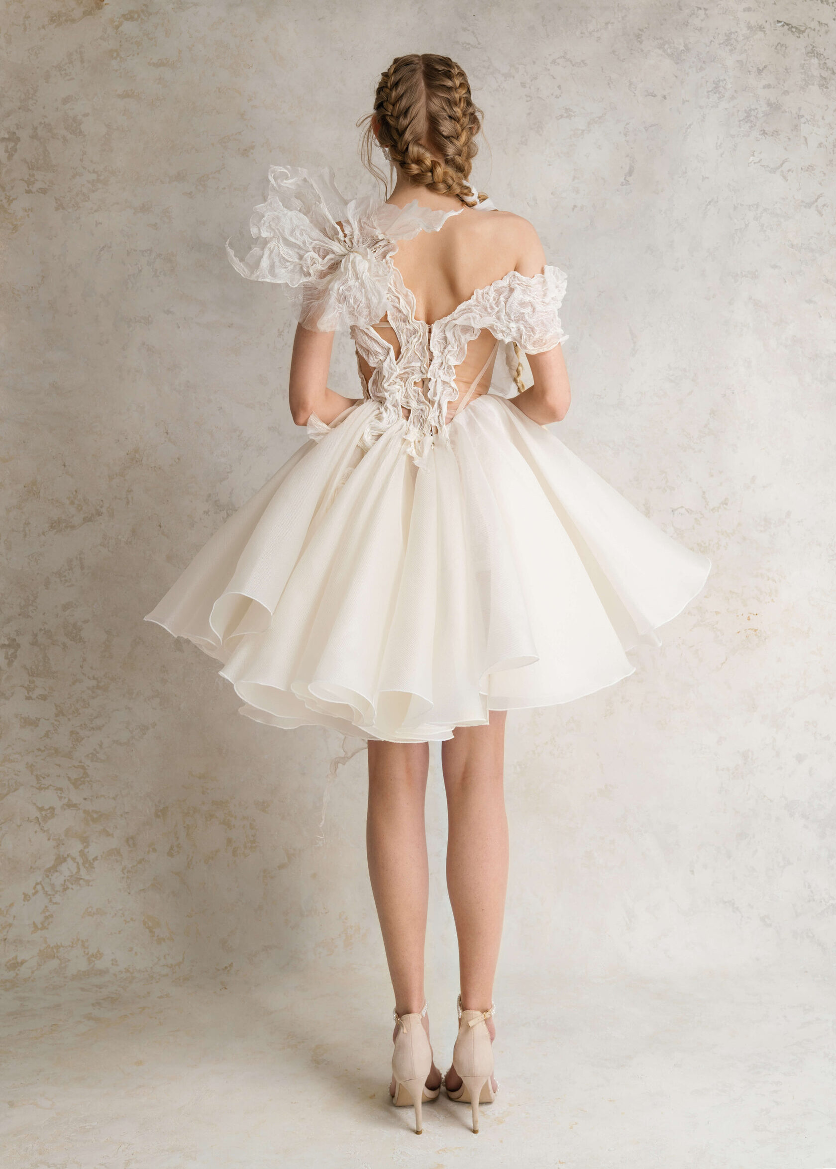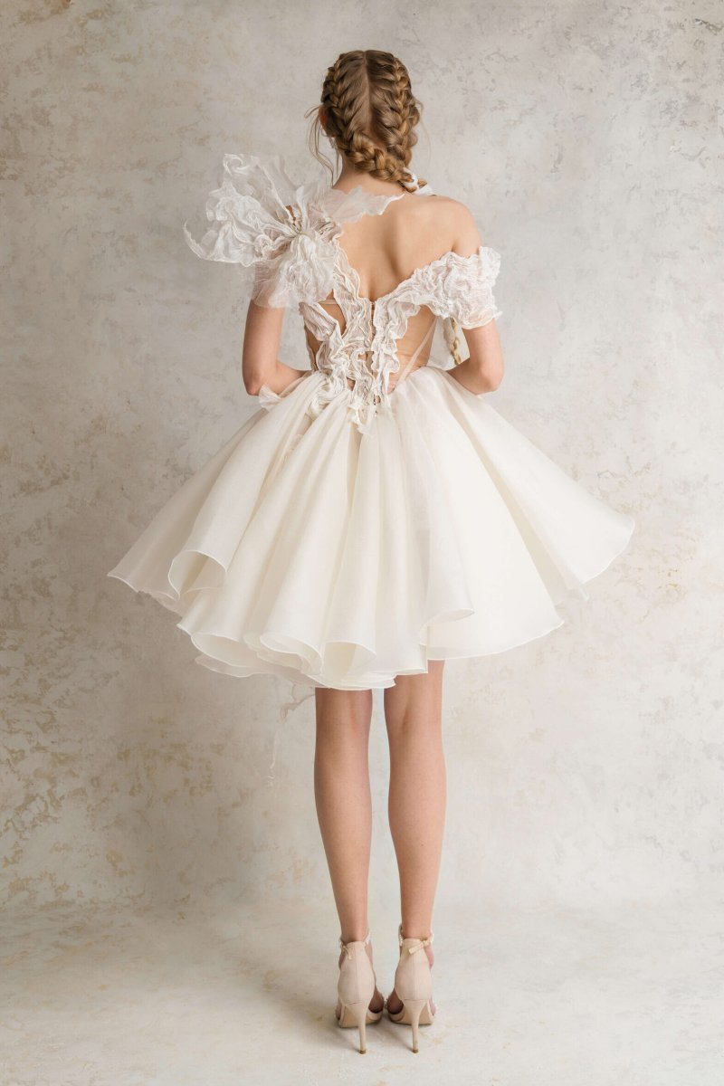 Mini wedding dress is made of natural silk. The dress is embellished with decorations of natural, draped silk, fixed in a special solution.This dress has a wide size range. Also we accept orders for individual sewing of any complexity.