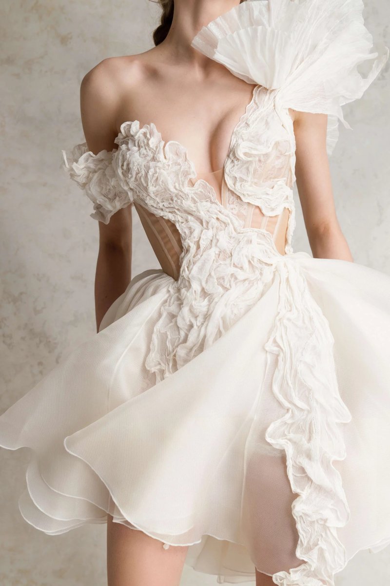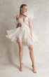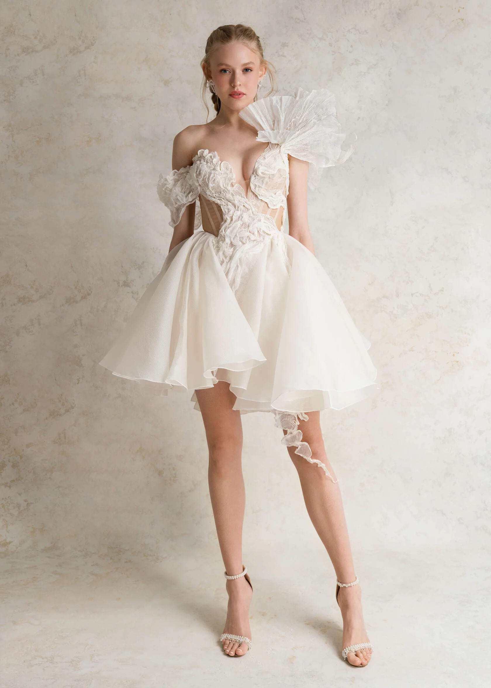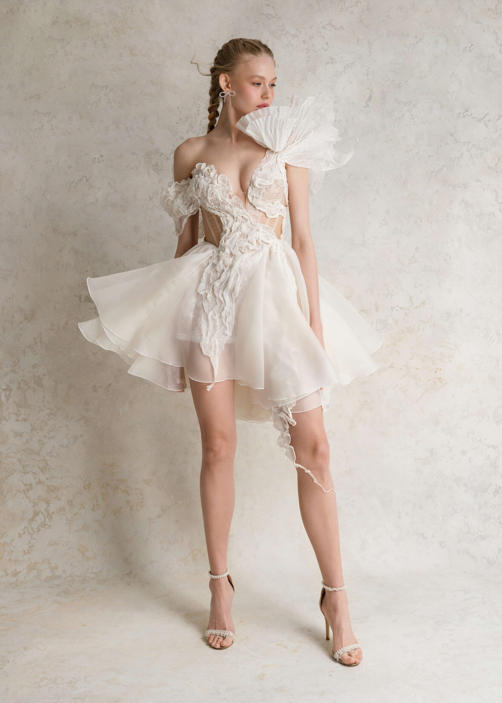 Mini wedding dress is made of natural silk. The dress is embellished with decorations of natural, draped silk, fixed in a special solution.This dress has a wide size range. Also we accept orders for individual sewing of any complexity.