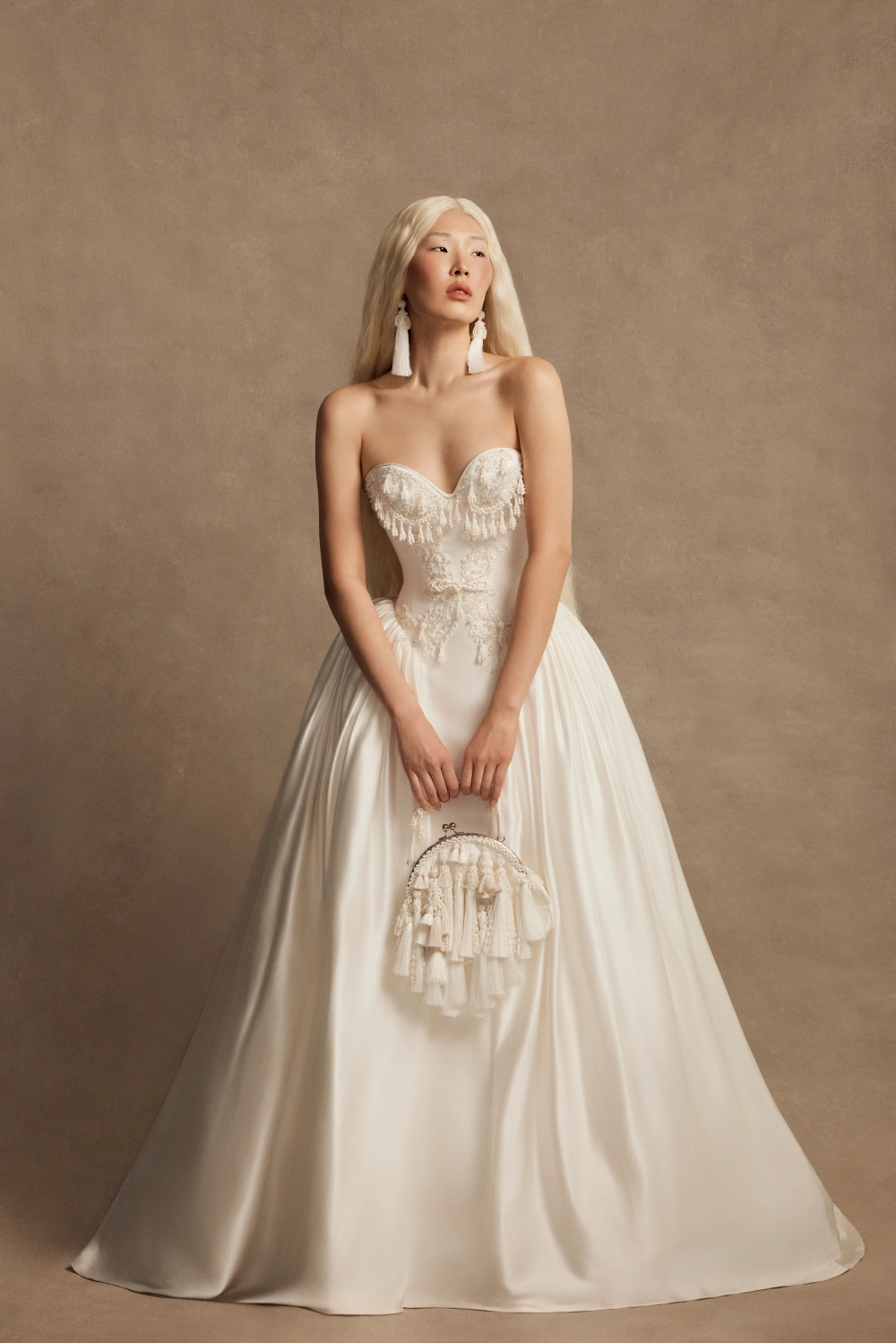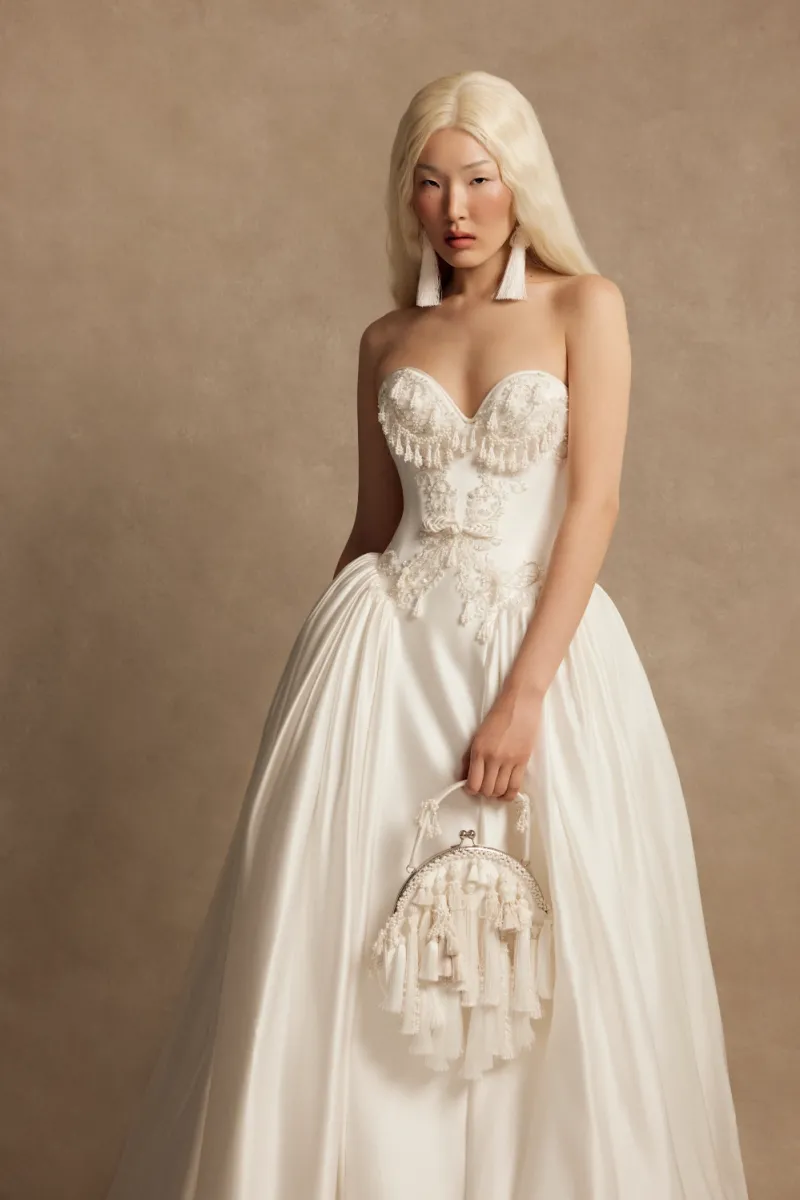 A princess‑silhouette wedding gown featuring a structured natural‑silk corset and a voluminous long skirt. The corset includes molded cups, internal lacing, a full‑length zipper, and metal boning, and is adorned with silk cord, a decorative belt, silver beading, pearls, sequins, and a braided beaded tassel.