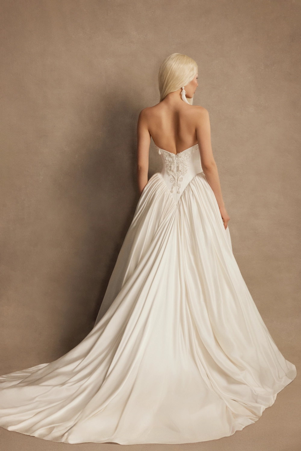 The full silk skirt with a train is supported by side crinolines and multiple net layers, with both the top layer and lining made of natural silk.