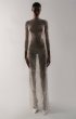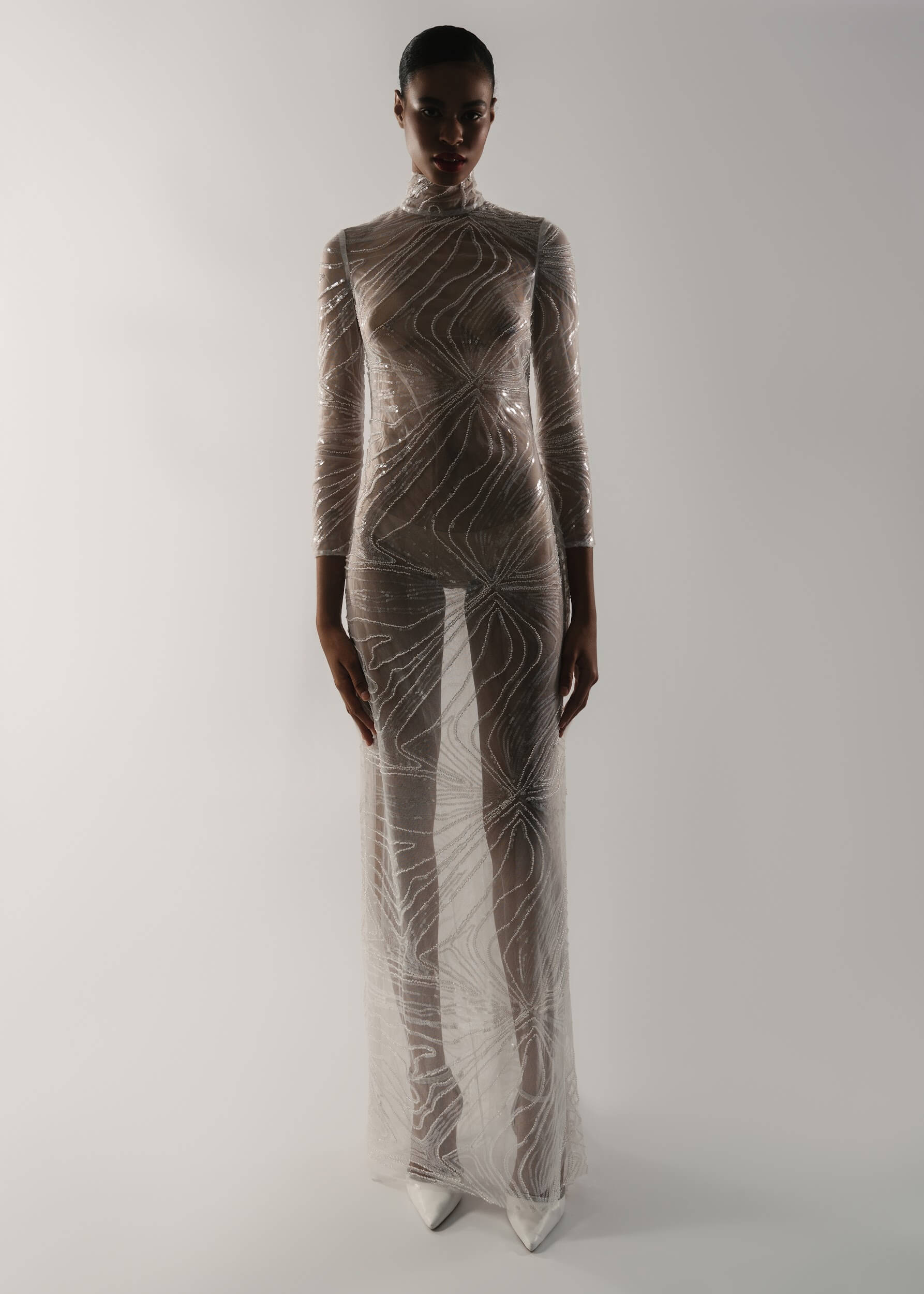 The tunic dress is made from embroidered fabric. The dress is semi-transparent.