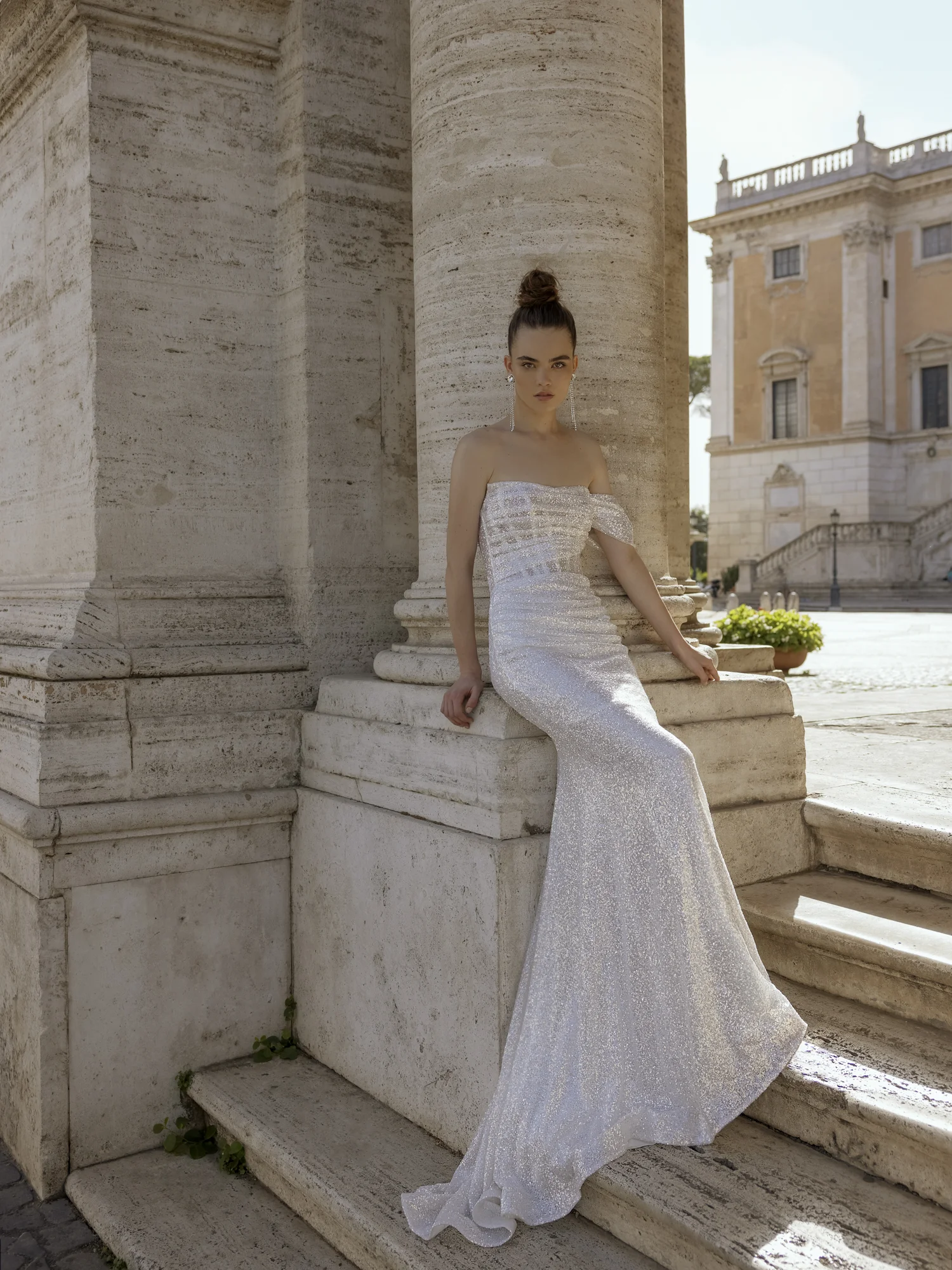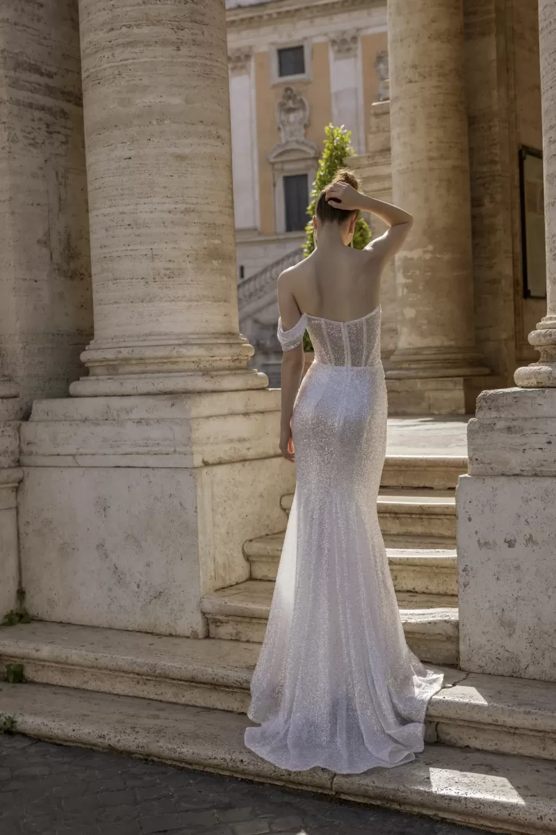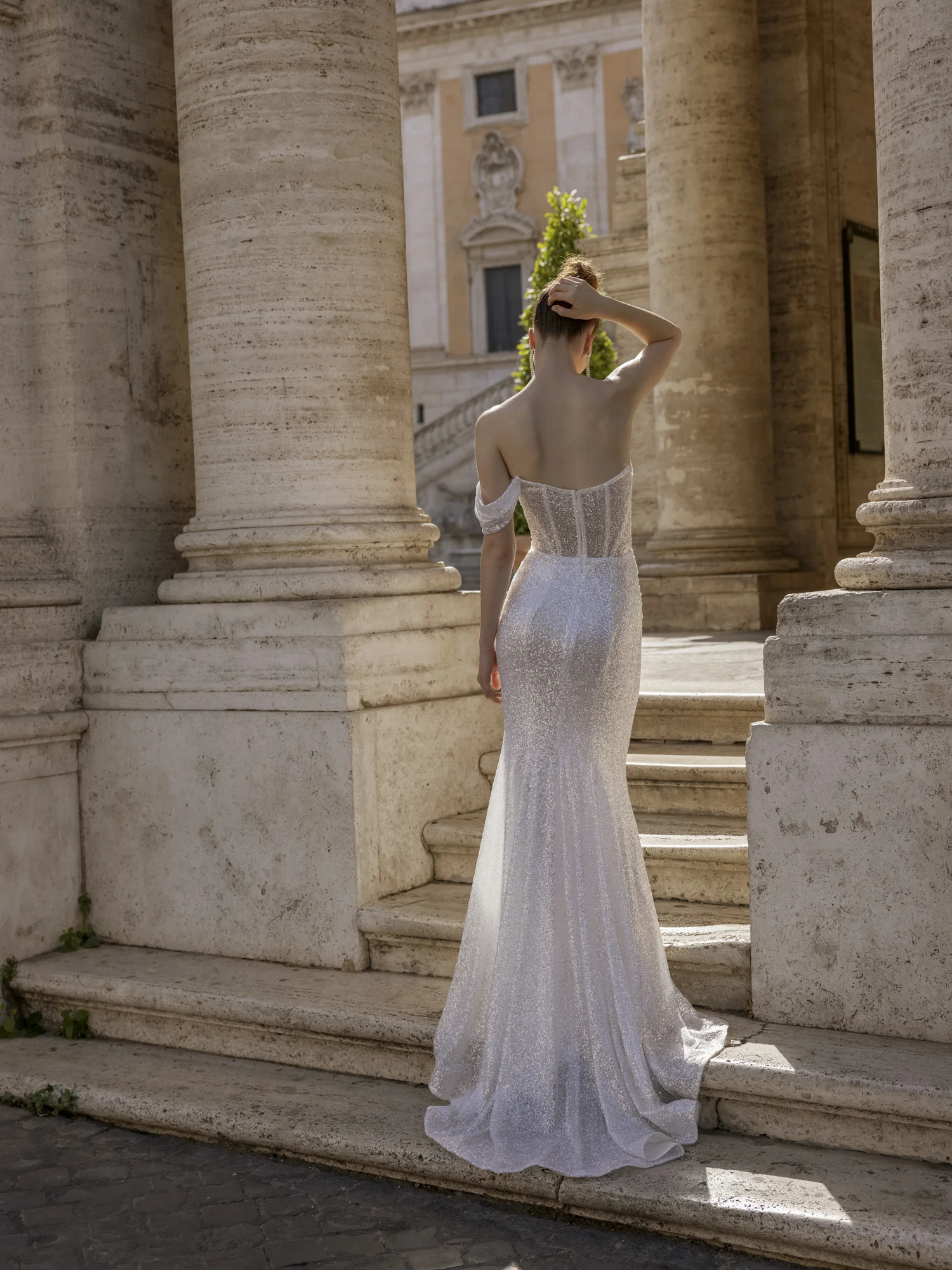 Fitted silhouette dress.The dress corset is embossed, translucent with highlighted reliefs. The corset is draped diagonally. The accent of the dress is a wide draped shoulder strap and a detachable narrow sleeve (asymmetrical).The skirt is fitted with a train.