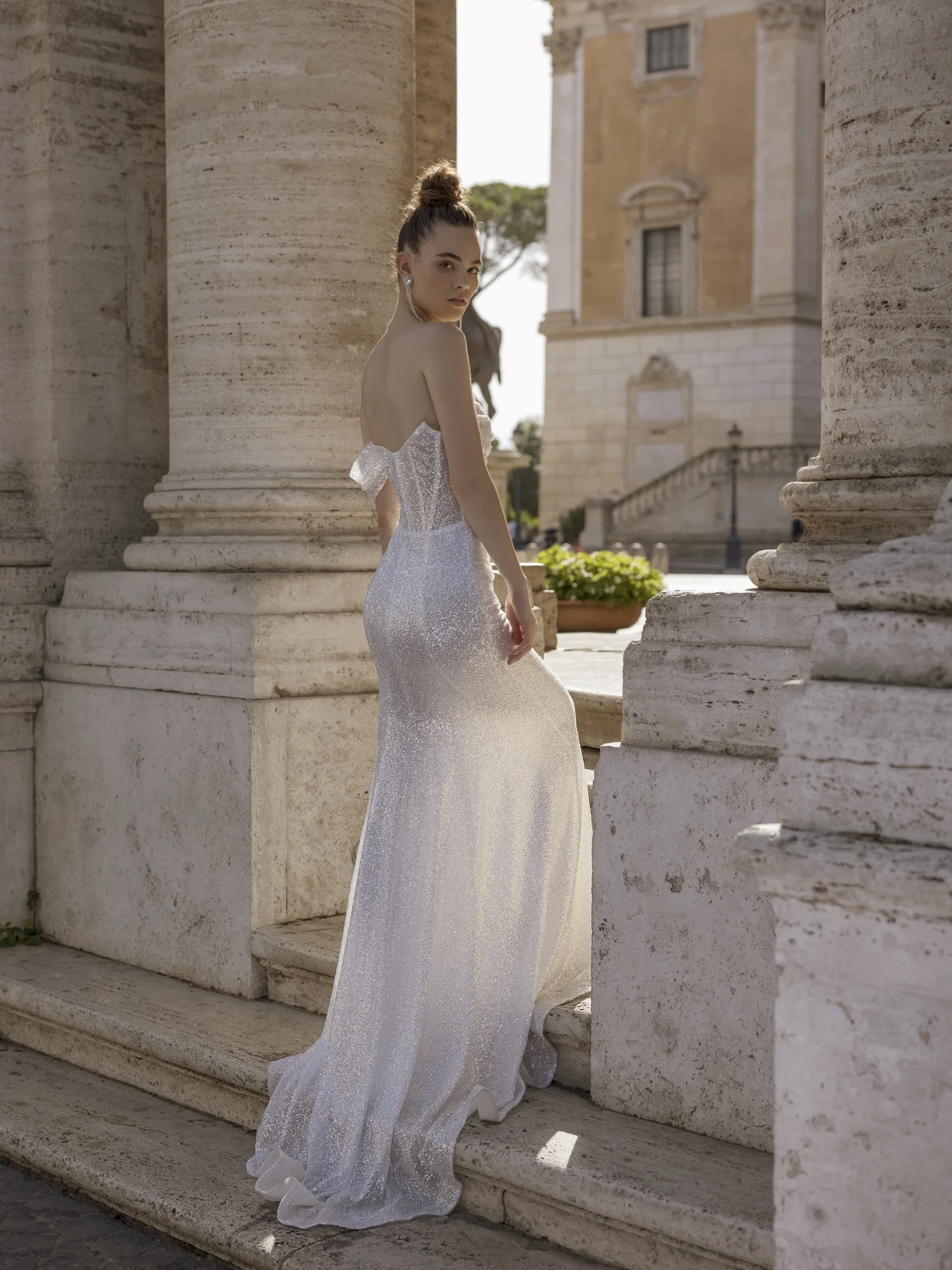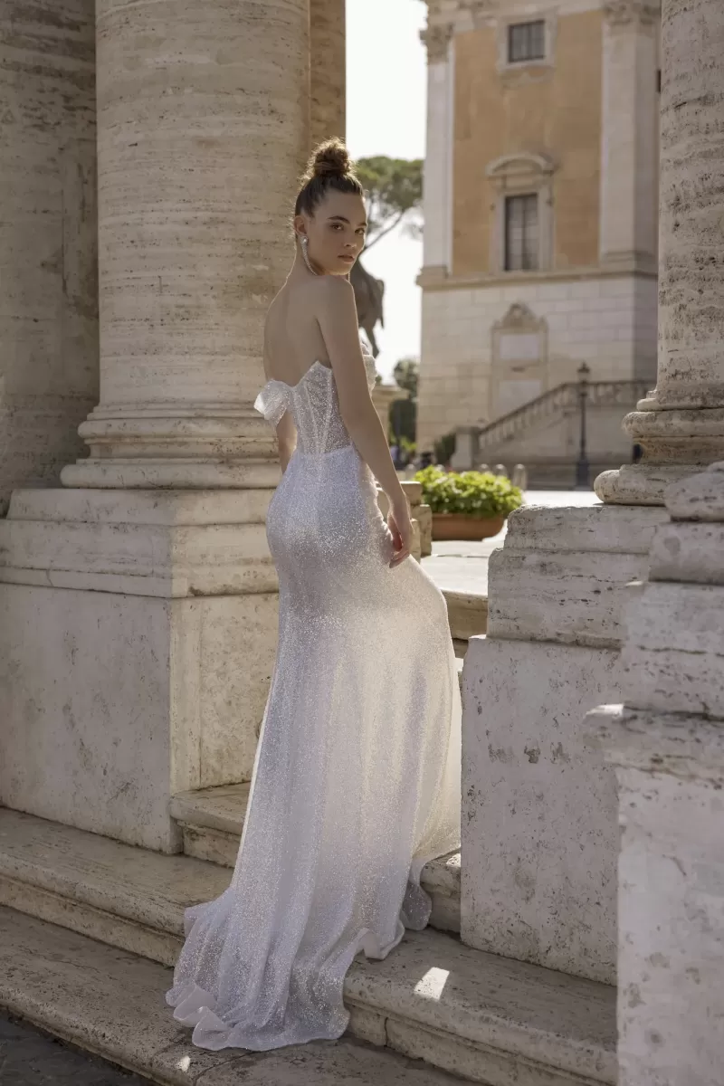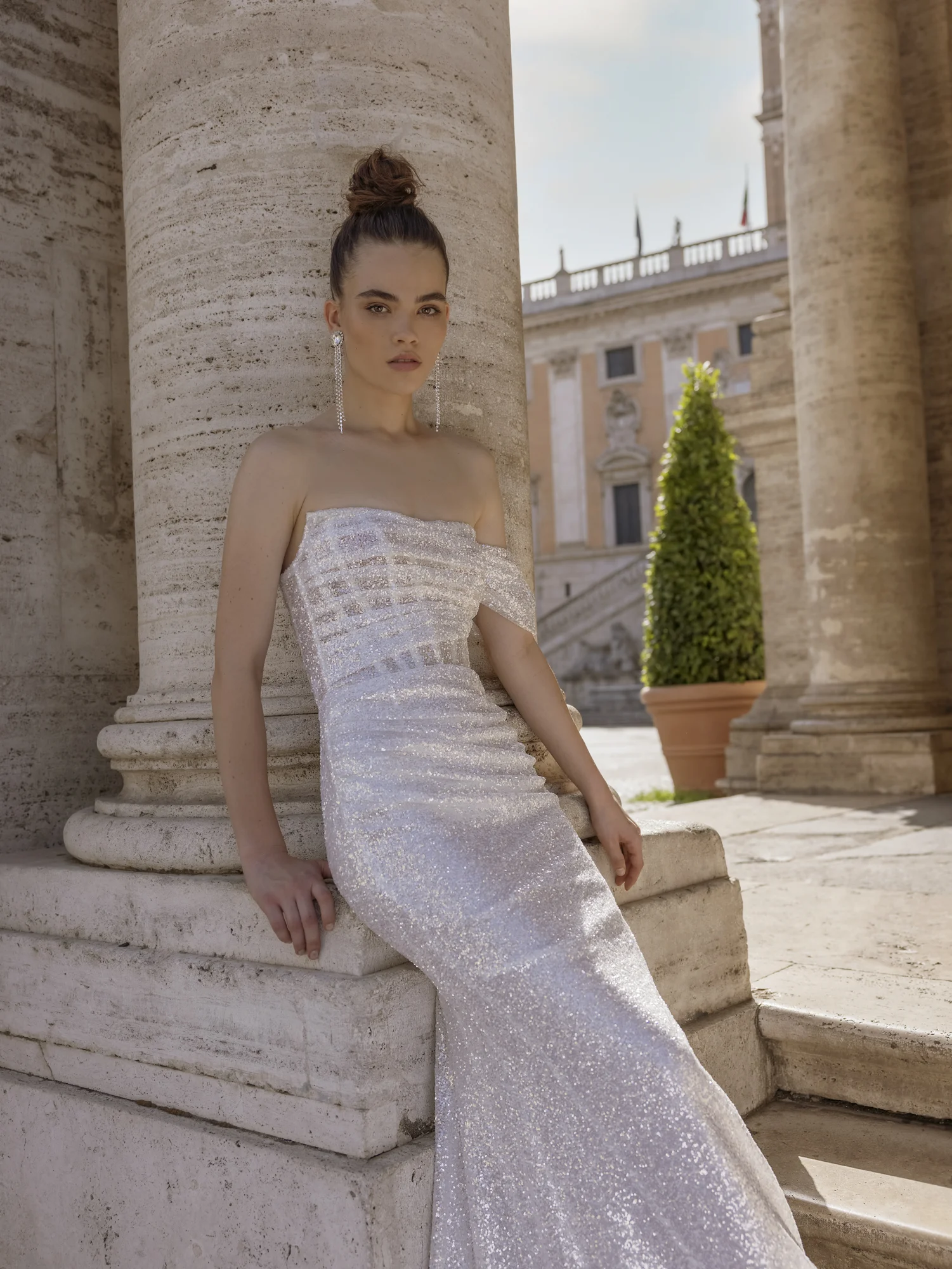 Fitted silhouette dress.The dress corset is embossed, translucent with highlighted reliefs. The corset is draped diagonally. The accent of the dress is a wide draped shoulder strap and a detachable narrow sleeve (asymmetrical).The skirt is fitted with a train.