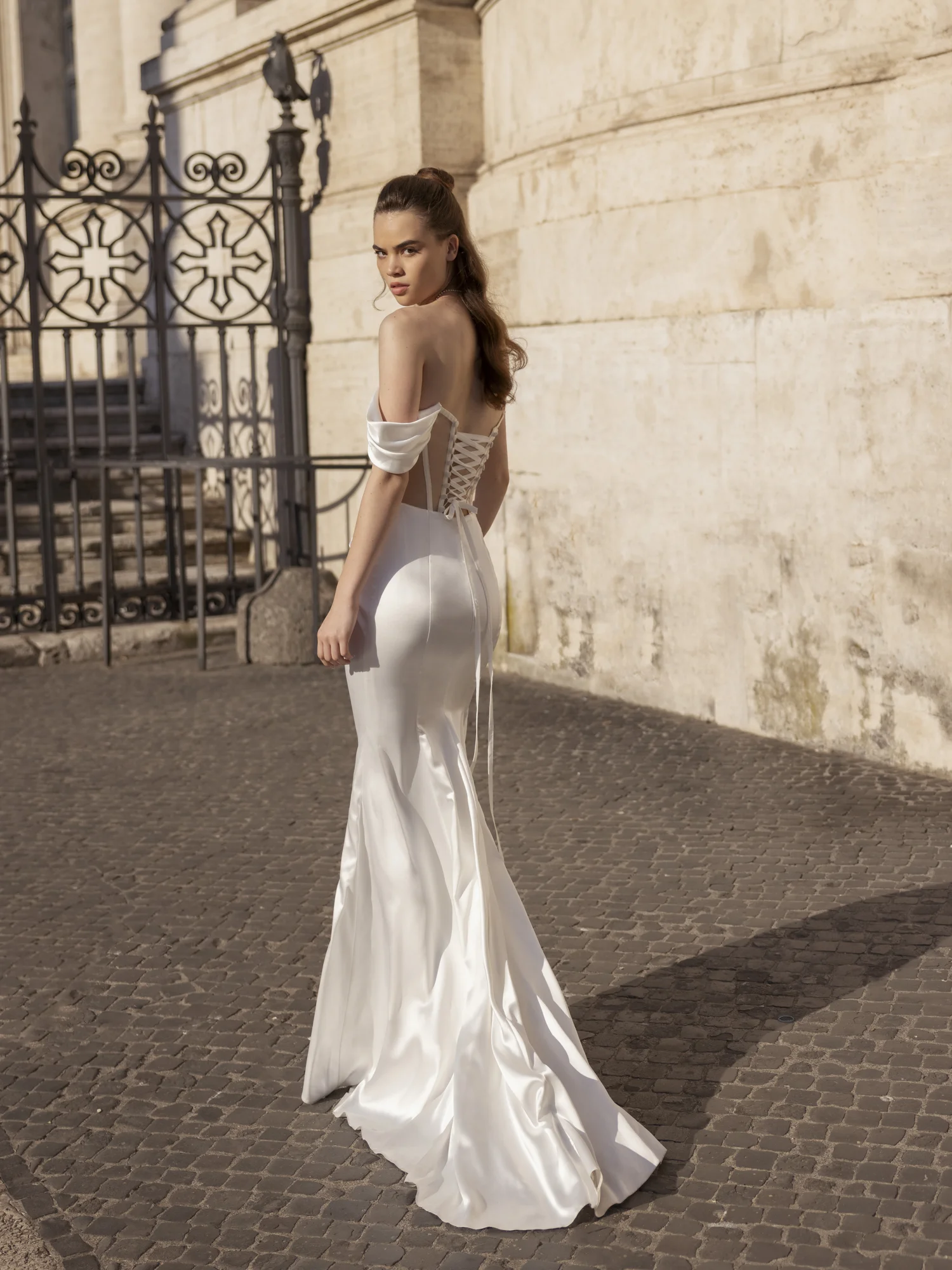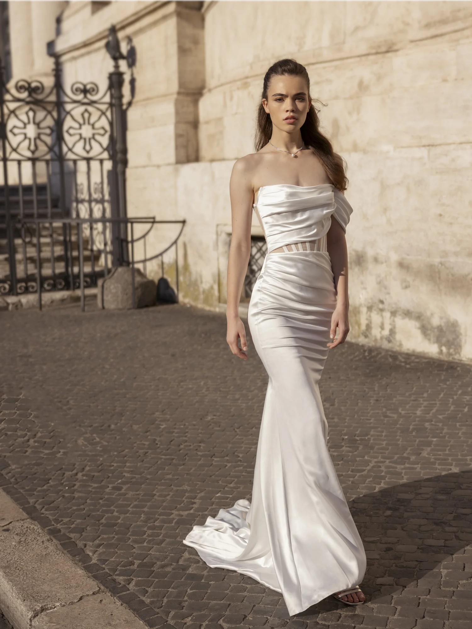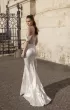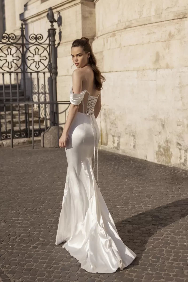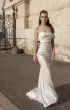 Fitted silhouette dress.The dress corset is embossed, translucent with highlighted reliefs. The corset is draped diagonally. The accent of the dress is a wide draped shoulder strap and a detachable narrow sleeve (asymmetrical).The skirt is fitted with a train.