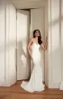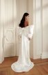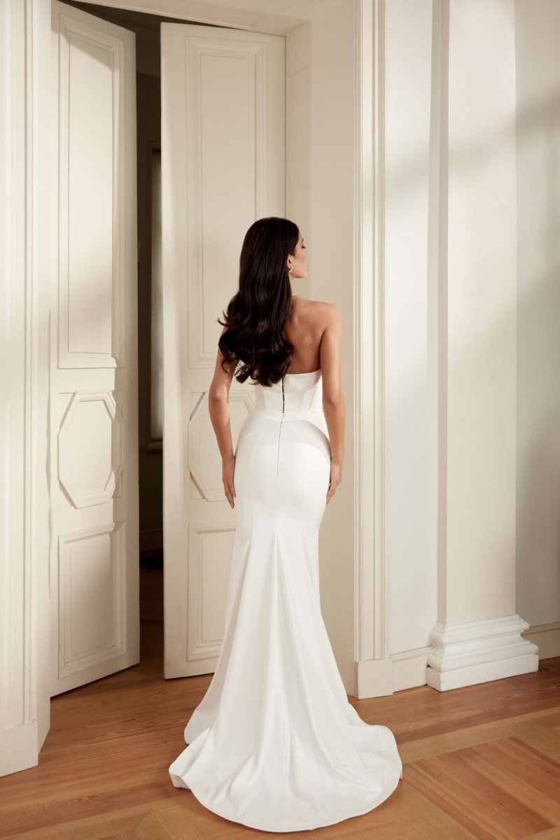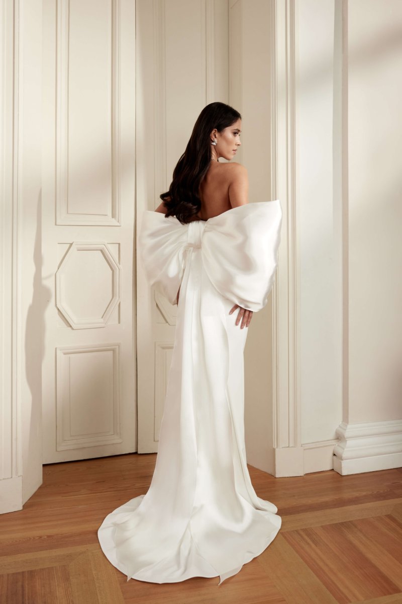 Mermaid wedding gown with drapery on the corset. As an addition there is a removable voluminous bow that is attached to the waist, and can also serve as a bolero.