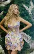 Wedding mini dress in purple color. Semi-transparent corset reliefs continue below the waist, which allows to emphasize the female figure more effectively. The shape of the skirt allows you to emphasize the dignity of the figure and does not restrain movement. The whole dress is decorated with multicolored 3D flowers.