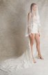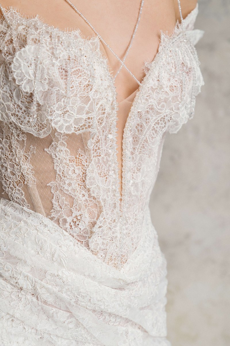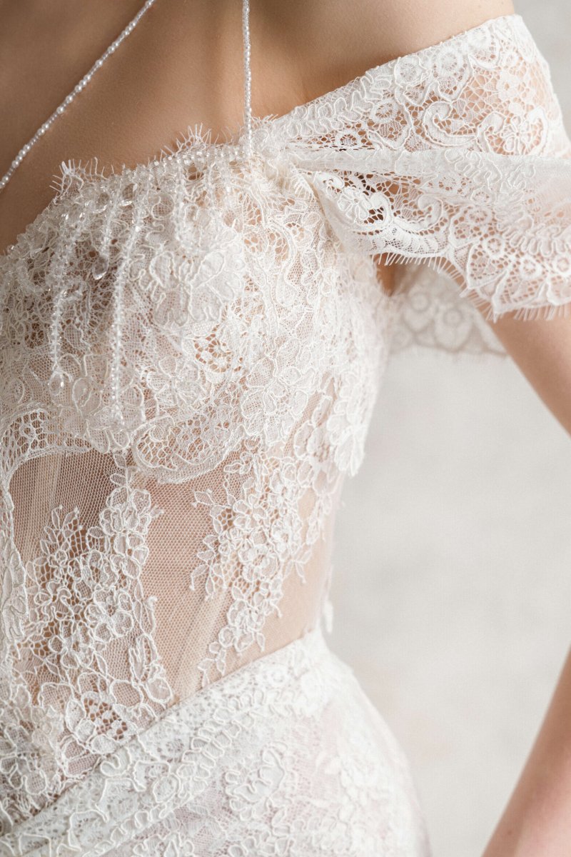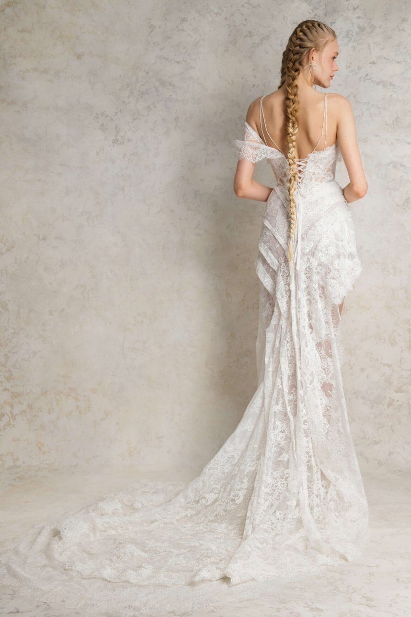 Wedding mini dress with a corset and an asymmetrical skirt with a train. The gown is embellished with decorative straps on the elastic band which is made of Czech beads.