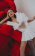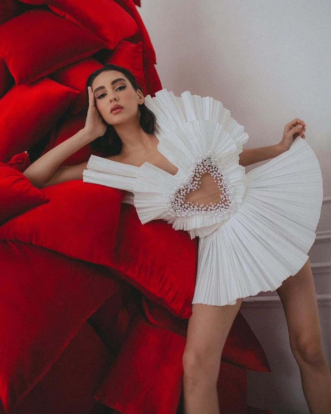 The set consists of a short dress and shorts.Relief corset, lined. Front with a flesh nylon insert imitating a heart-shaped cutout, embroidered with beads. Two rows of frills run along the front of the corset.Short skirt made of pleated satin with a hidden zipper.The shorts are lined with a belt.