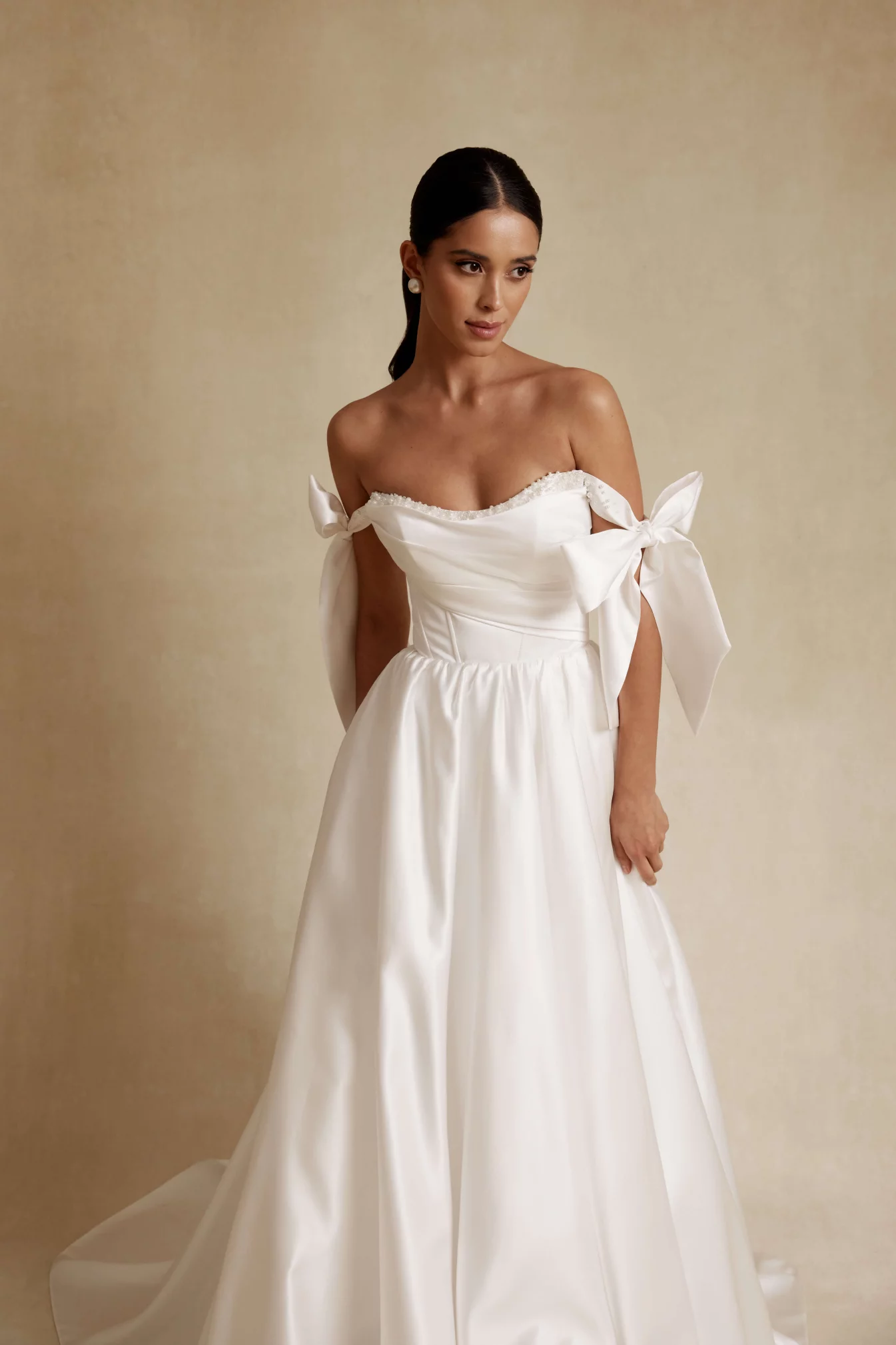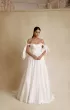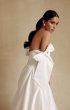 A silhouette wedding dress for your perfect wedding. The front of the corset is decorated with pearls along the neckline. The gown has detachable ties, which are partially embroidered with pearls. The skirt of the dress is multilayered and has a long train.