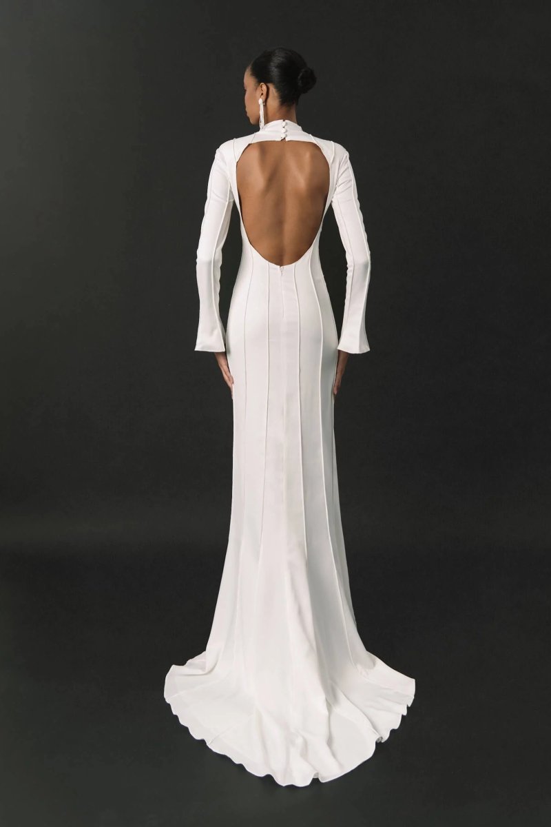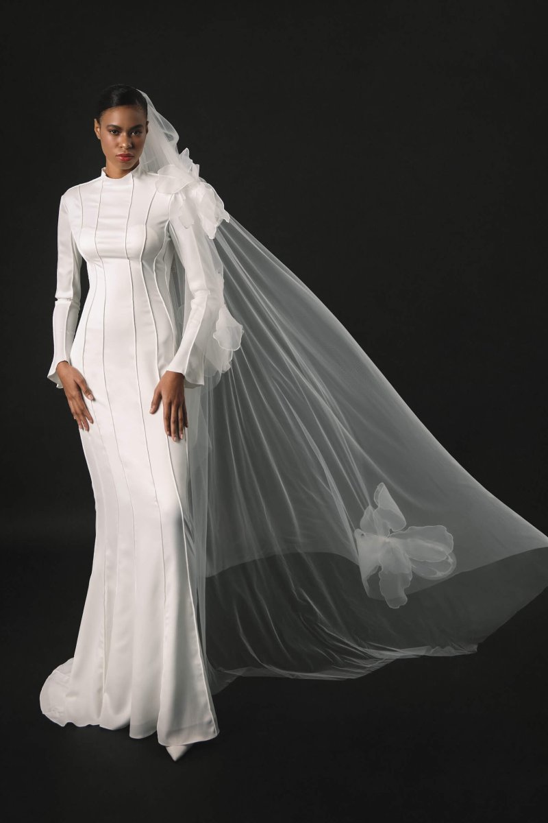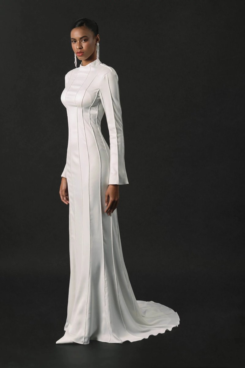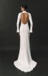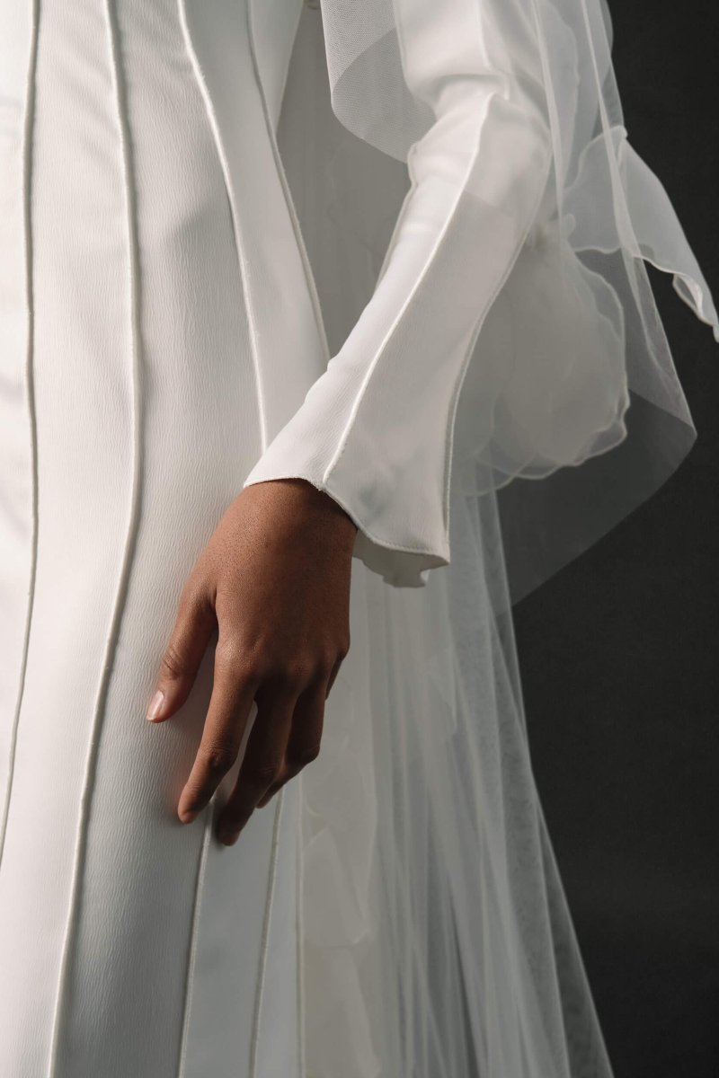 A refined form-fitting wedding dress adorned with unique relief patterns. The long, flared sleeves add an elegant touch, and the dense creamy crepe lining ensures comfort.