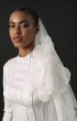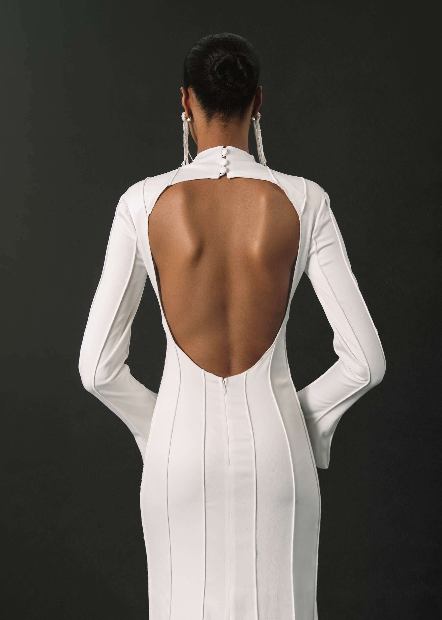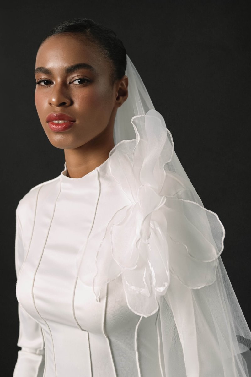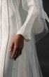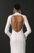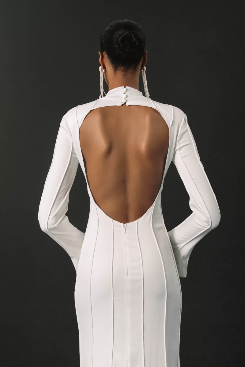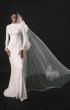 A refined form-fitting wedding dress adorned with unique relief patterns. The long, flared sleeves add an elegant touch, and the dense creamy crepe lining ensures comfort.