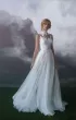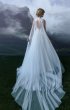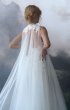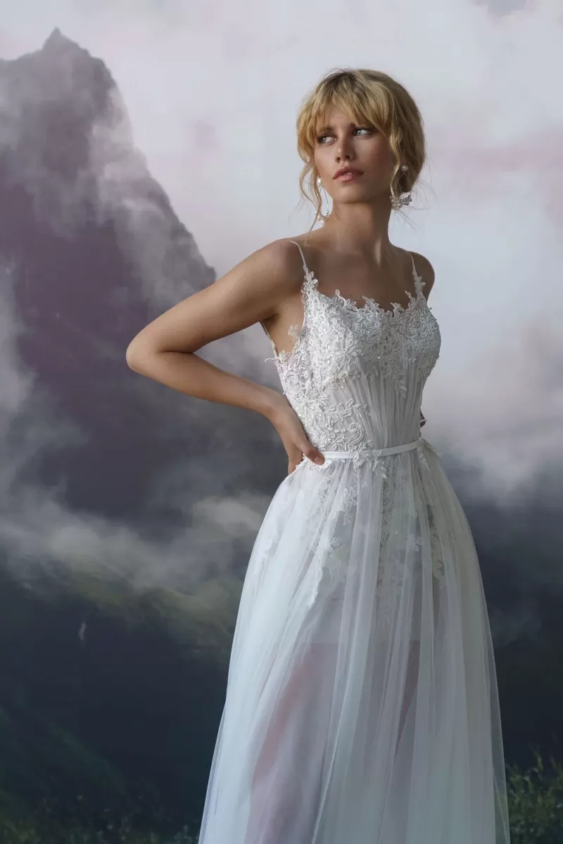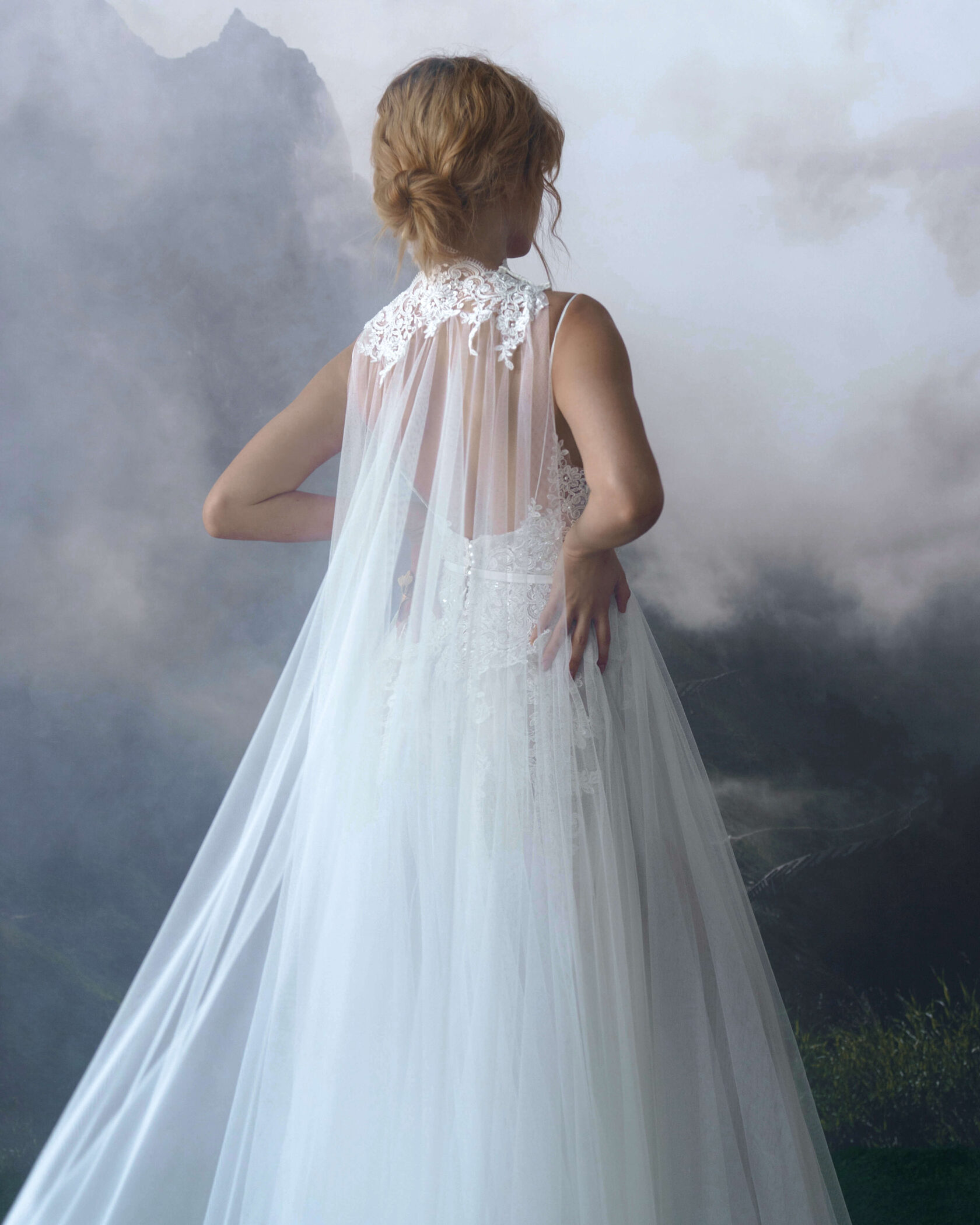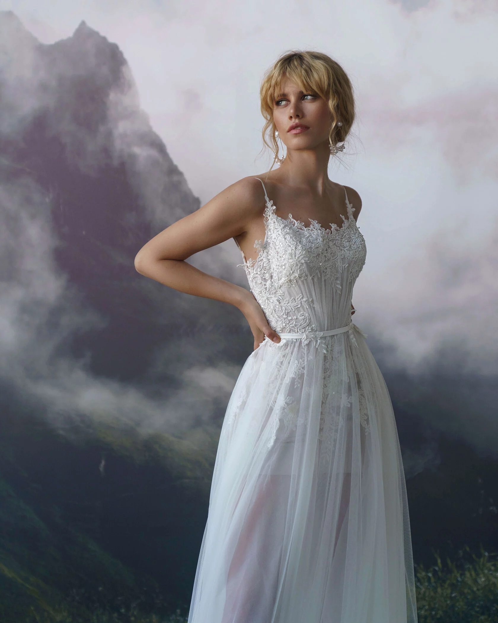 A-line wedding dress with a round neckline,the edges of which are covered with graceful twigs of lace. Thin straps accentuate the open back. Light drape narrows the waist.The waist line is framed with a narrow belt.Cape is offered as an addition.