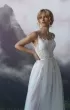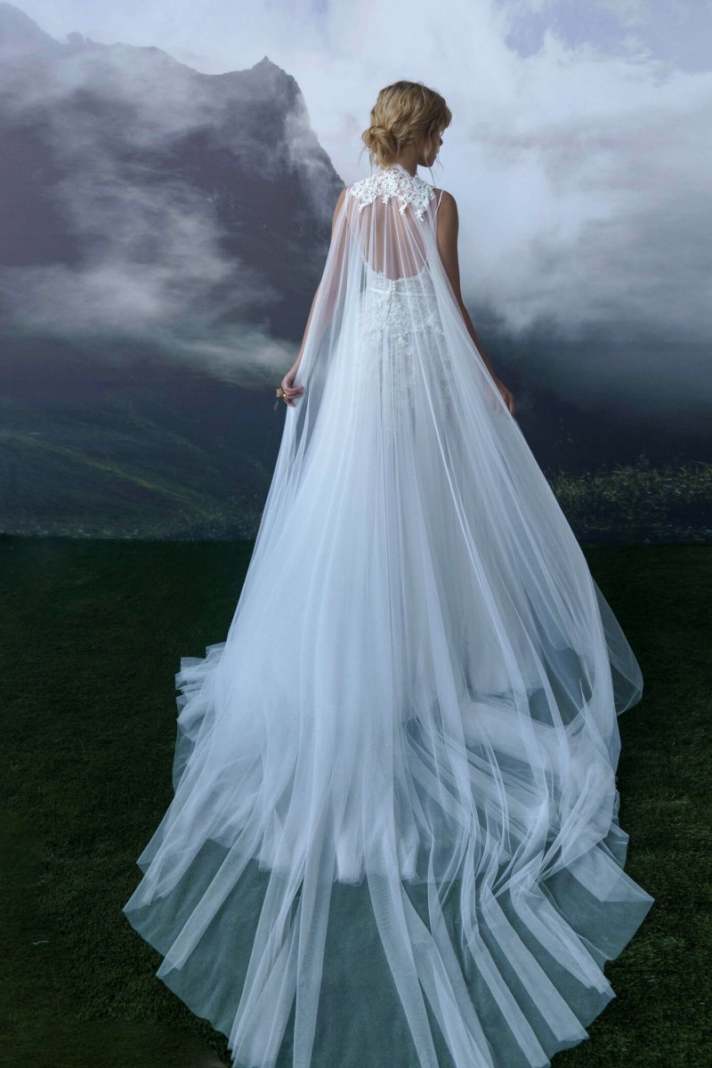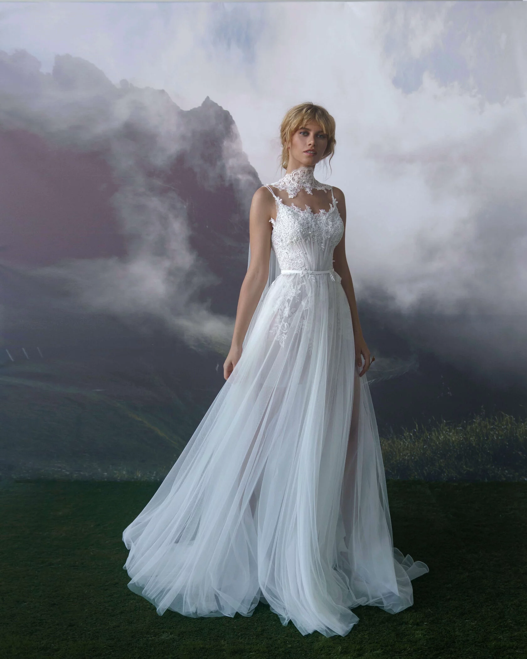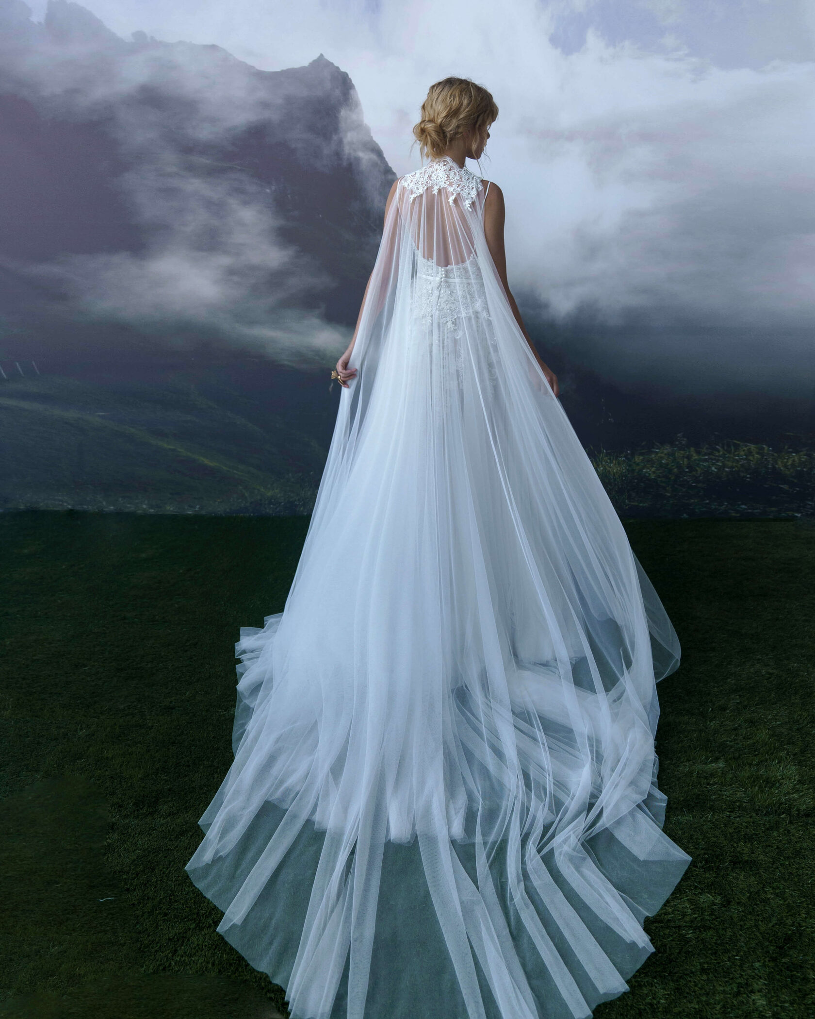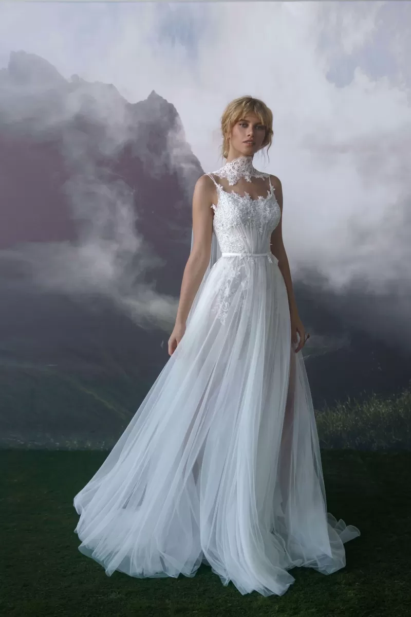 A-line wedding dress with a round neckline,the edges of which are covered with graceful twigs of lace. Thin straps accentuate the open back. Light drape narrows the waist.The waist line is framed with a narrow belt.Cape is offered as an addition.
