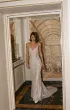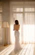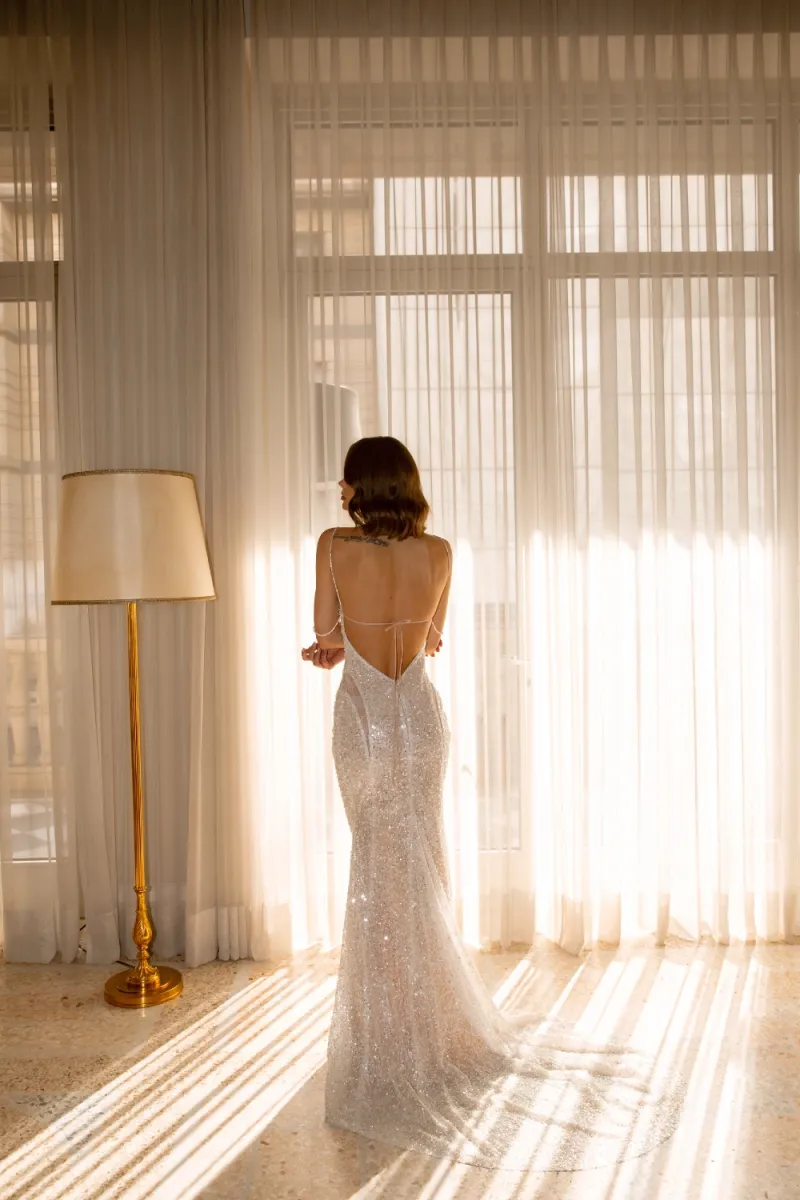 Mermaid-style wedding dress with a semi-sheer effect and a bustline seam. The bodice features molded cups and decorative straps — one with pearls, the other with a rhinestone chain — transitioning into a lace-up back. Vertical seams are accented with transparent Chantilly inserts, creating a slip-like silhouette. The long skirt flares from the knee with a train extended by a godet, and includes sheer panels and a powder-toned crepe lining. Milk-toned variation available.