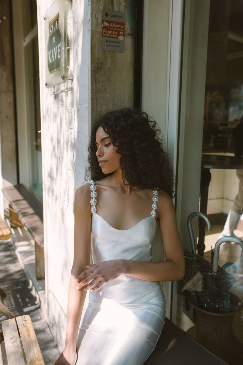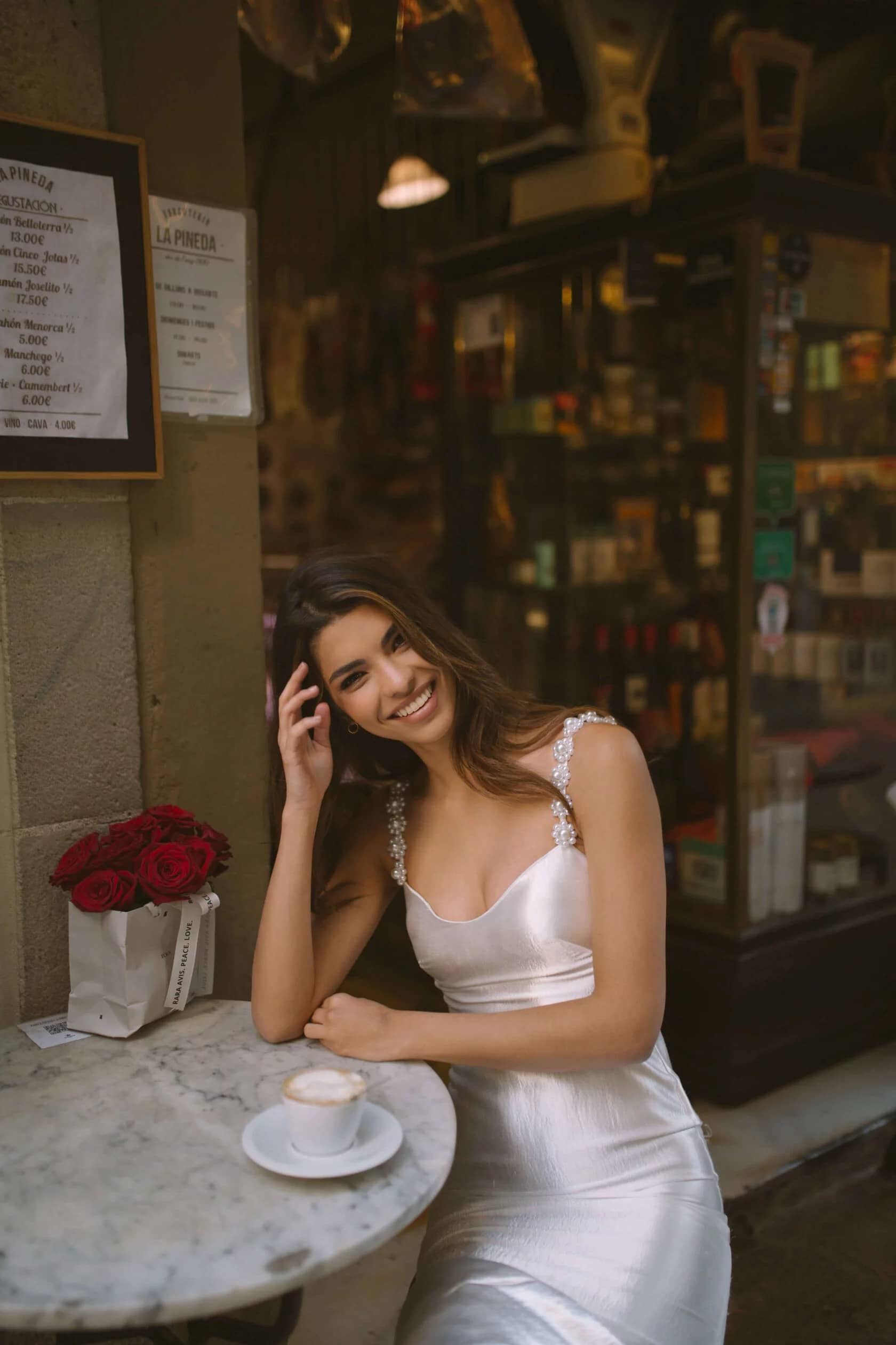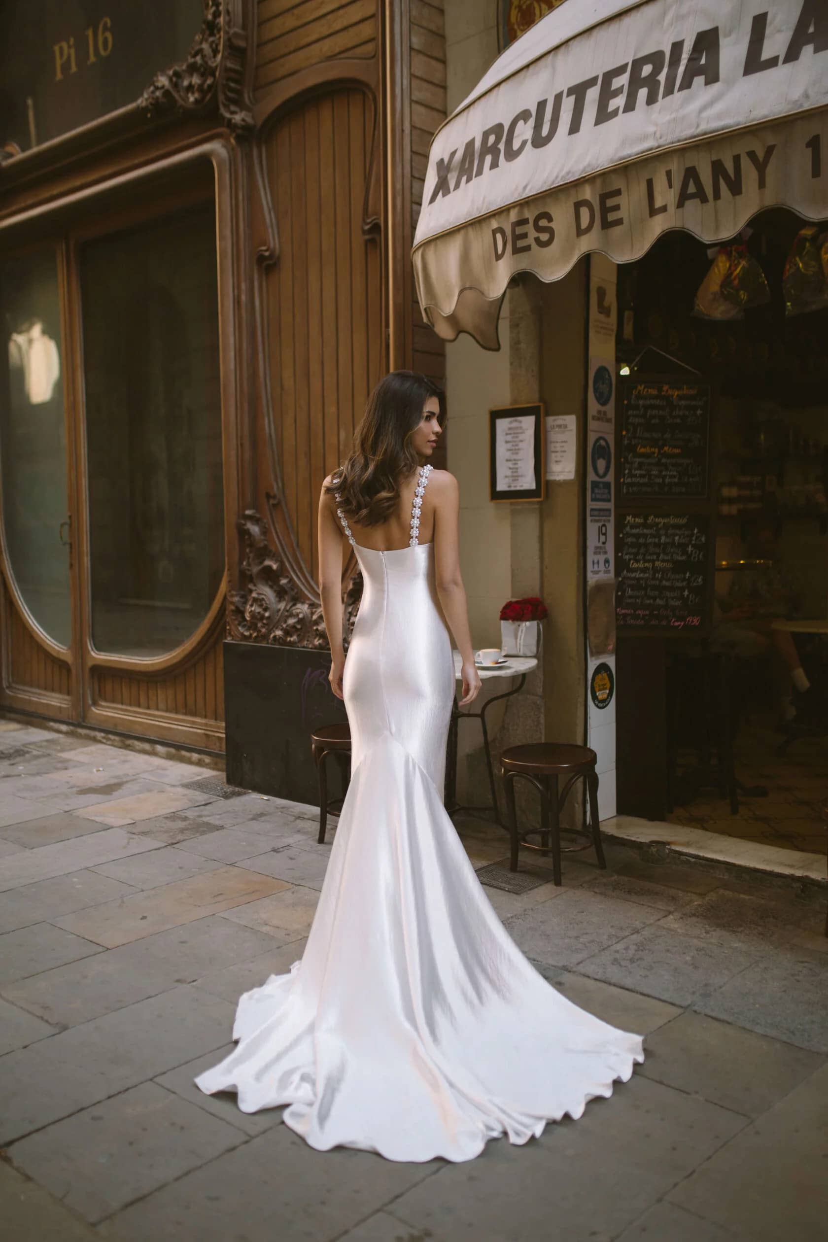 Wedding dress has a mermaid silhouette .Dress bodice with inner cups. Dress with thin straps. The shoulder straps are completely decorated with handmade decor - weaving in the form of flowers from pearl beads.