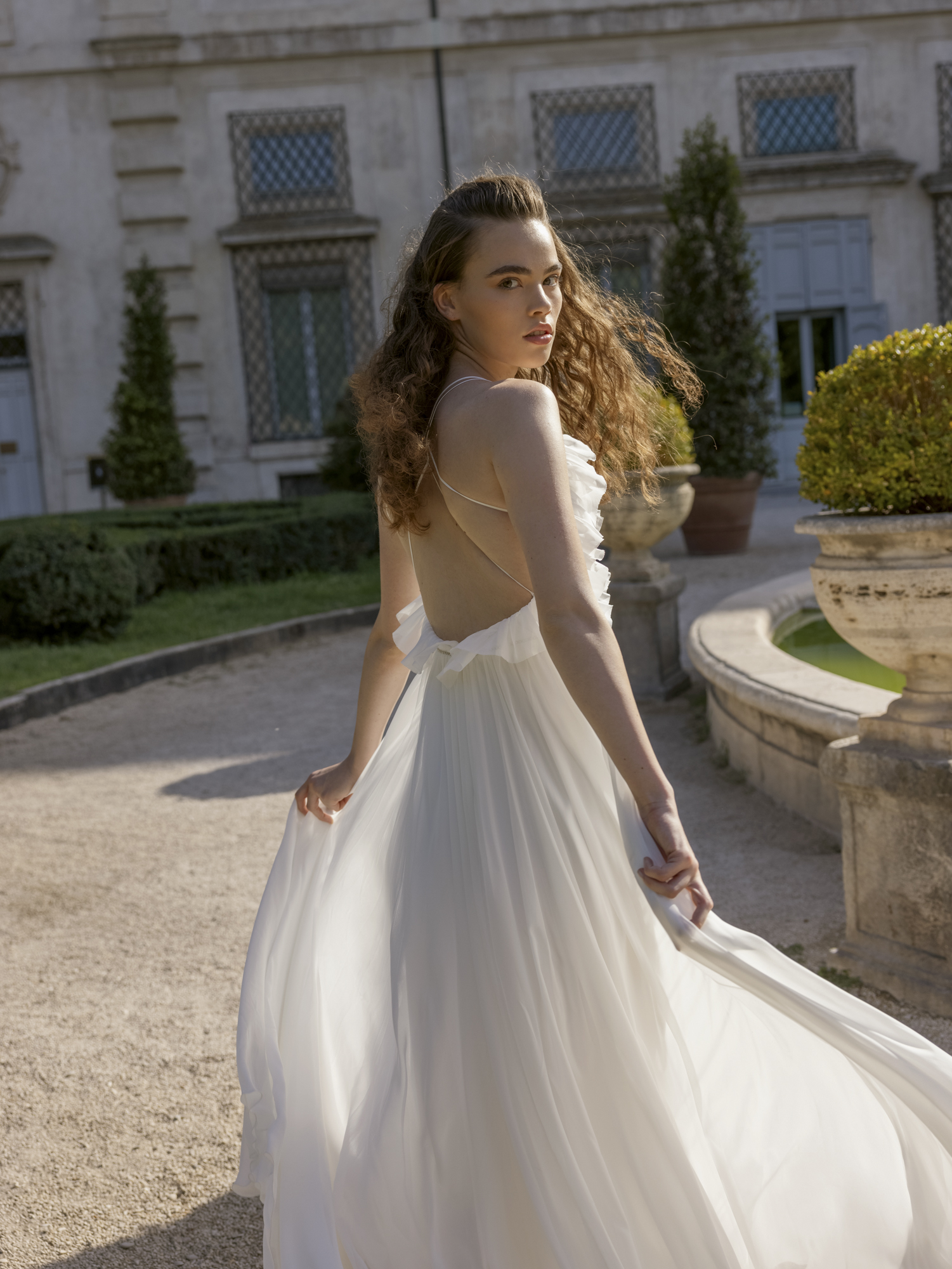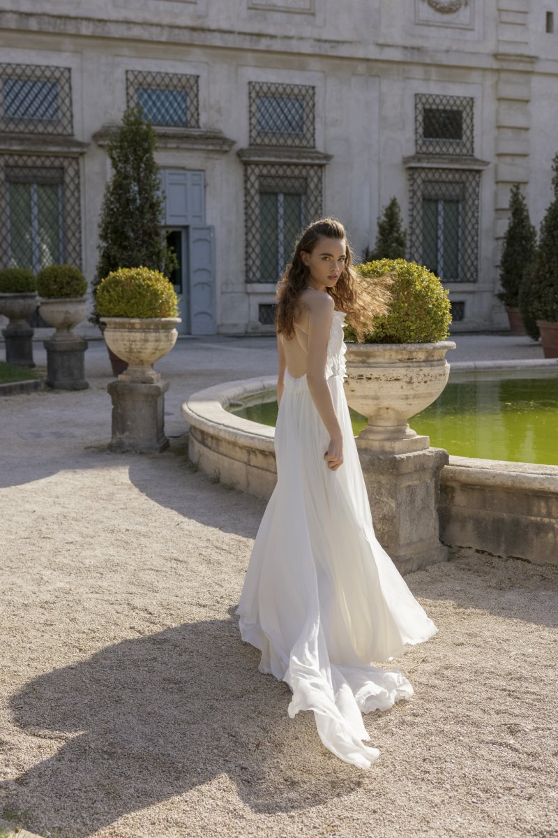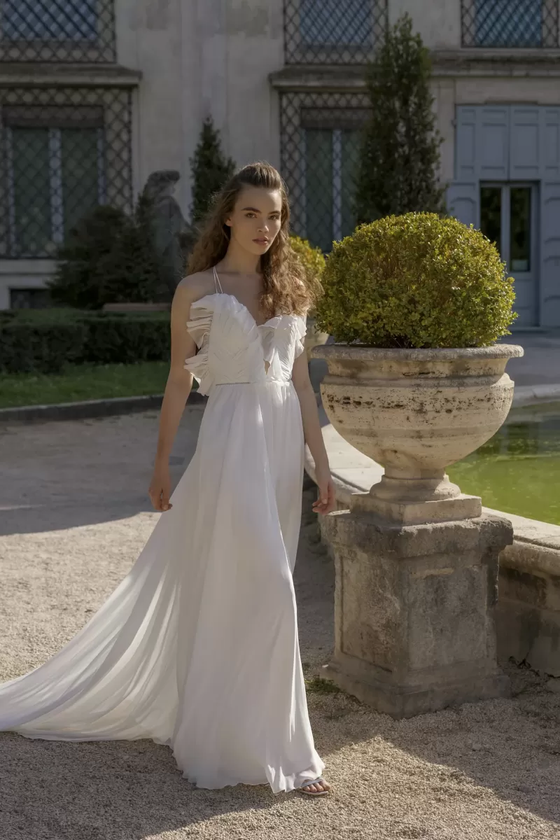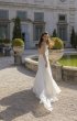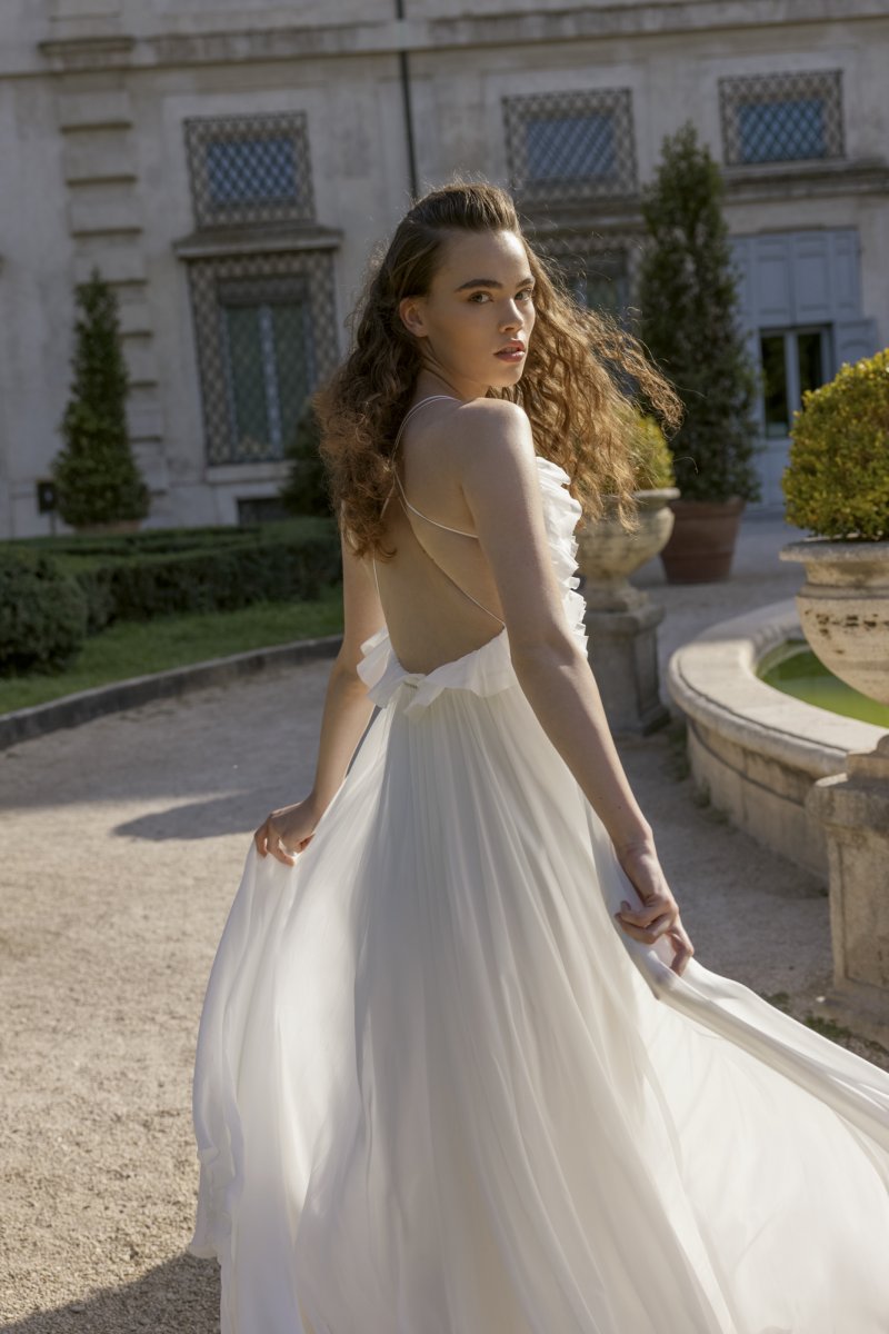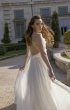 A-line dress. Embossed corset dress with a deep V neckline on the front and open back. Hook-and-loop closure at the waist. The waistline is accentuated with rhinestones. The skirt is multi-layered with an extension to the bottom.