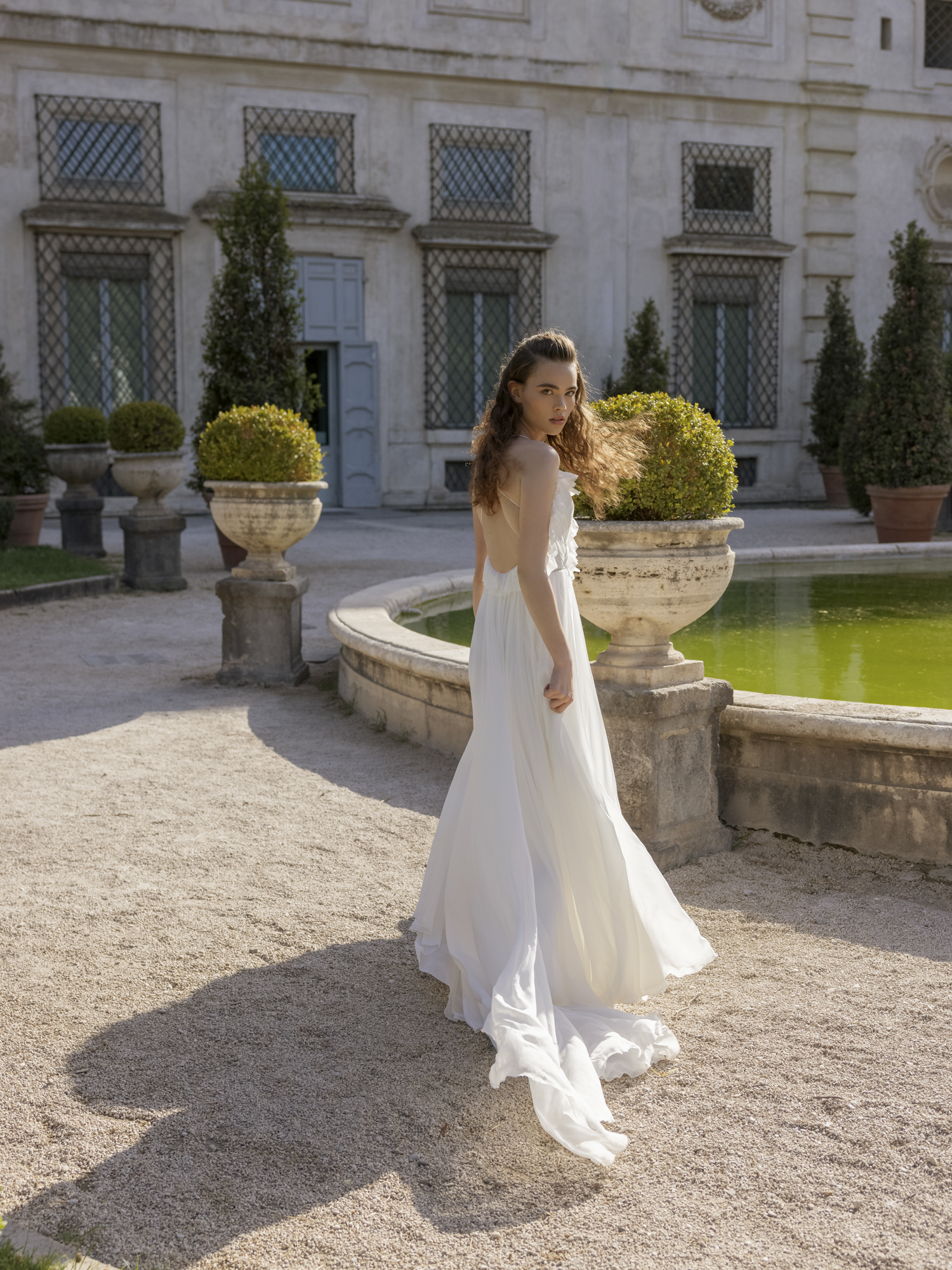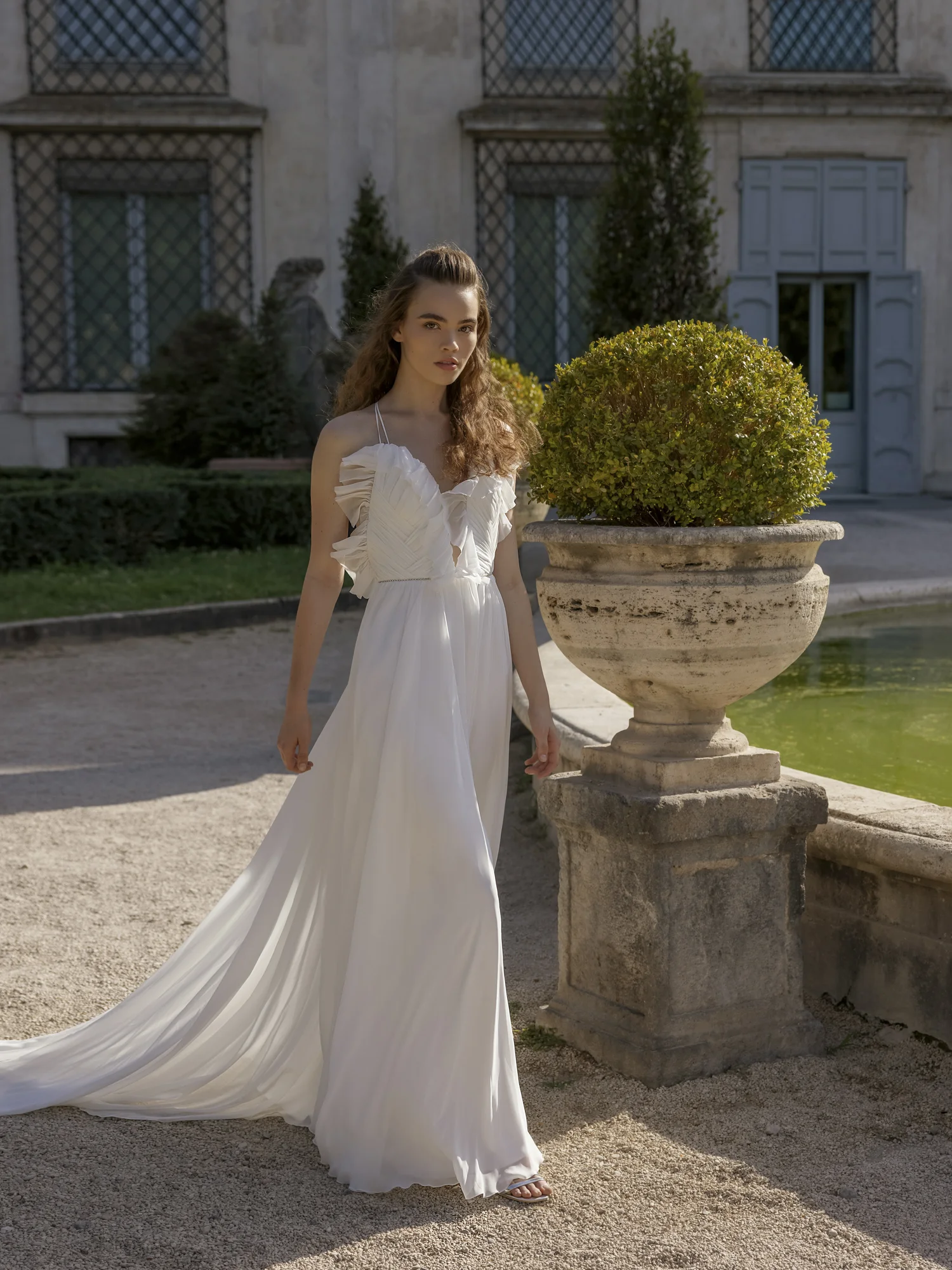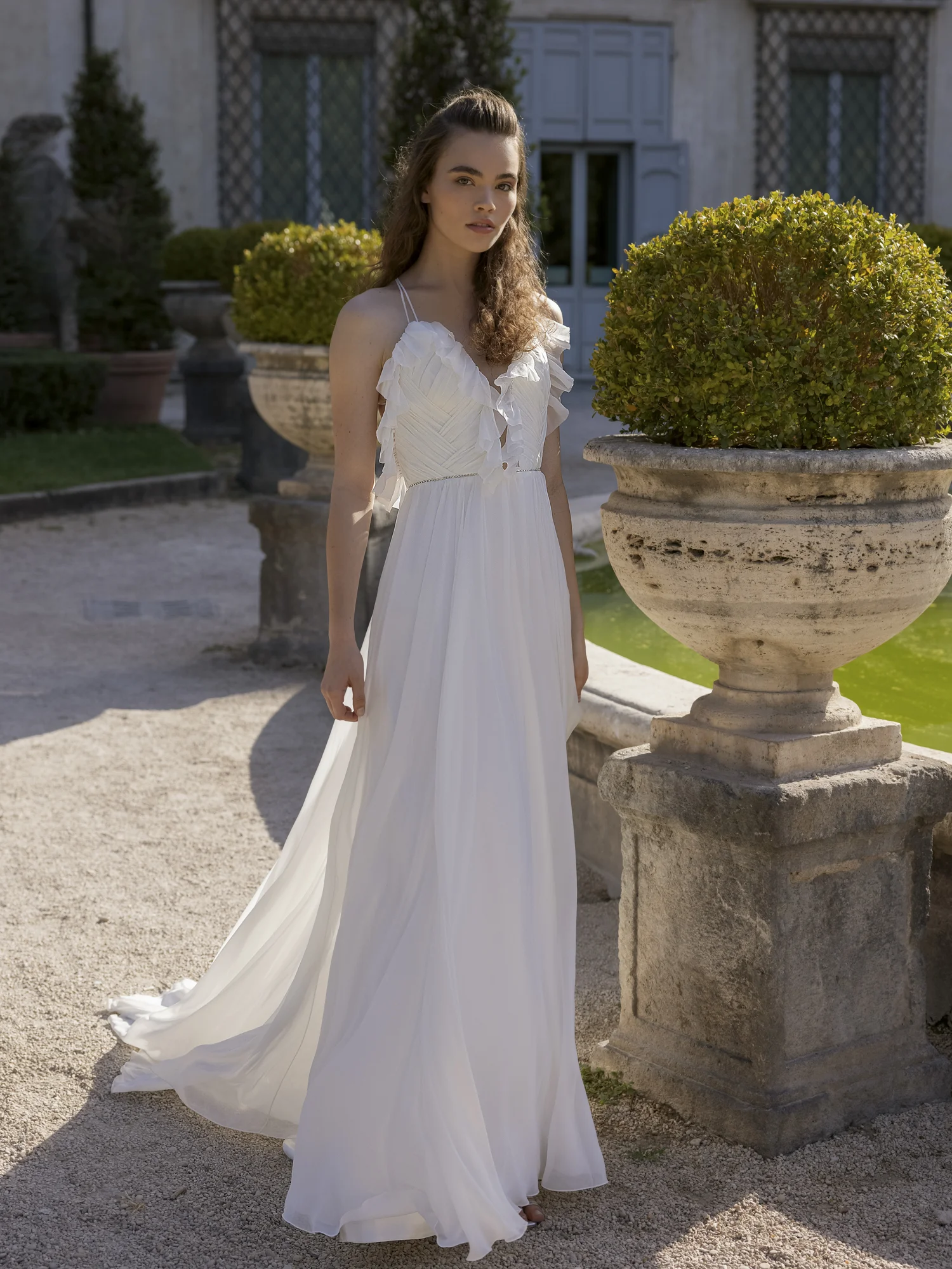 A-line dress. Embossed corset dress with a deep V neckline on the front and open back. Hook-and-loop closure at the waist. The waistline is accentuated with rhinestones. The skirt is multi-layered with an extension to the bottom.