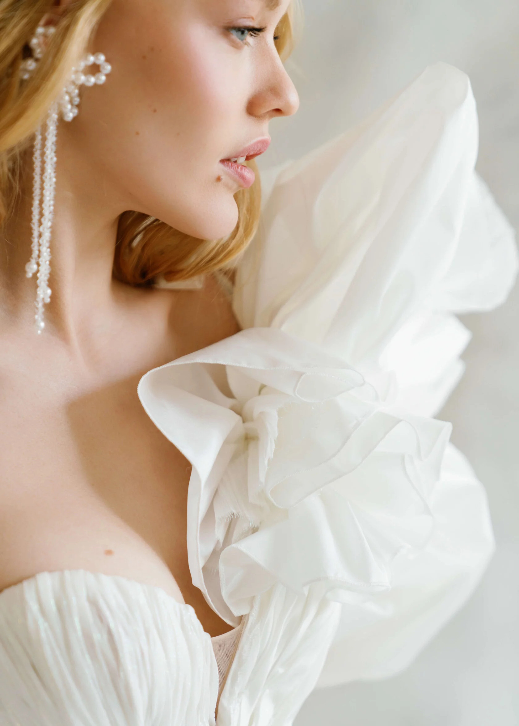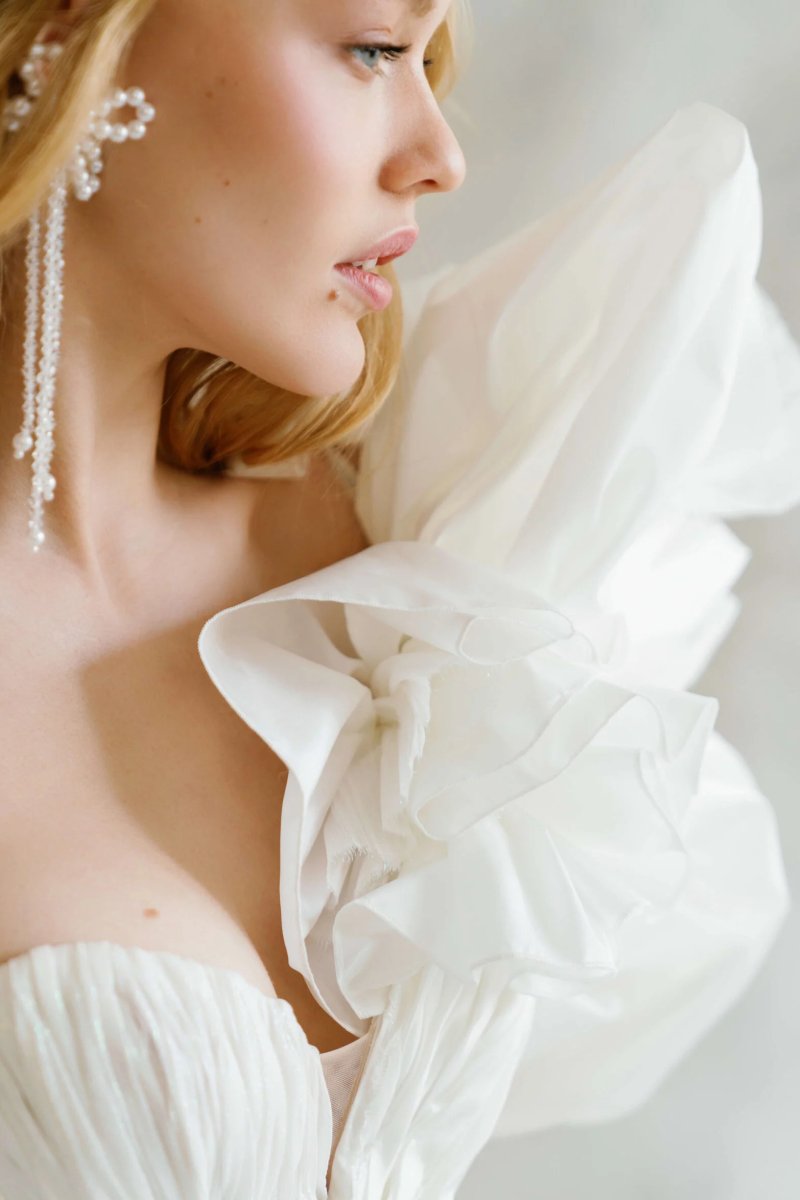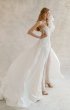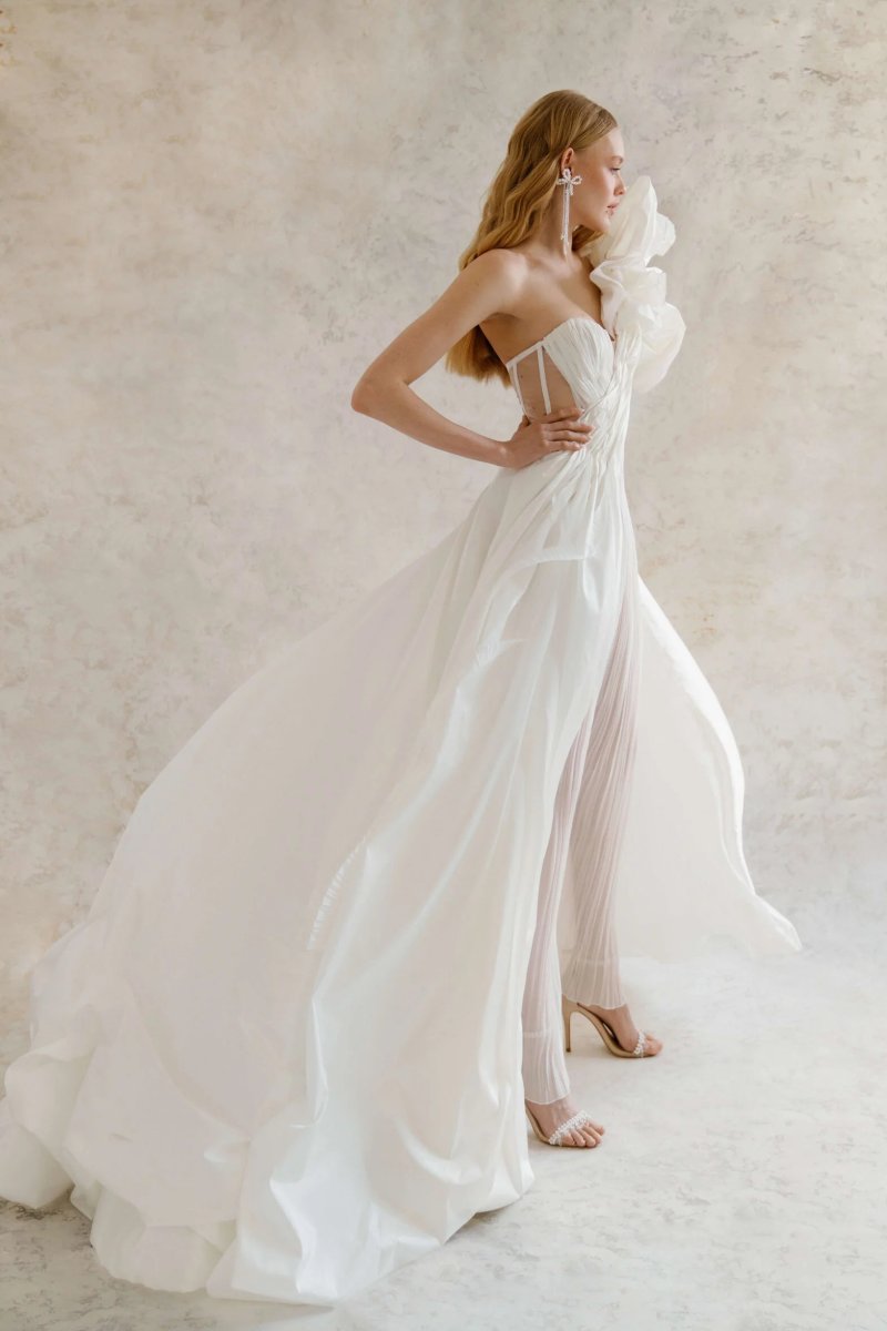 Light wedding dress is made of natural silk with metalized thread. The upper skirt is voluminous, made of taffeta, with bouffants at the bottom.