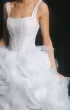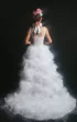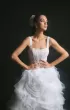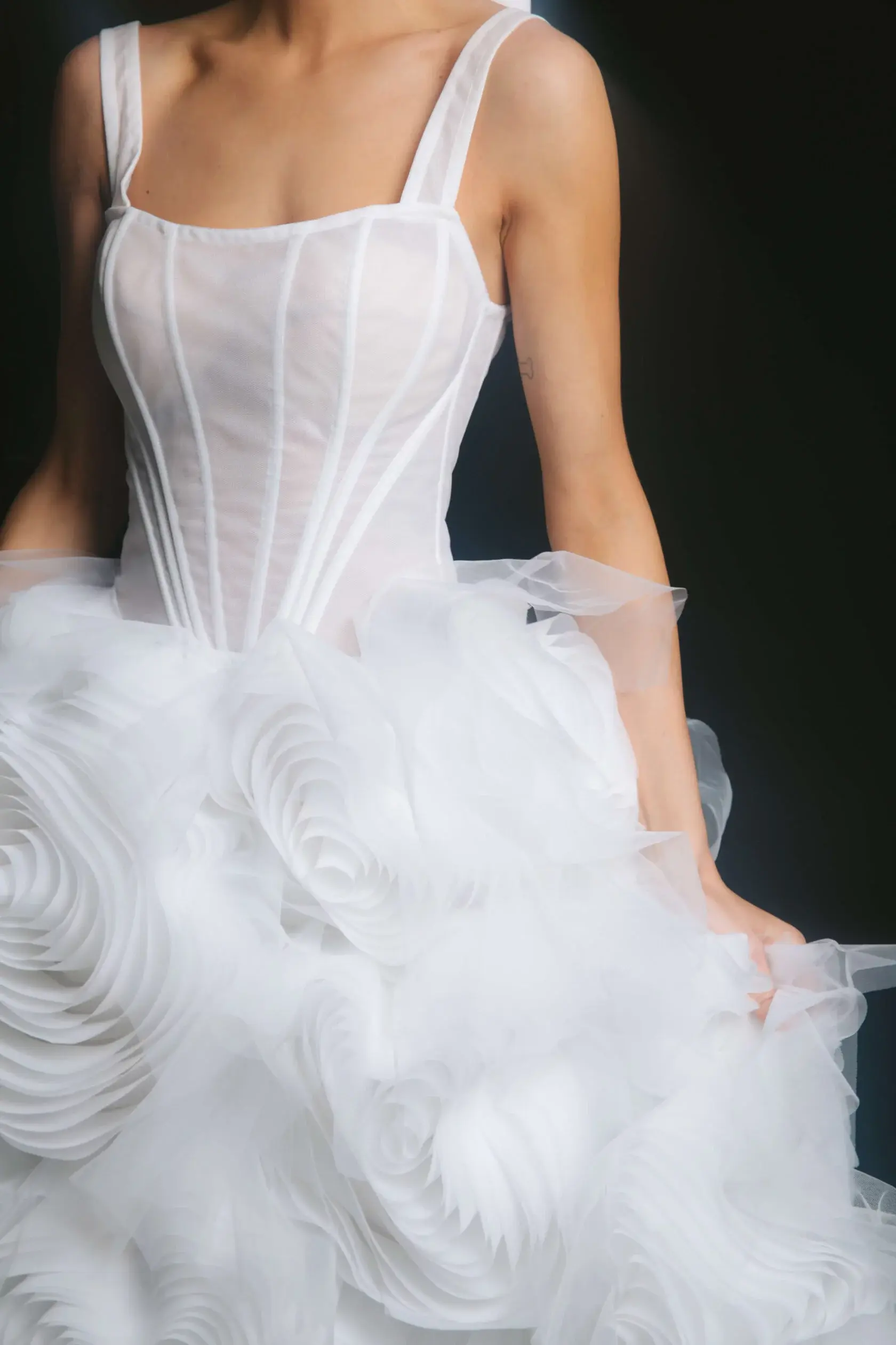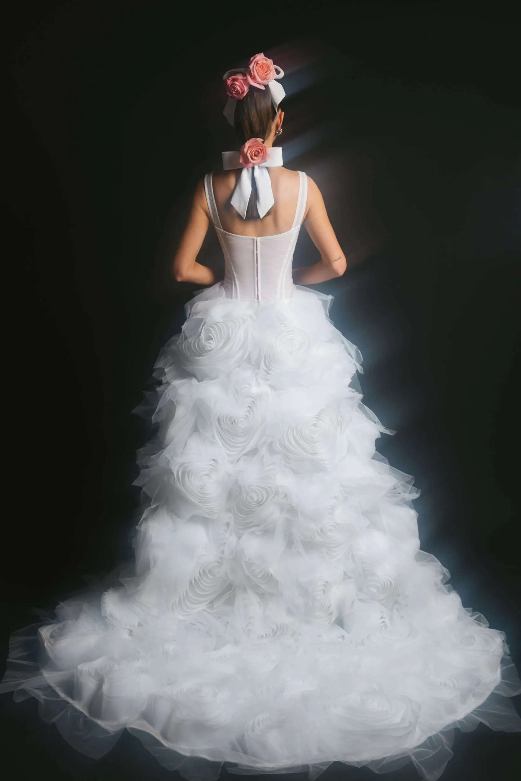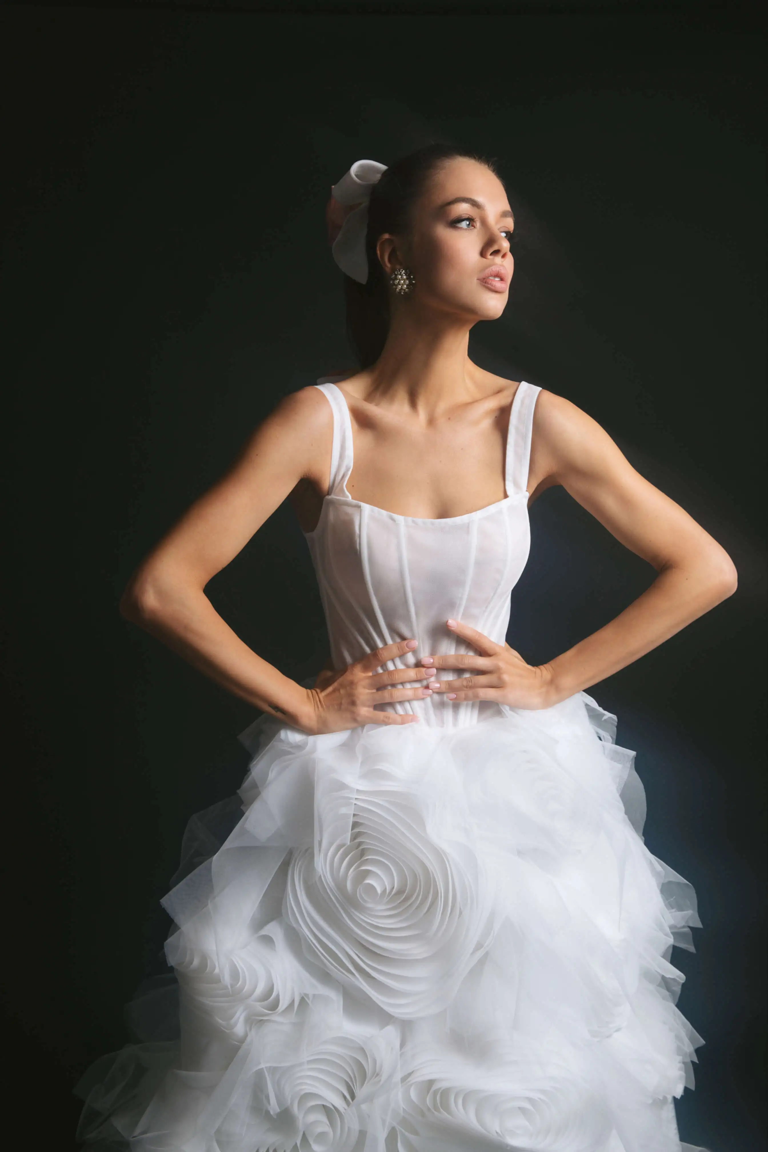 Wedding dress with a fluffy skirt and translucent corset. The long train skirt is chaotically embroidered with flowers.