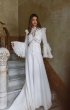 A-line dress with train.The bodice is soft and lined. Front with a shallow V-neckline. The back, open in the form of a rhombus. On the front, a stand-up collar with ties, on the back with a fastener with buttonholes.Sleeves are long. Skirt with a curly yoke, embroidered with lace and buttons. A-line skirt, with a slit along the central seam in front of the skirt.