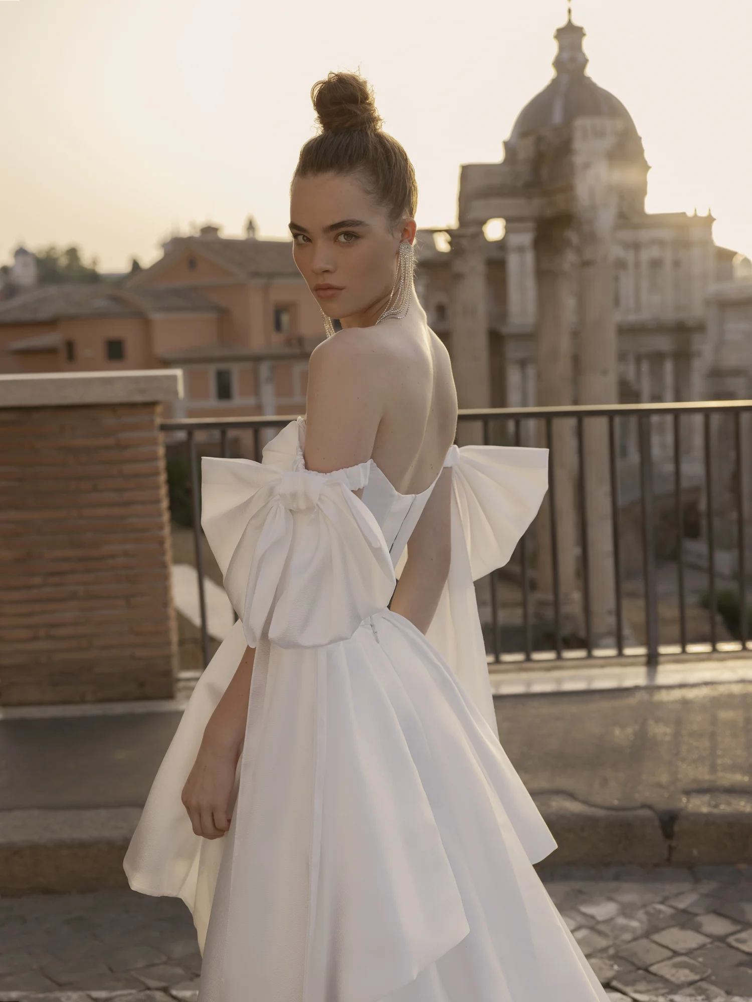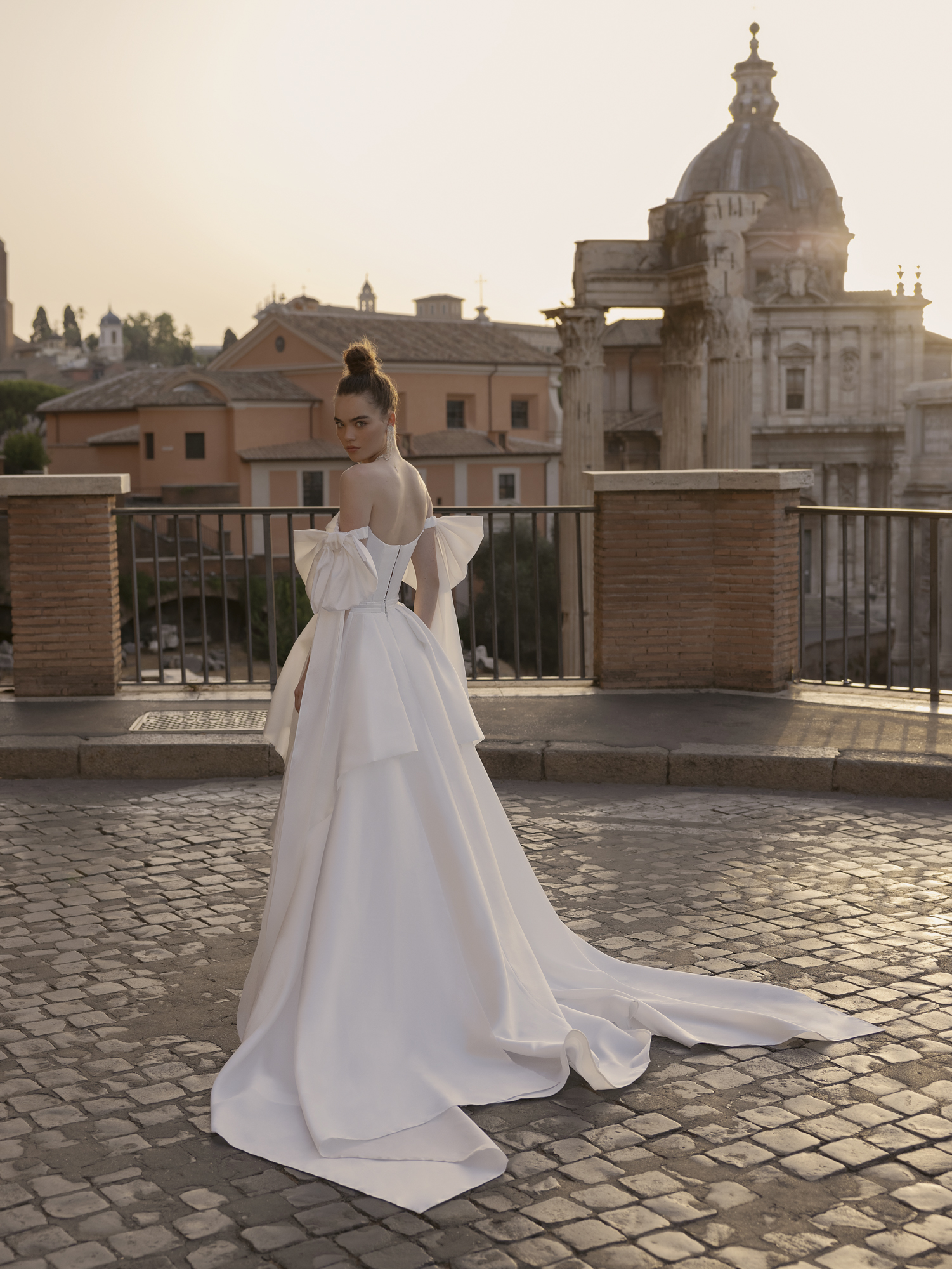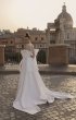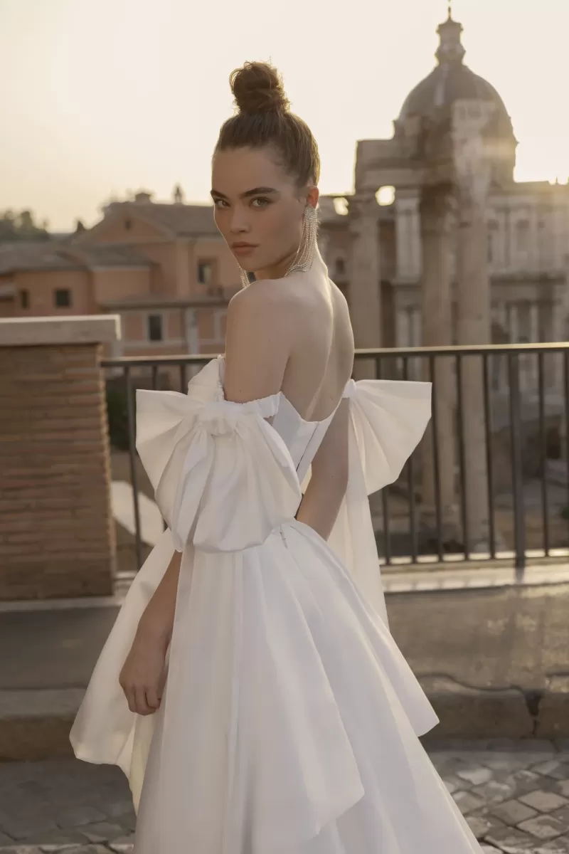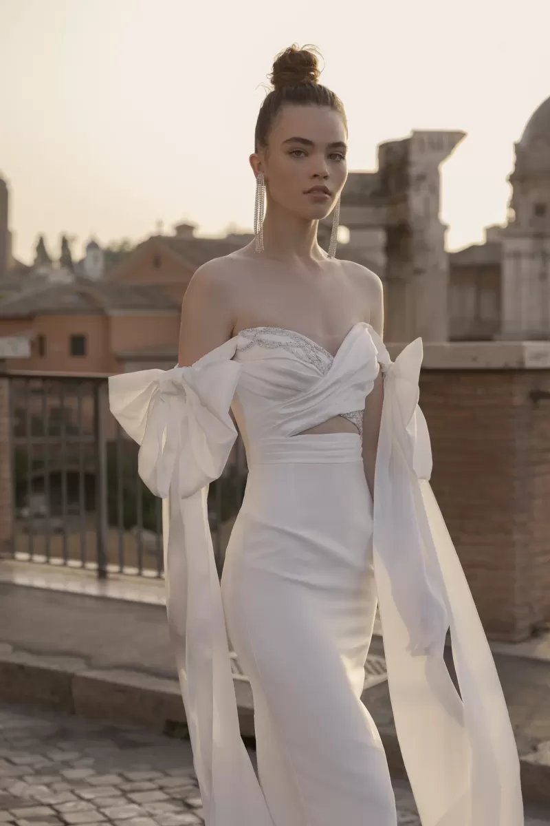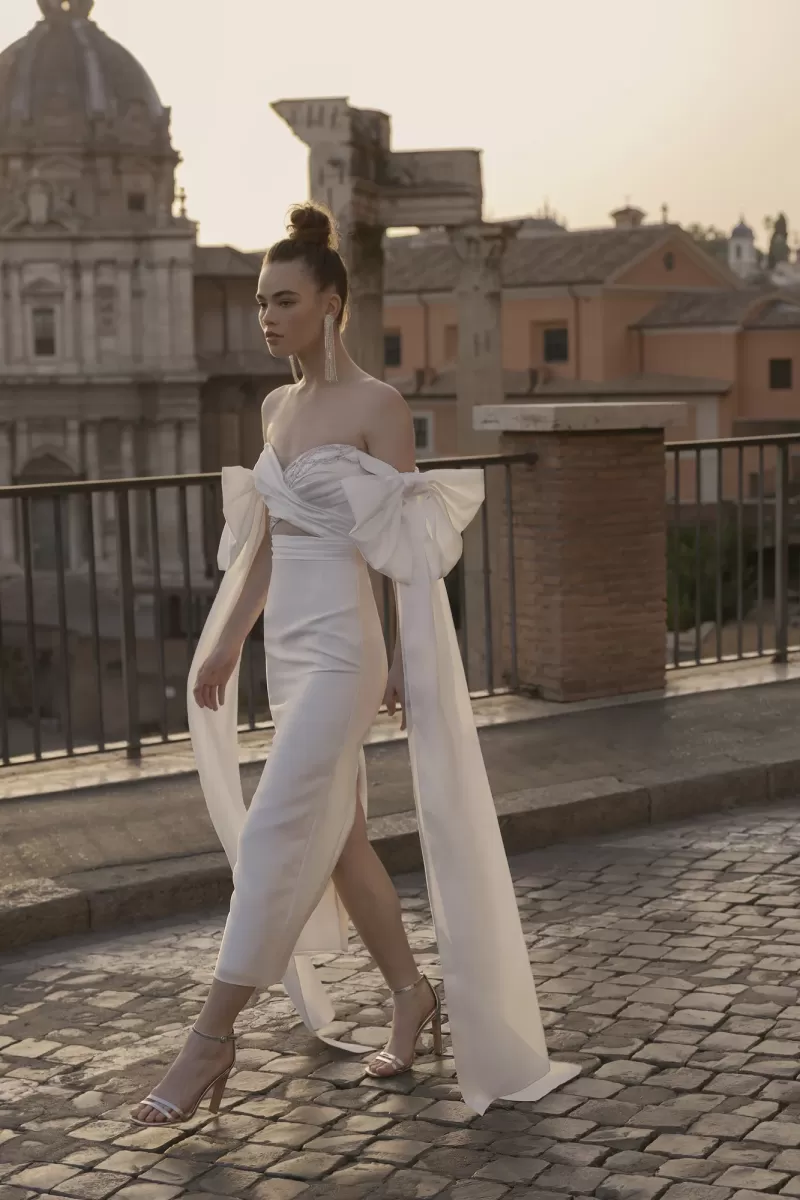 Long midi dress, straight silhouette. Embossed corset with lowered shoulder straps. The corset is decorated with asymmetrical embroidery. Volumetric bows on the shoulder straps - removable. The image is complemented by a detachable multi-layered long maxi skirt.