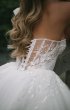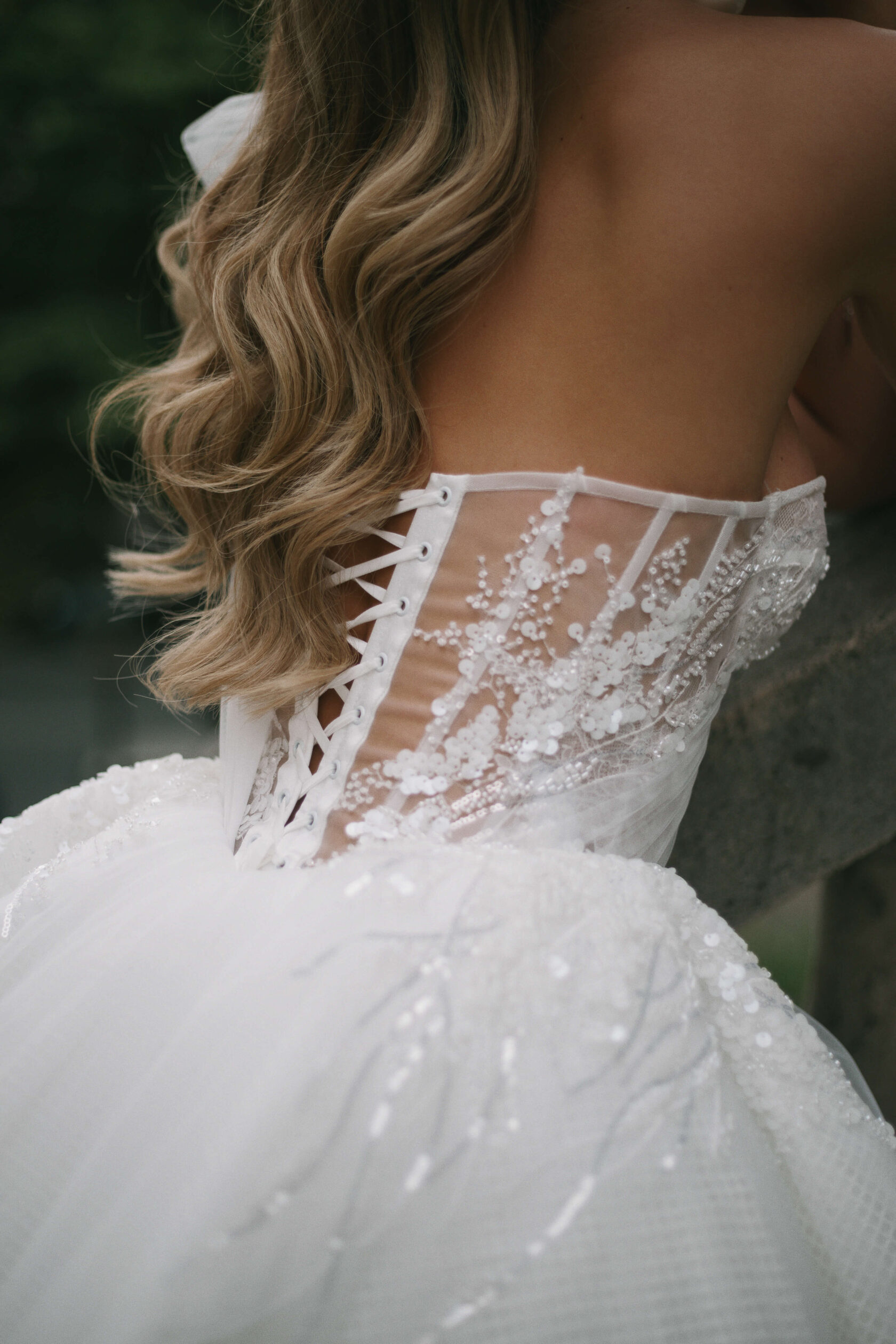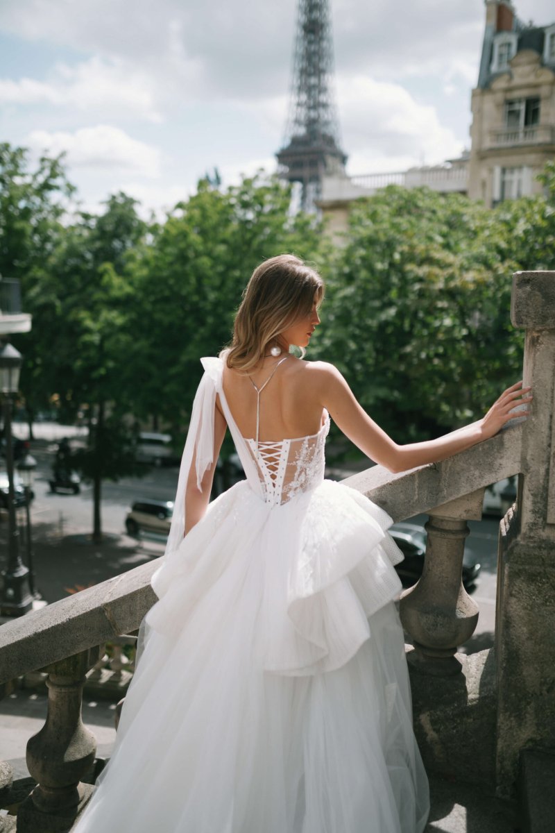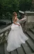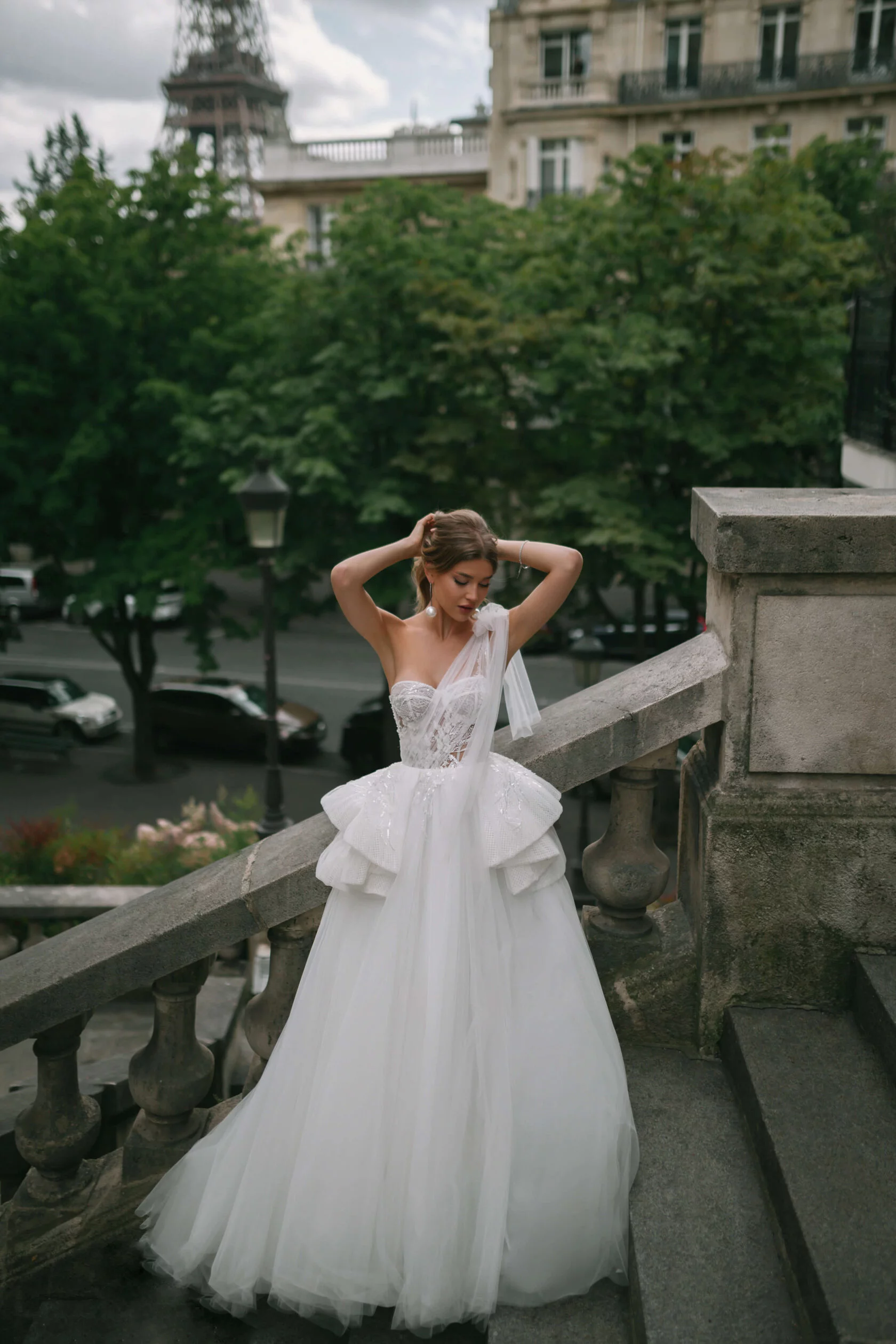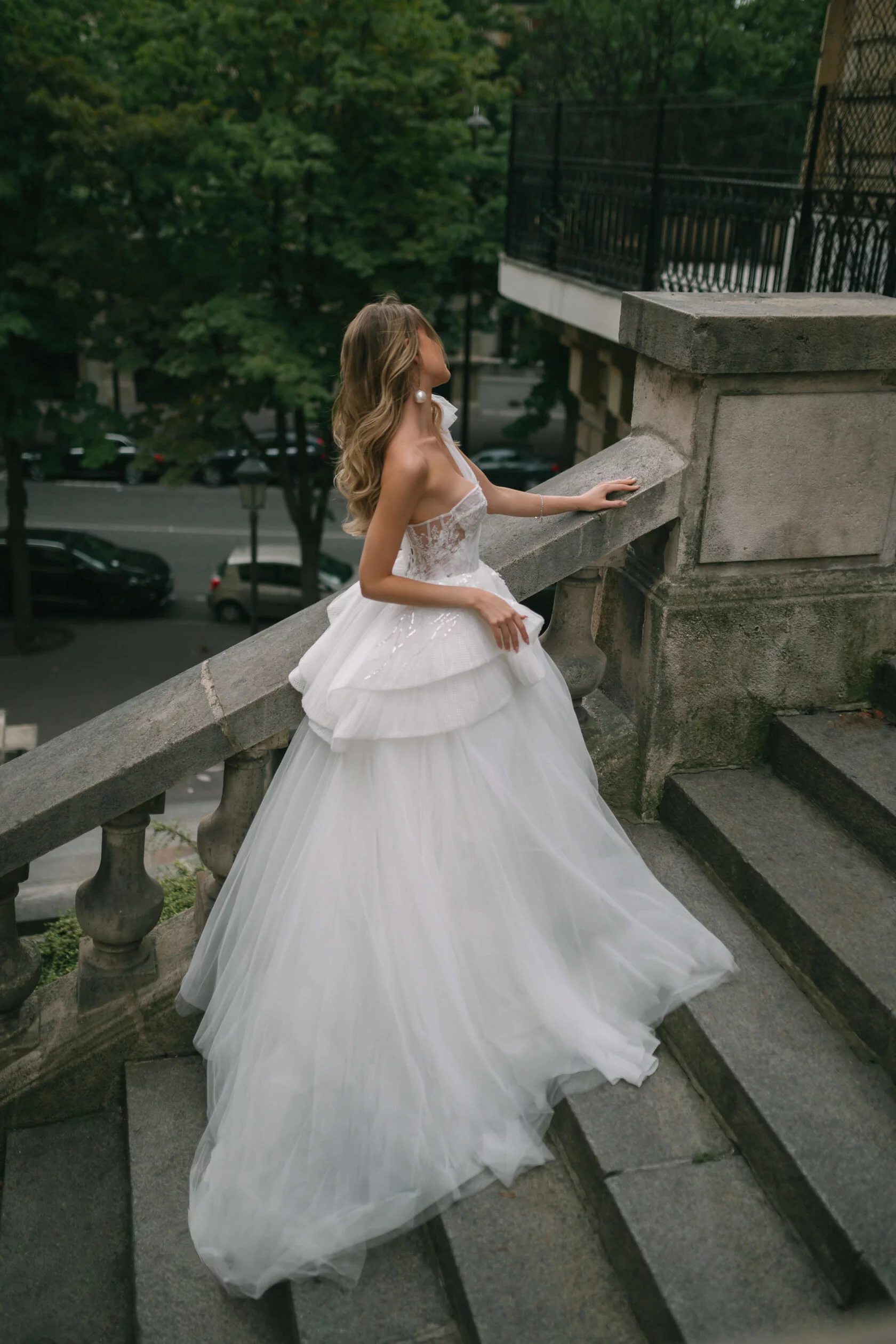 A silhouetted lush wedding dress with a long train. The skirt of the dress is decorated with flounces of different levels.