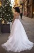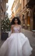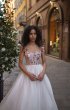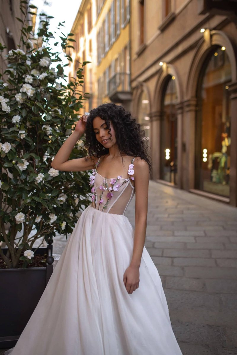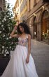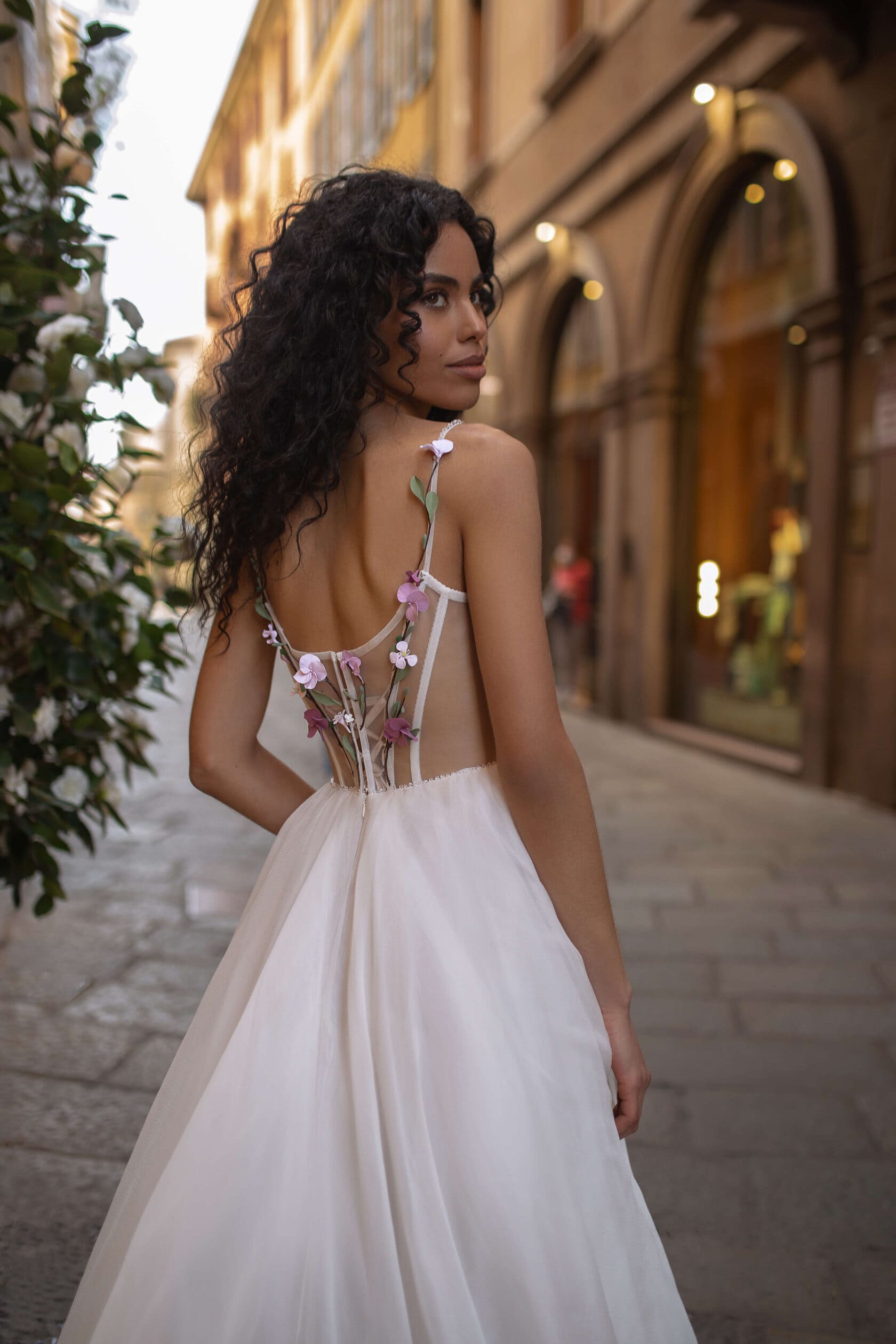 A-line dress with train.Relief corset, without cups. The corset is translucent, lined at the front. The corset is fully decorated with handmade decorations from Japanese clay. The skirt is multi-layered, moderately fluffy.