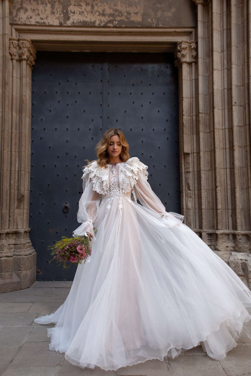 Dress with an A-line skirt with a train.The bodice is translucent, soft. In the center of the front of the bodice is an embroidered organza insert embroidered with colored glass beads. The back is open.The sleeves are long with gathering at the collar.On the back of the skirt is a printed organza bow.