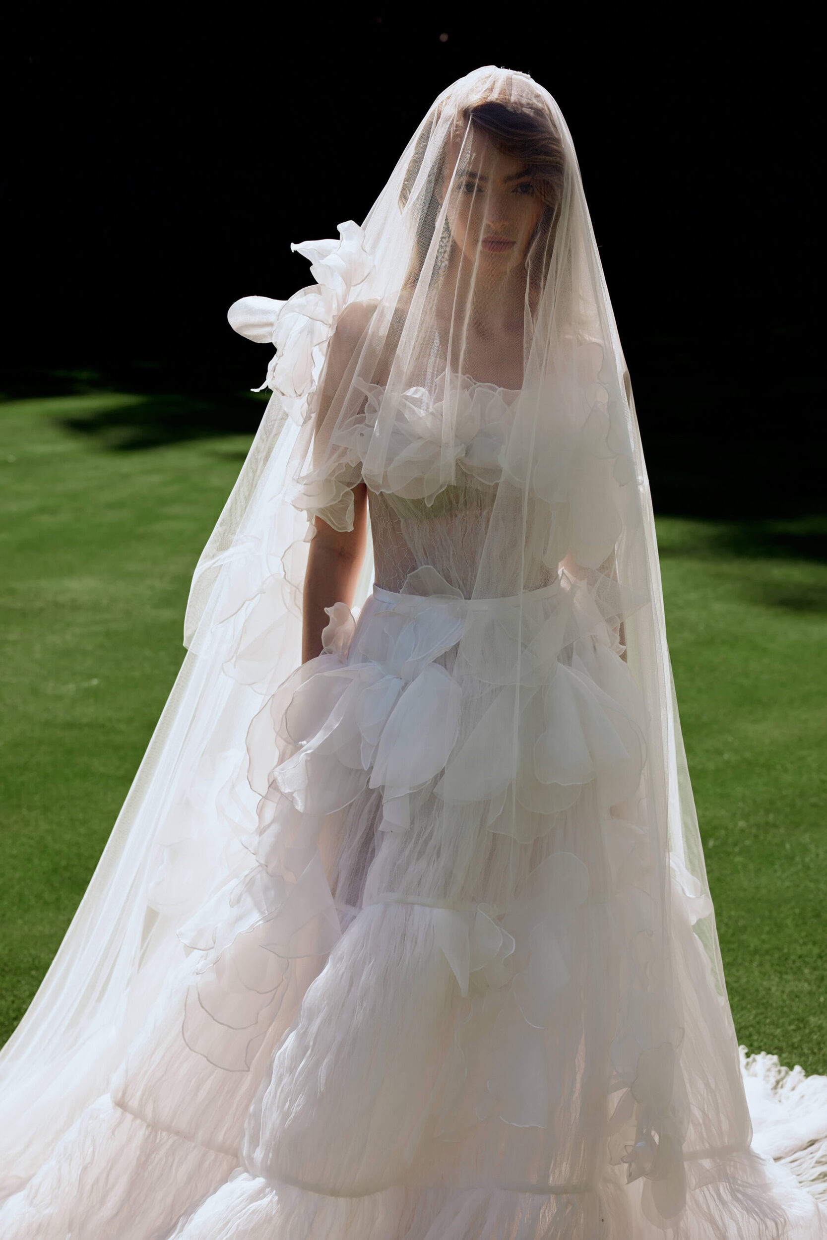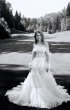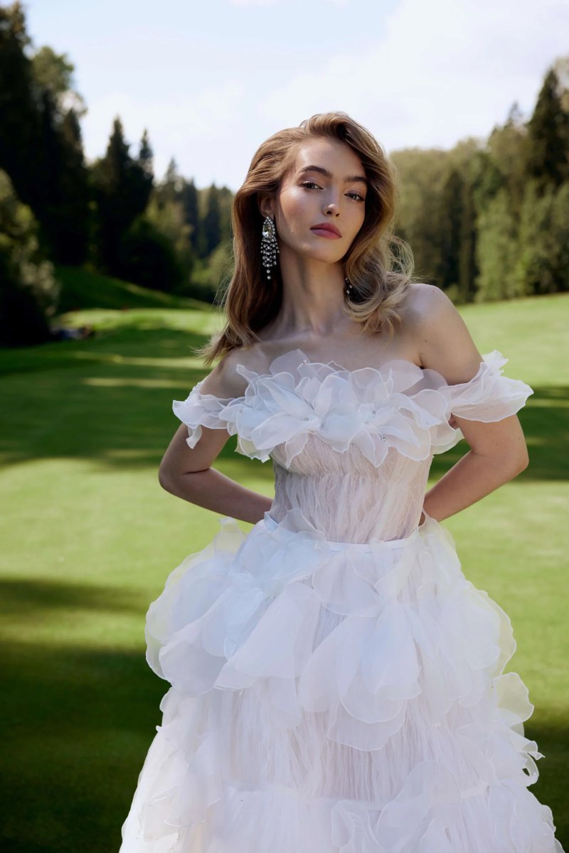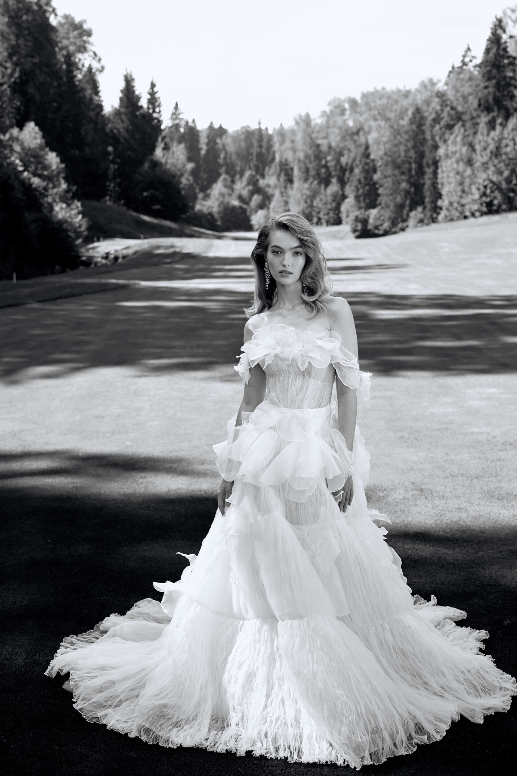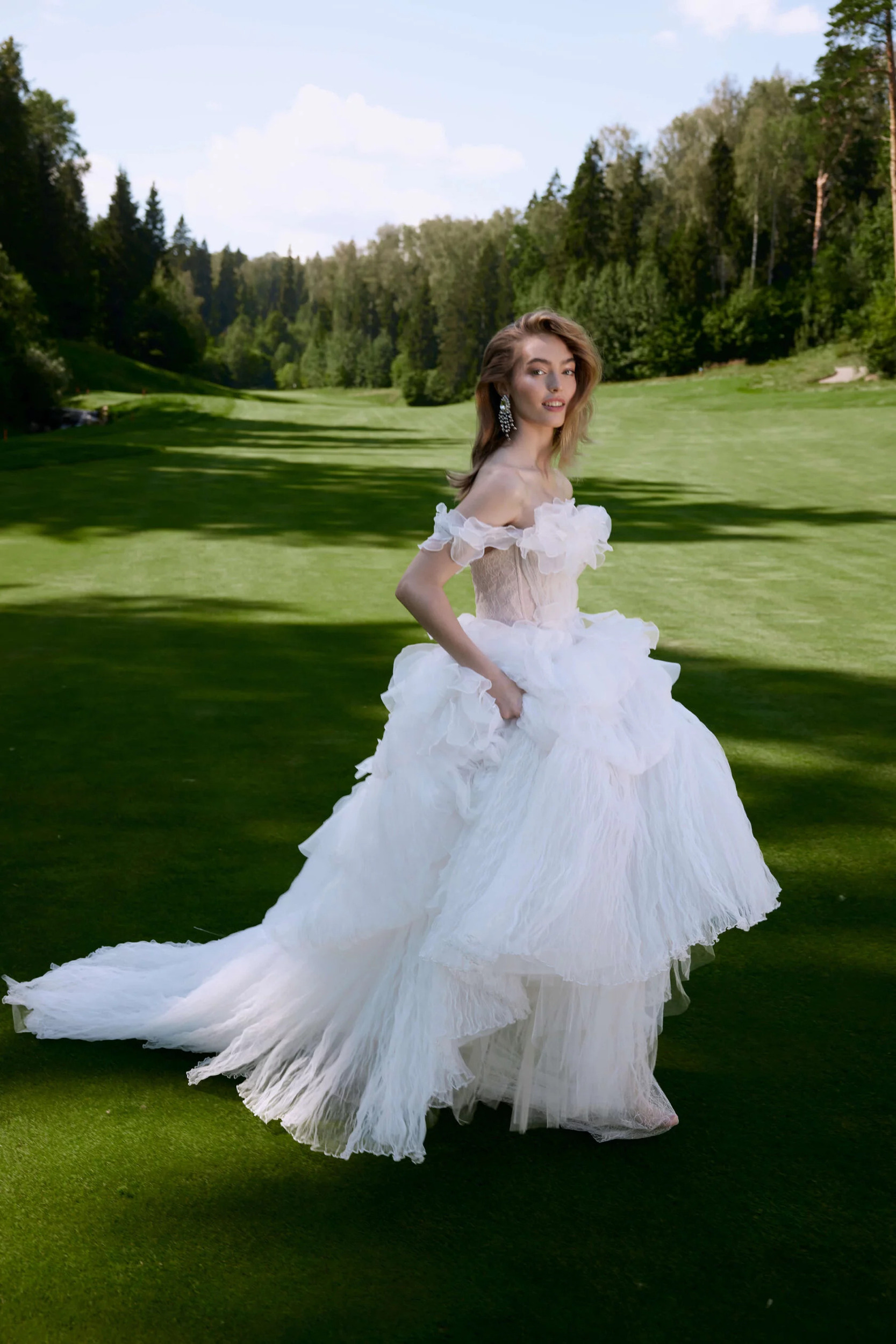 A-line wedding dress with an elegant corset adorned with relief patterns and floral decoration. The corset features a molded cup, satin covering, and beautiful petal straps. The skirt has a long train.