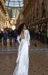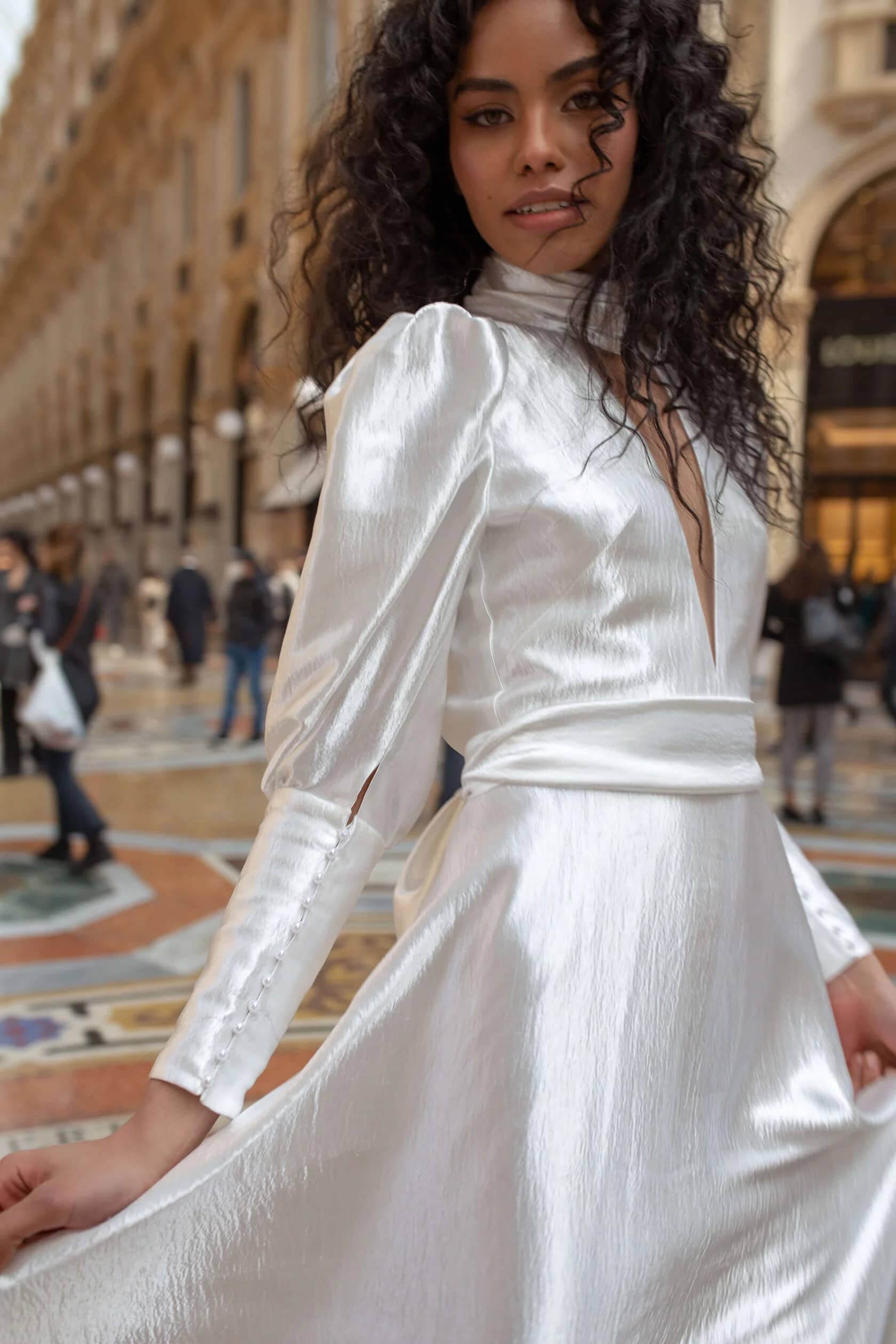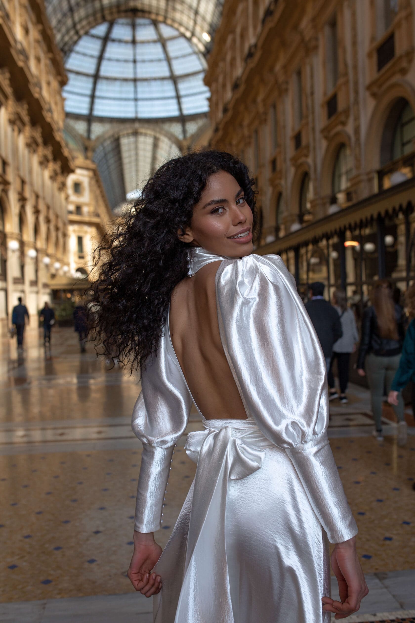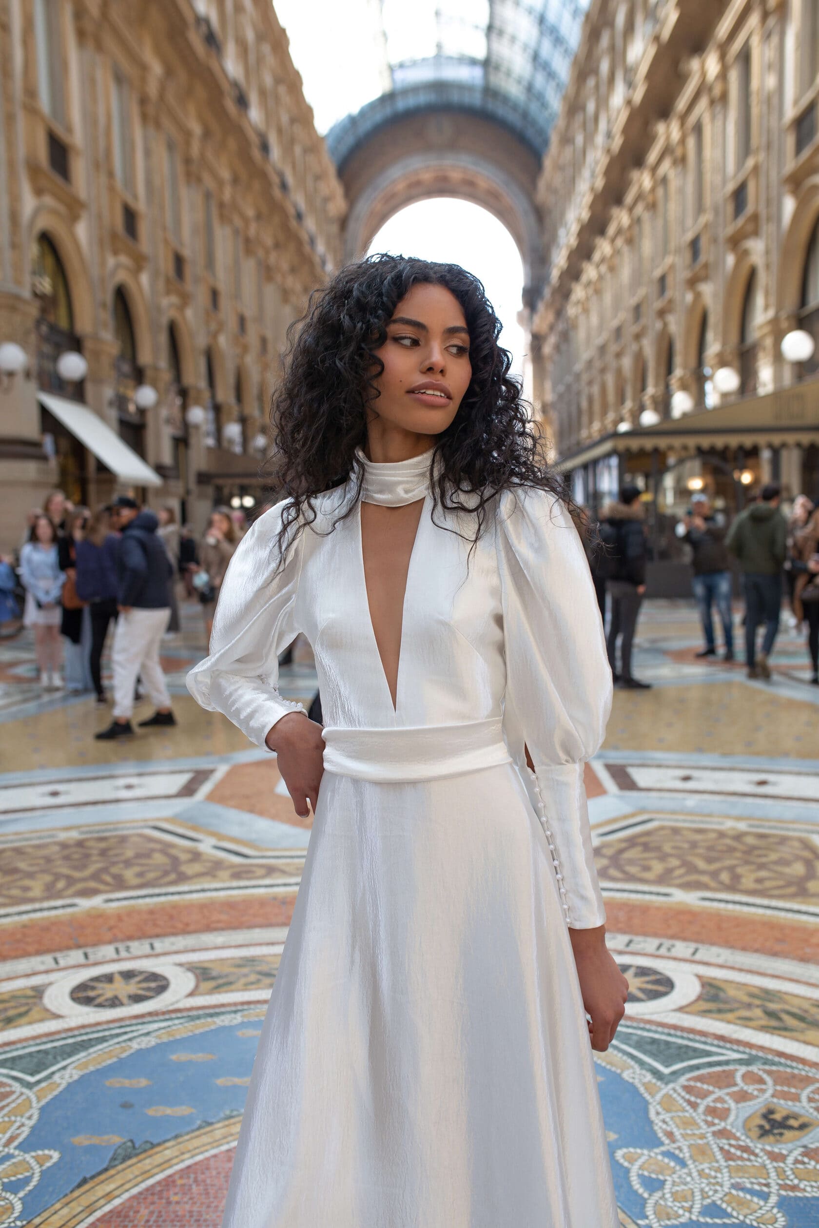 A-line corsetless dress.The bodice of the dress has a V-shaped deep neckline. The back of the bodice is open, with a wide rectangular neckline to the waist line. Stand-up collar with horizontal drape. Sleeves long with cuff. A-line skirt.