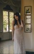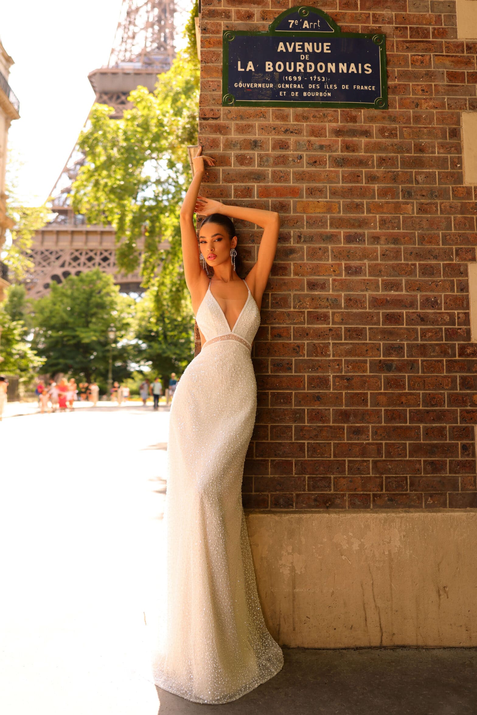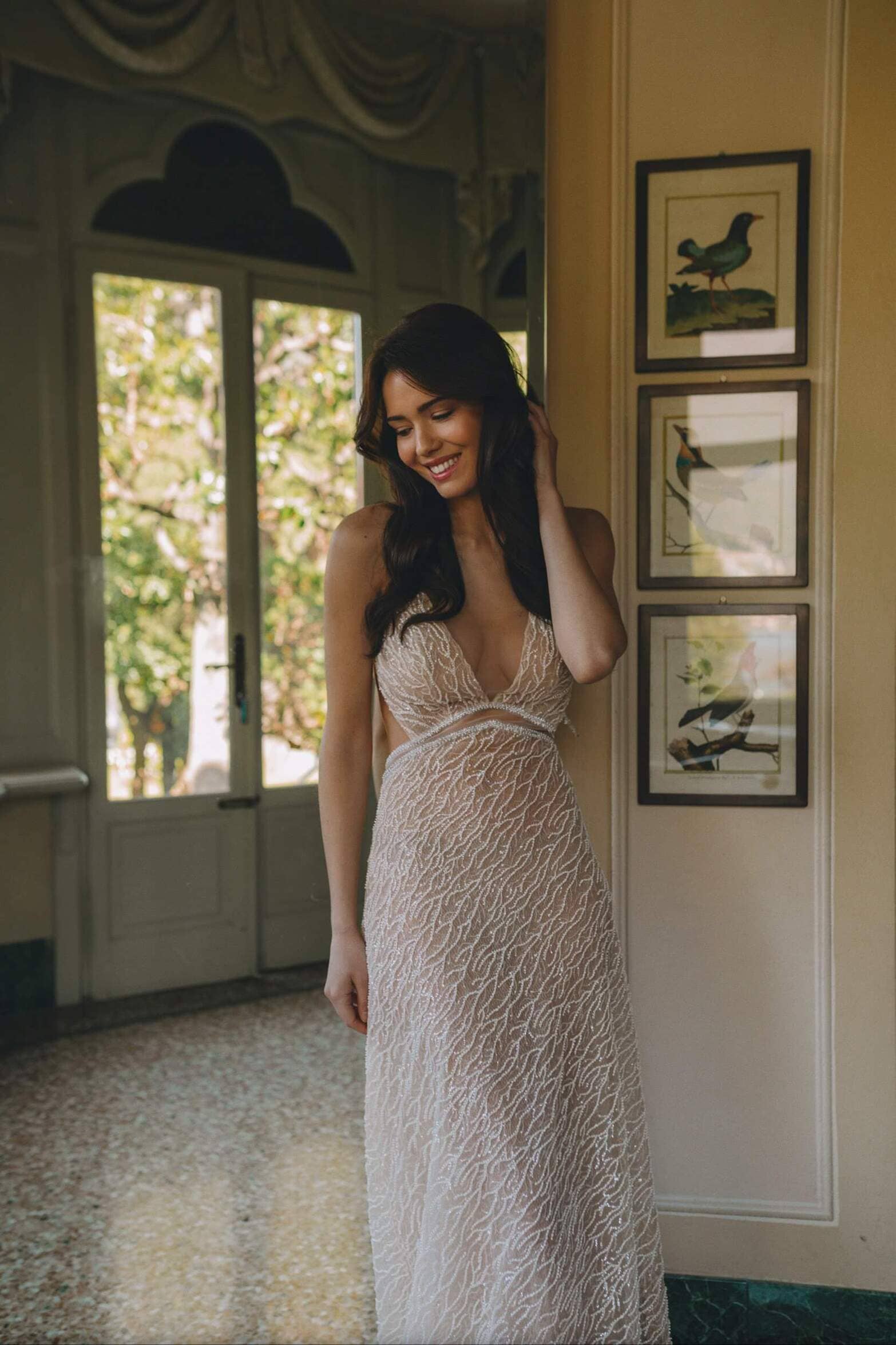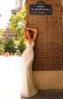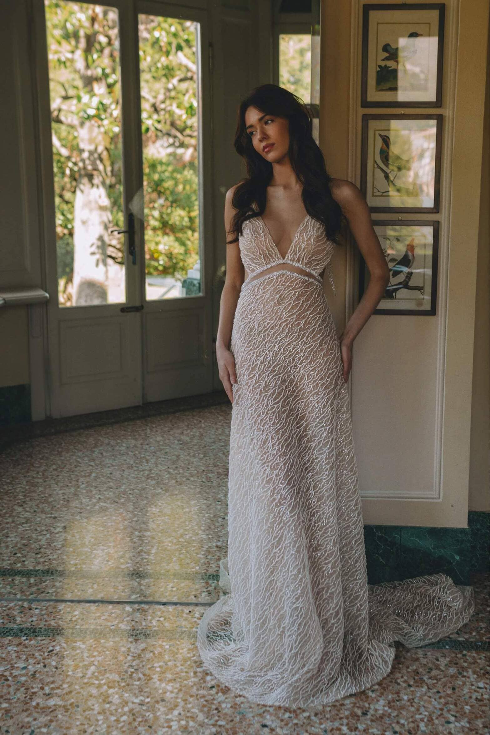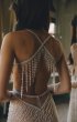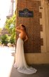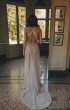 Fitted silhouette wedding gown is embroidered with beads and sequins. The back of the dress is decorated with straps embroidered with lace.
