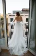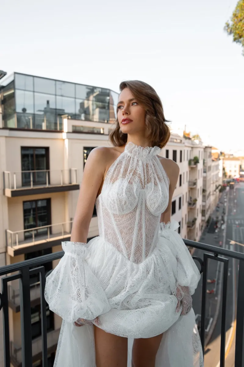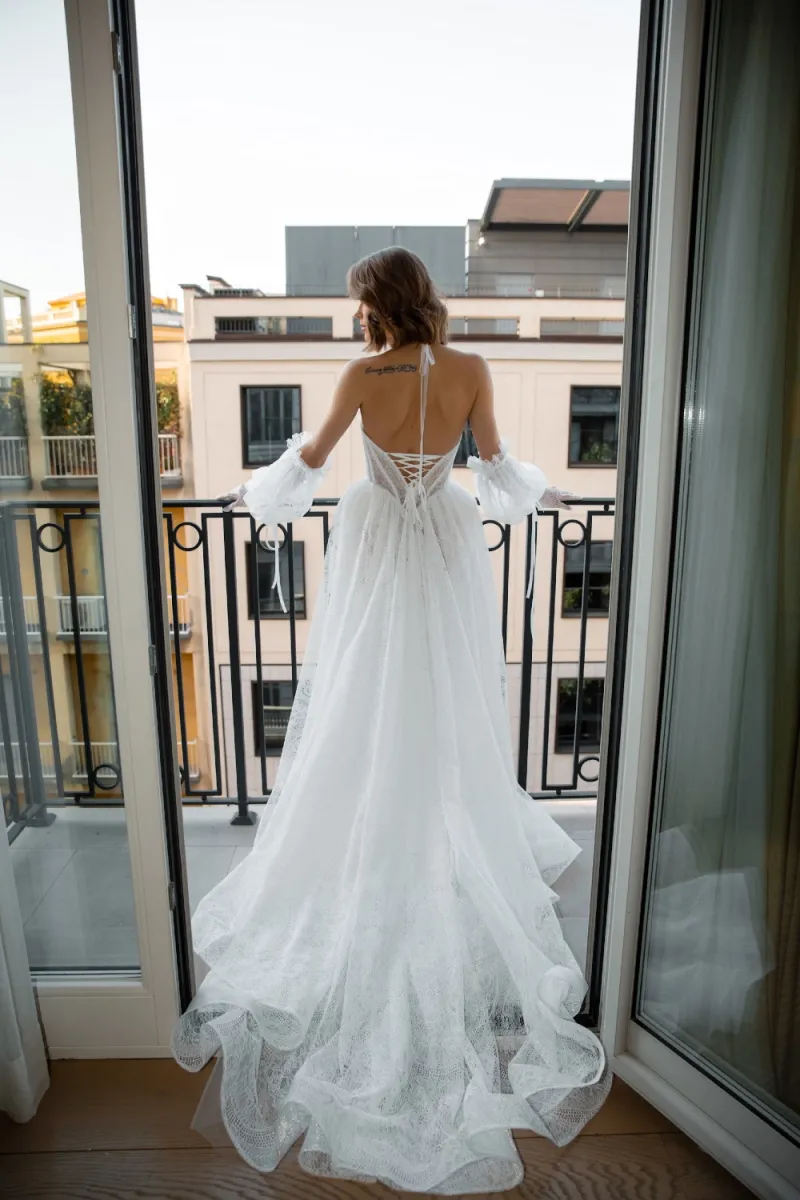 Princess-style wedding dress with a semi-sheer effect and a dropped waistline at the front and back. The bodice features molded cups, an open lace-up back, lace detailing, and a gathered yoke with nylon ties at the neck. A voluminous Chantilly skirt with a train is layered with shimmering tulle and a soft lace mini lining. Side volume is enhanced with horsehair inserts between layers; the skirt fastens with a hidden zipper at the back. Long glove-style sleeves with puffed shoulders and drawstring cuffs close with a side zipper; optional version includes a closed bodice with milk-toned lining.
