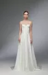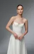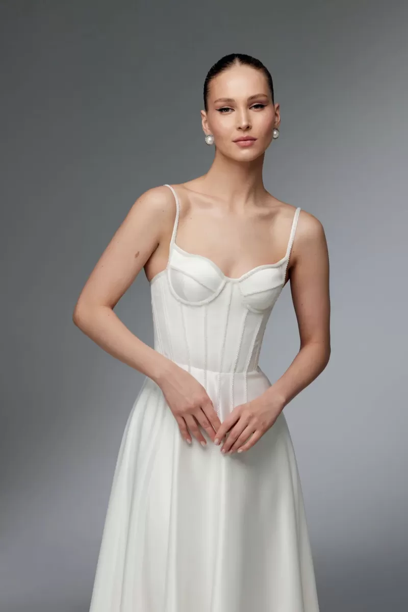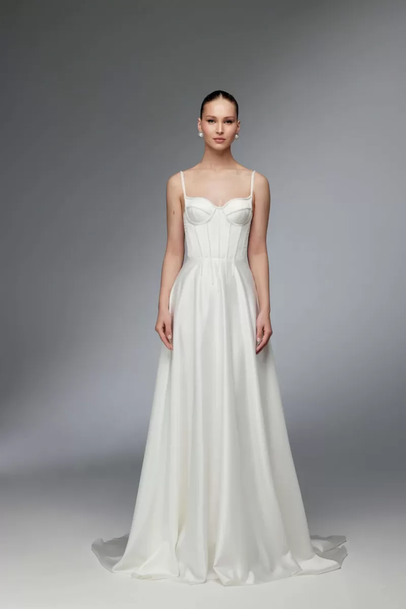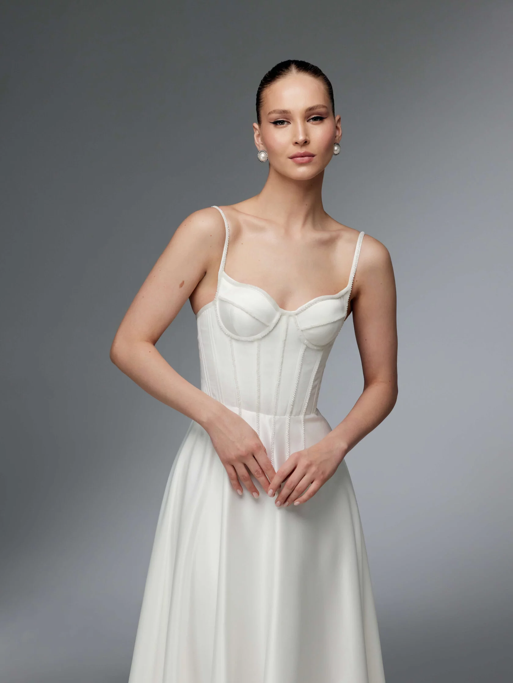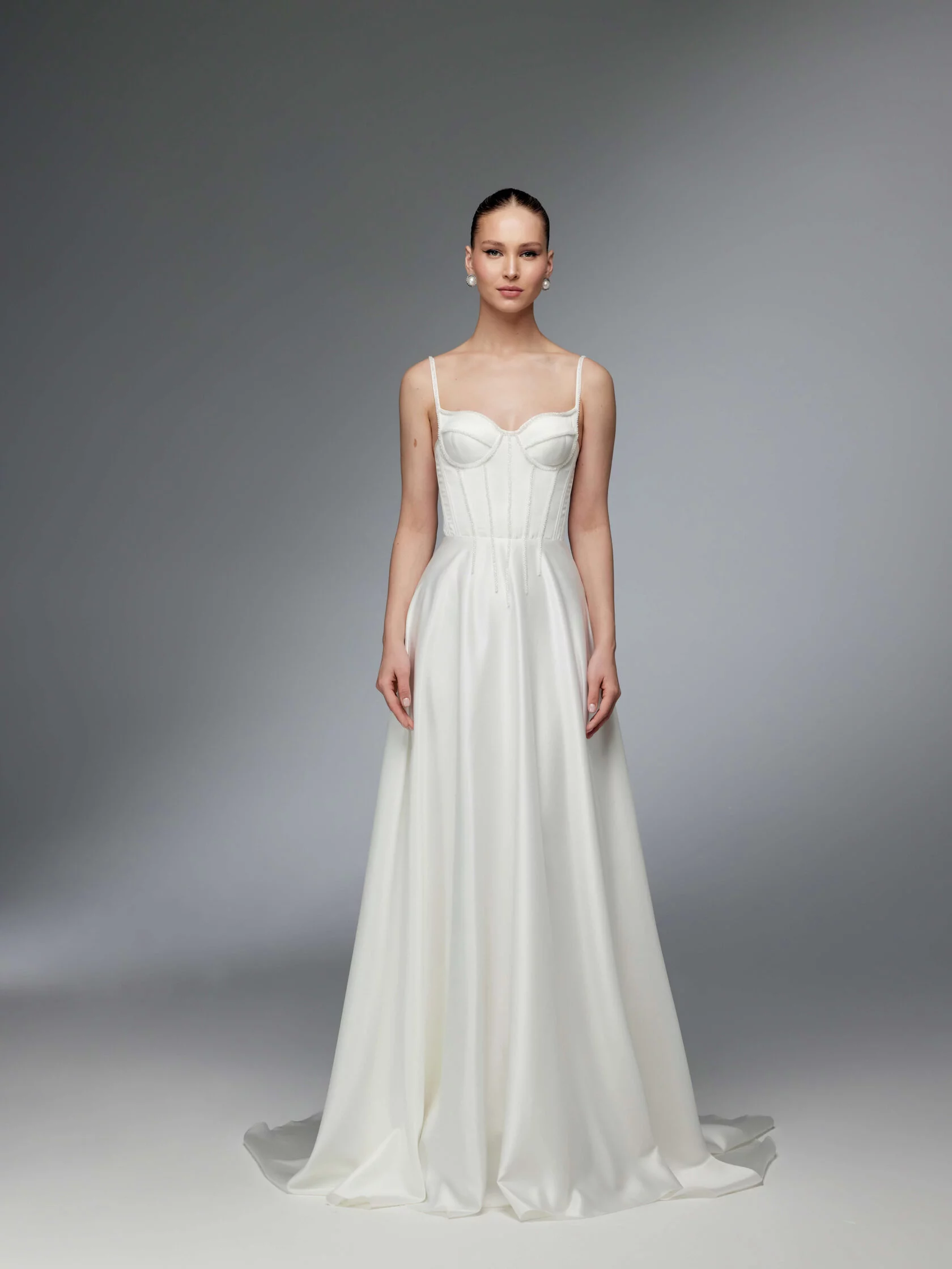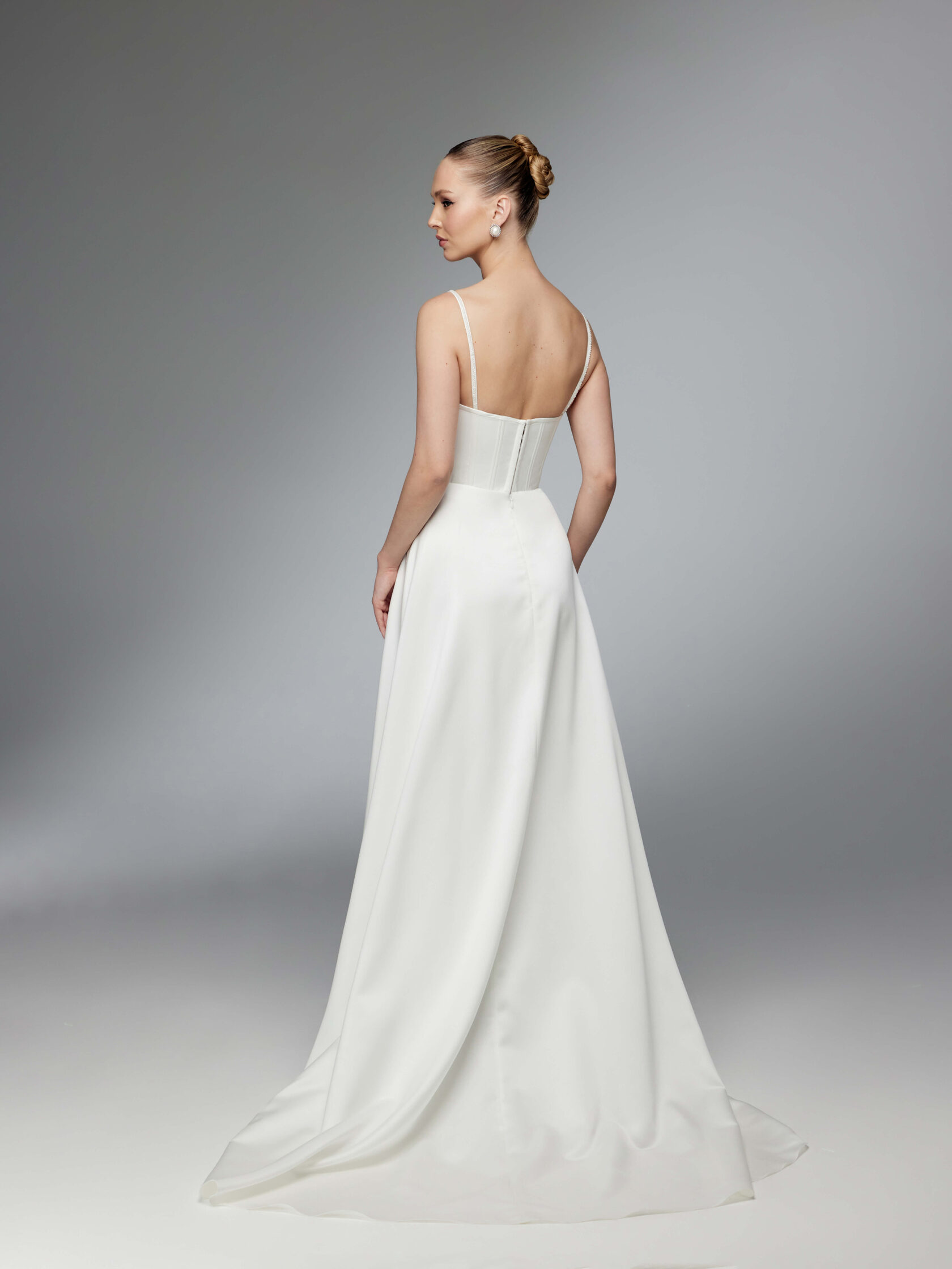 Classic satin wedding gown with a small train. The corset of the dress is decorated with beads.