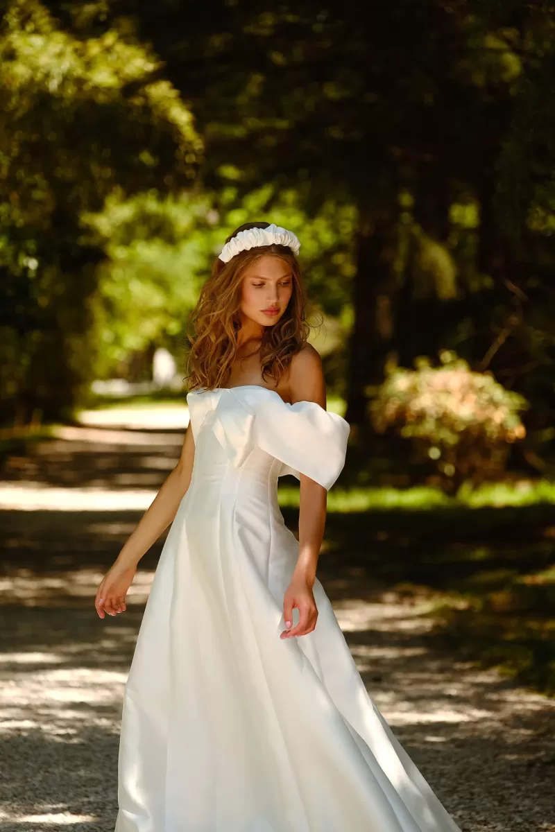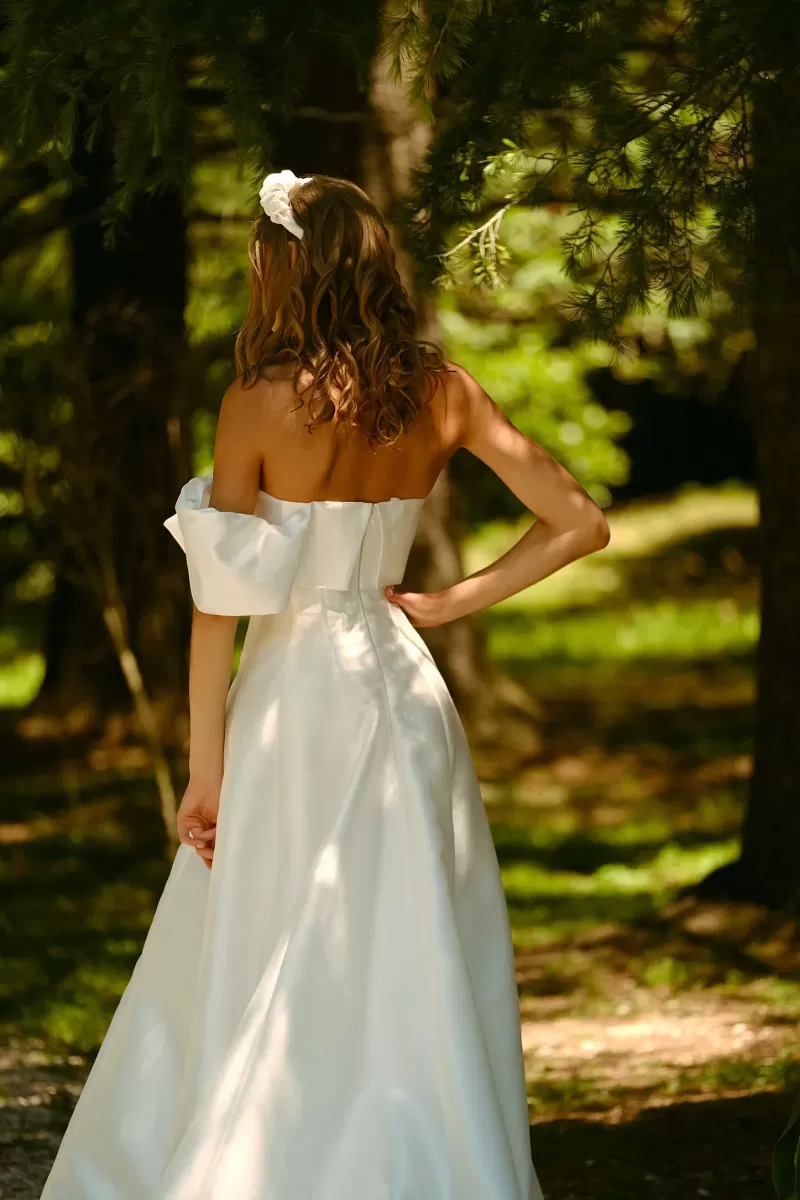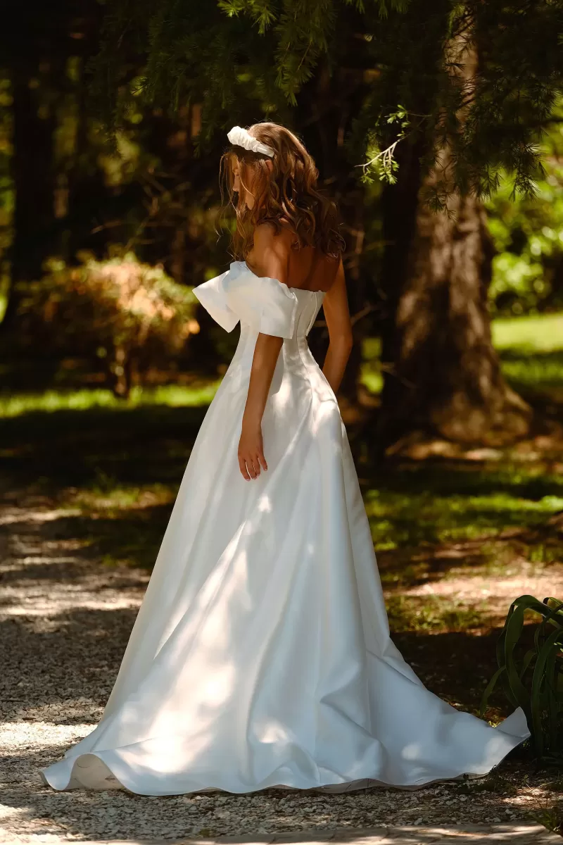 Princess wedding gown. The front of the dress has a bow with a strap on one shoulder. The feature of the dress is decorative seams along the skirt. The dress skirt has a train.